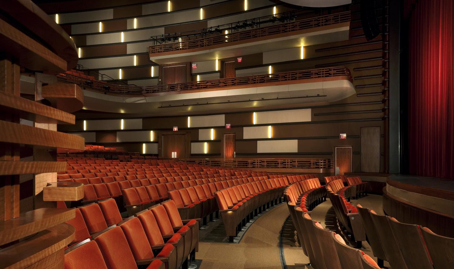 The other two theatres are 250 and 125 seats, are more subtle and subdued than the main theatre but designed with the same warmth in mind. These spaces are the backbone of the center providing special performances of very intimate, small-scale works. All patterns, profiles and detail development of features were created by the design firm.