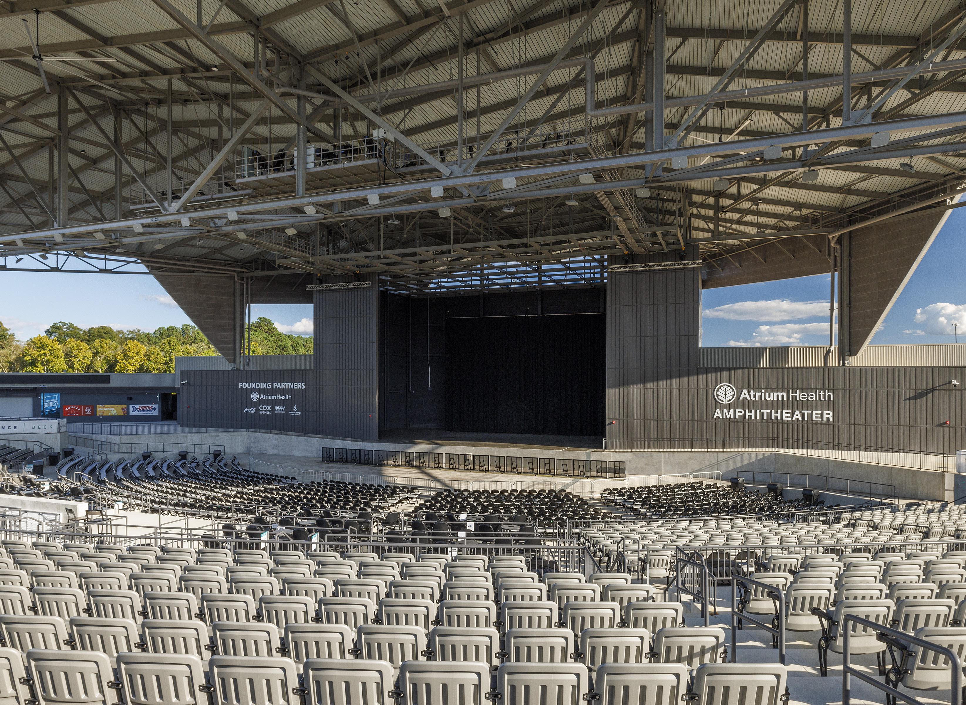 The new amphitheater remains an open-air venue with no roof over the audience area, allowing for a natural, outdoor concert experience. The stage, however, has a roof to protect performers and equipment from the elements. The seating is primarily a combination of loose and fixed seats and benches. Planned capacity is set between around 6,000 to 7,000 people. The amphitheater is built into the heart of downtown Raleigh, giving it a unique blend of cityscape views. It is designed to integrate with the nearby Raleigh Convention Center, which has a striking metallic shimmer that mirrors the modernity of the amphitheater.