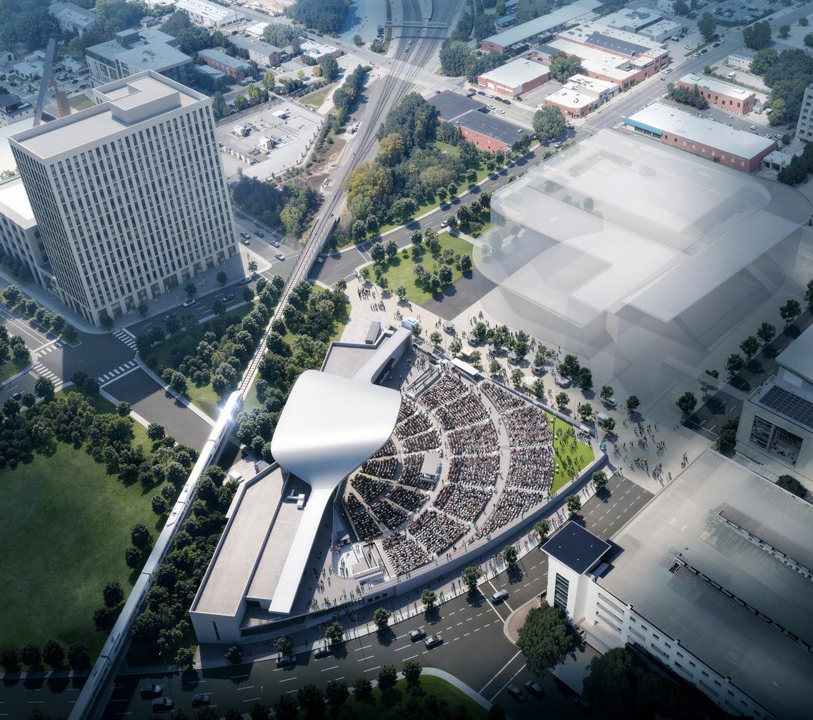 The City of Raleigh and the convention center authority are relocating the existing Red Hat Amphitheater, coupling its redevelopment with an expansion to the existing Raleigh Convention Center. The new location remains downtown and offers a mix of urban aesthetics and functional design for live performances hosted primarily by Live Nation.