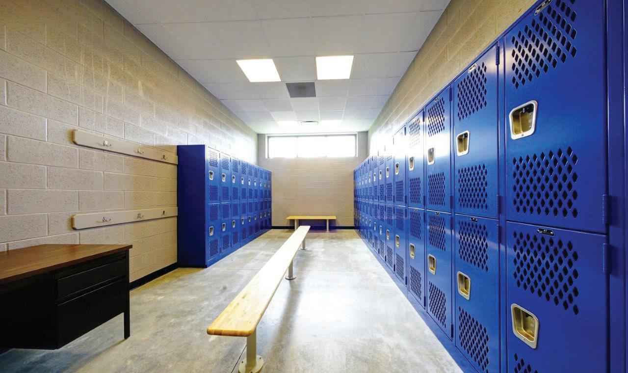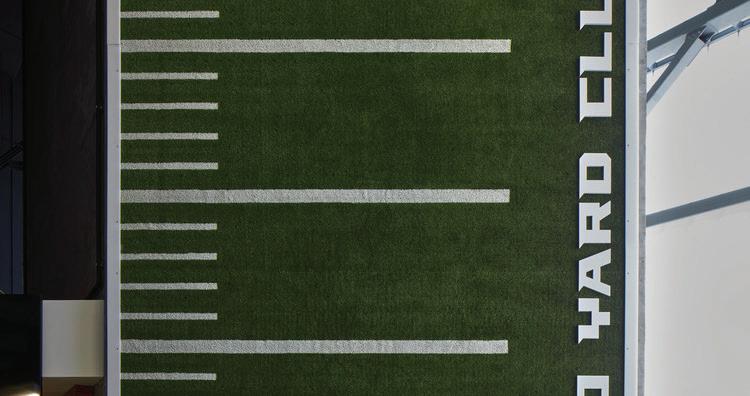 The client commissioned the designers to create a custom facility from the ground up, with avant-garde amenities to make this training facility much more than a locker room, but an inspirational, united wellness and fitness center that would attract future talent. The training gym was designed to be interconnected, featuring bestin-class equipment, a garage door that opens to the fields, and a second level observation window. It is adjoined by a series of rooms dedicated to on-site sports medicine, including a physiotherapy room with exam tables, a hydrotherapy room, and a sauna. The first team’s locker room is located at the heart of the facility, giving the players a communal place to prepare for training. The upper level dining area has an open kitchen to train the players in how and what to cook and eat, and long communal tables allow the team to eat together and spend time together off of the field. Connecting these player spaces to the corporate office spaces in the facility is an open, two-story lobby with full windows facing the fields which doubles as a private event space and reinforces the focus on providing a hospitality-driven atmosphere that encourages gathering, conversation, team bonding, and community participation.