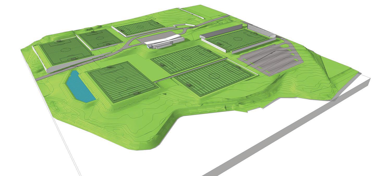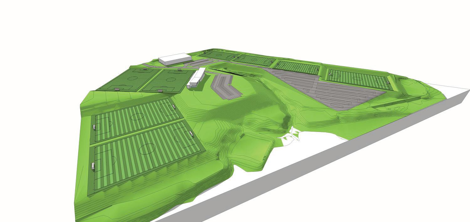 The campus is organized into three zones. The sports complex is located on the West end of the site. The supporting mixed-use development is located on the east side of the site. This ‘Sports City’ is an abundant collection of retail, commercial office, residential development. The sports complex and mixed-use development are then stitched together with a shared recreational park we call ‘Sports Valley.’