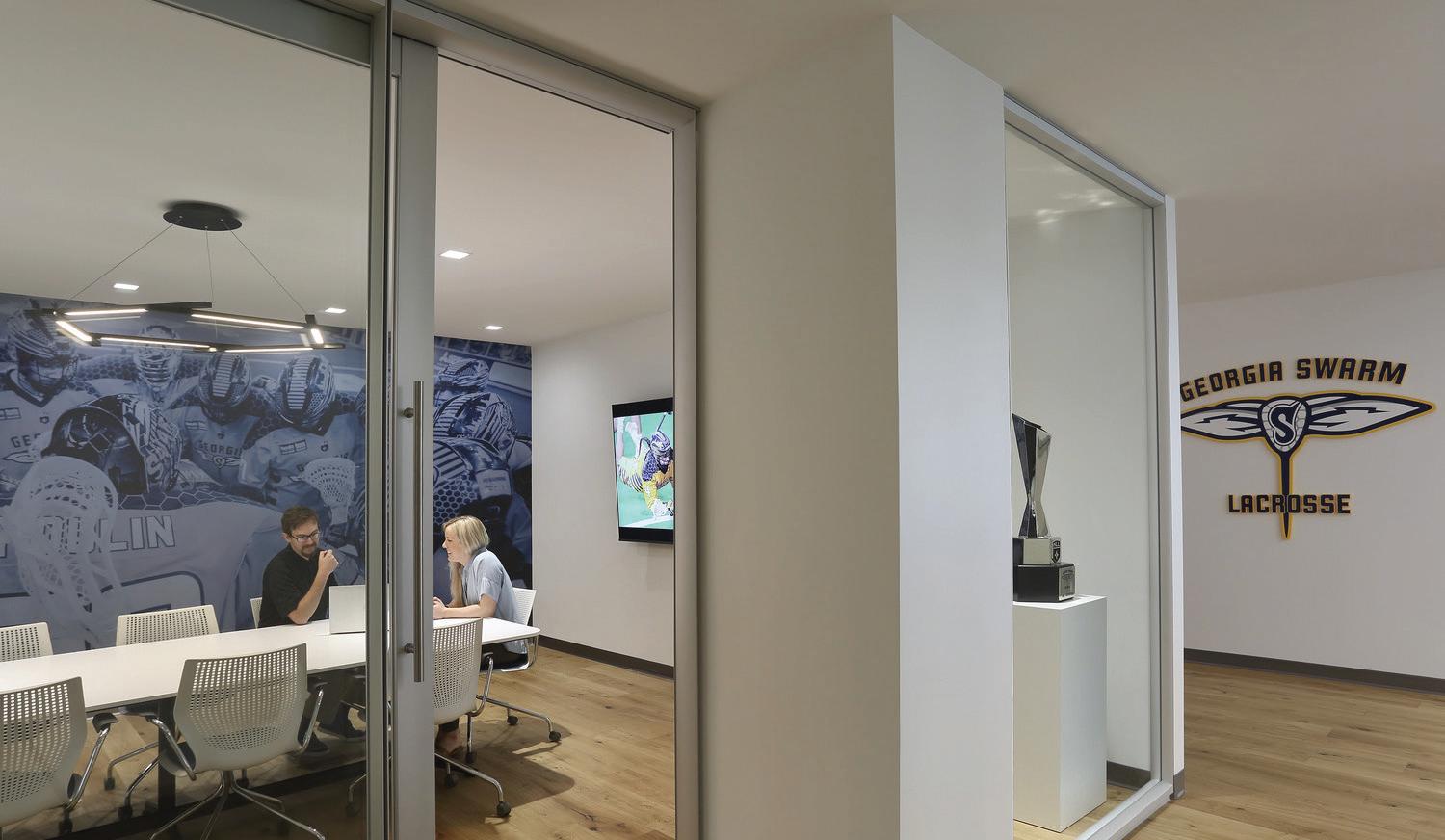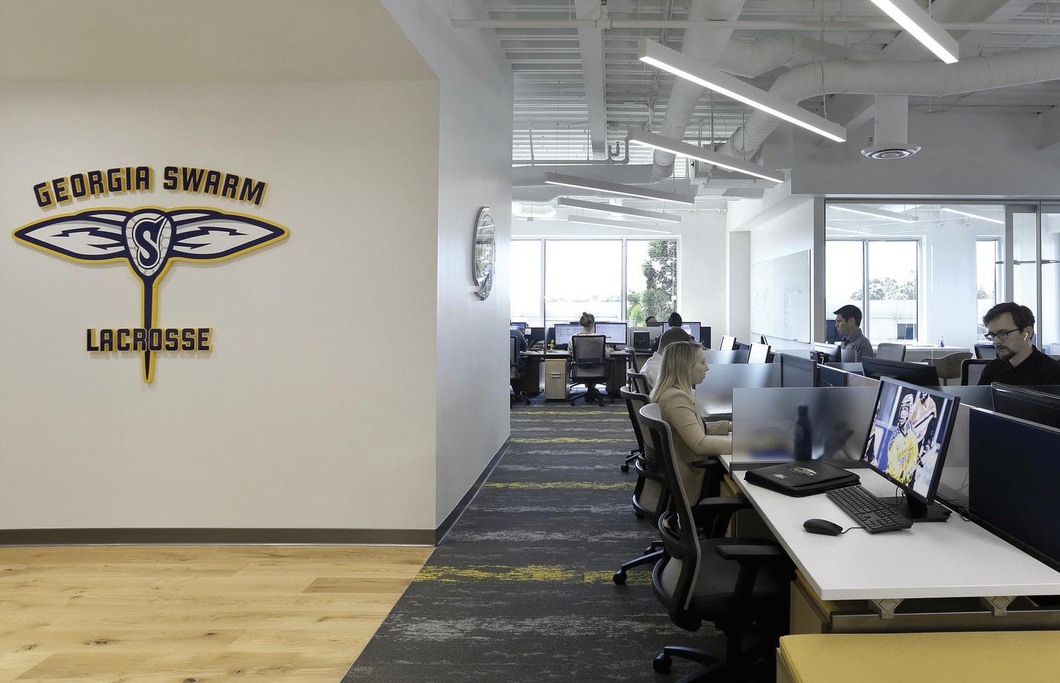 The 2017 NLL World Champion, Georgia Swarm, sought a new, state-of-the-art office that would enhance the franchise’s brand and ethos, and expand their organizational footprint. The goal was for the new headquarters to match the collaborative culture of the team, and give employees an energizing work environment that encourages communication and teamwork. The office complex features an open floor plan that showcases their brand, and embodies their core values of teamwork and their commitment to excellence and professionalism as a league leading, championship franchise. Their sales force, graphics, marketing, coaches and players can now operate under one roof, and the space provides a welcoming environment that will foster stronger relationship with partners and stakeholders.