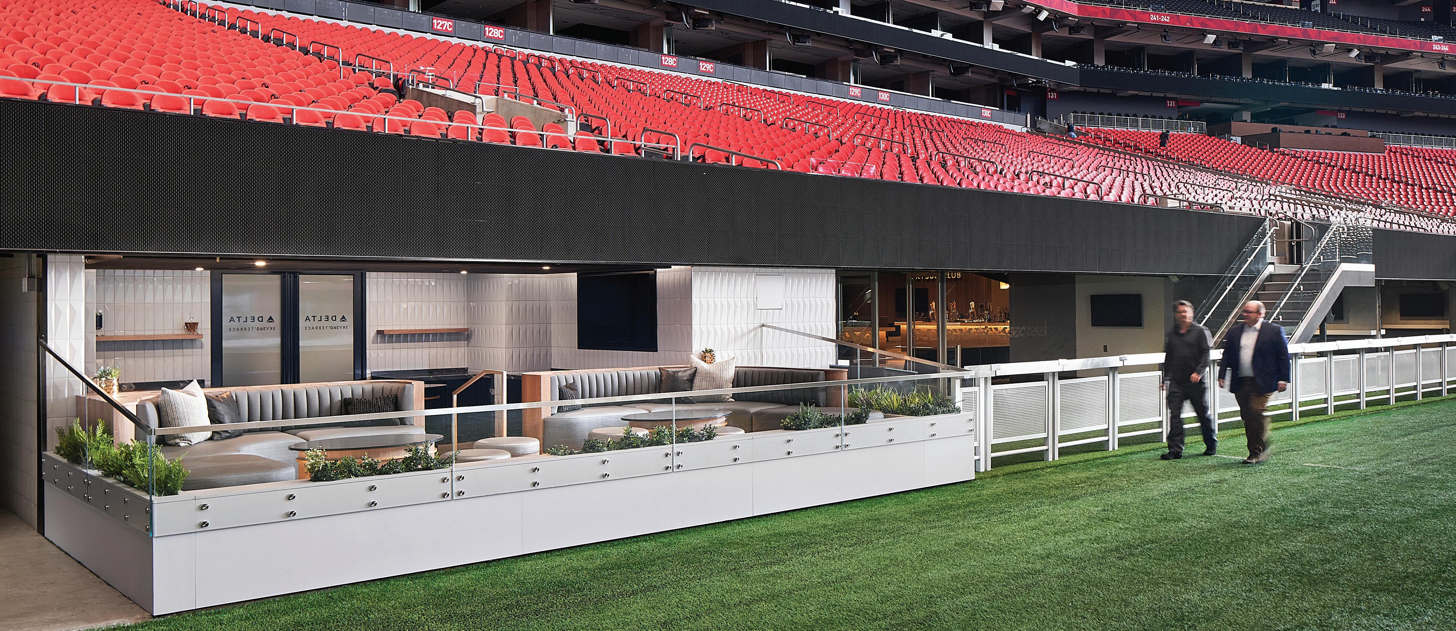In the exterior corners of the on-field club patios, fans will now be able to rent one of eight private areas accommodating between 6 and 16 people for all Mercedes-Benz Stadium events. These new on-field premium spaces complement the existing premium clubs and suite space in Mercedes-Benz Stadium. Located in the closest proximity to the field, this area is equipped with lounge seating, an included upscale menu and a personal attendant.