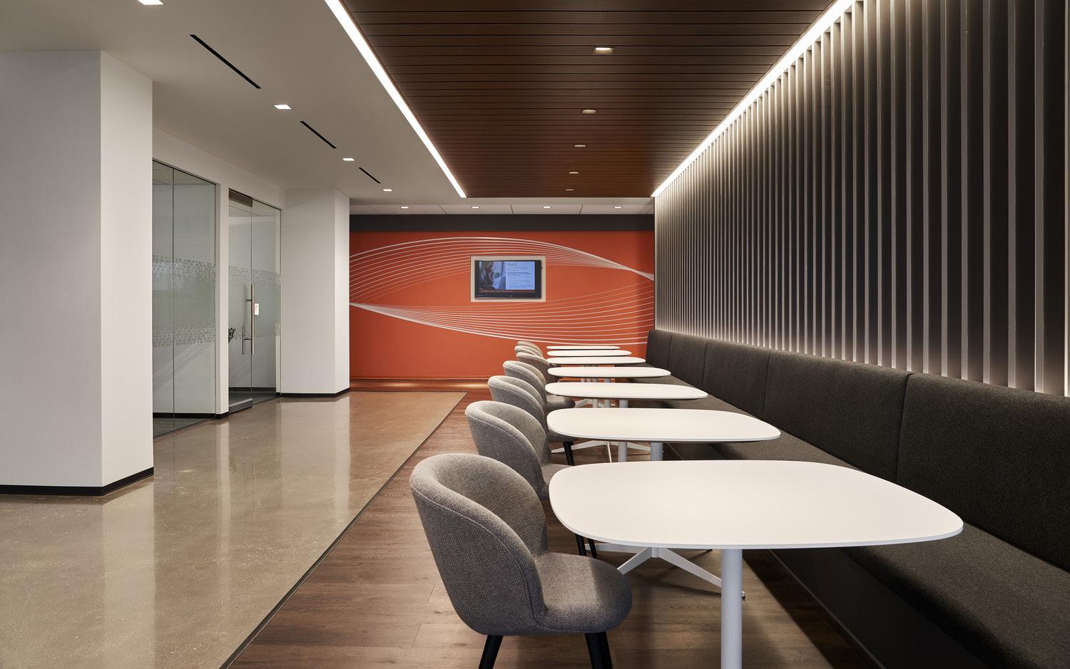 Highlighting the company’s collaborative culture, a variety of collaboration opportunities adjacent to the workstations were incorporated throughout. Seeking to showcase its unique corporate identity, the reimagined lobby creates a branded, open environment that leads into a client presentation space.