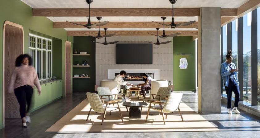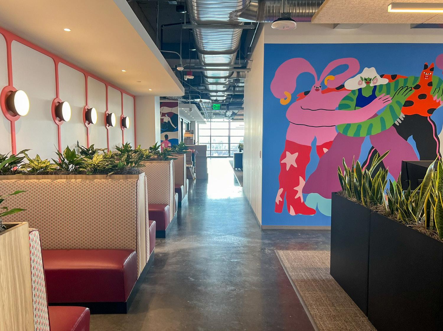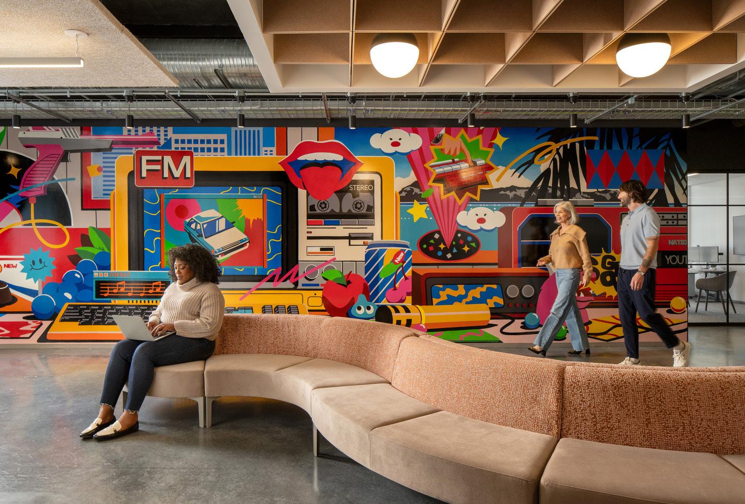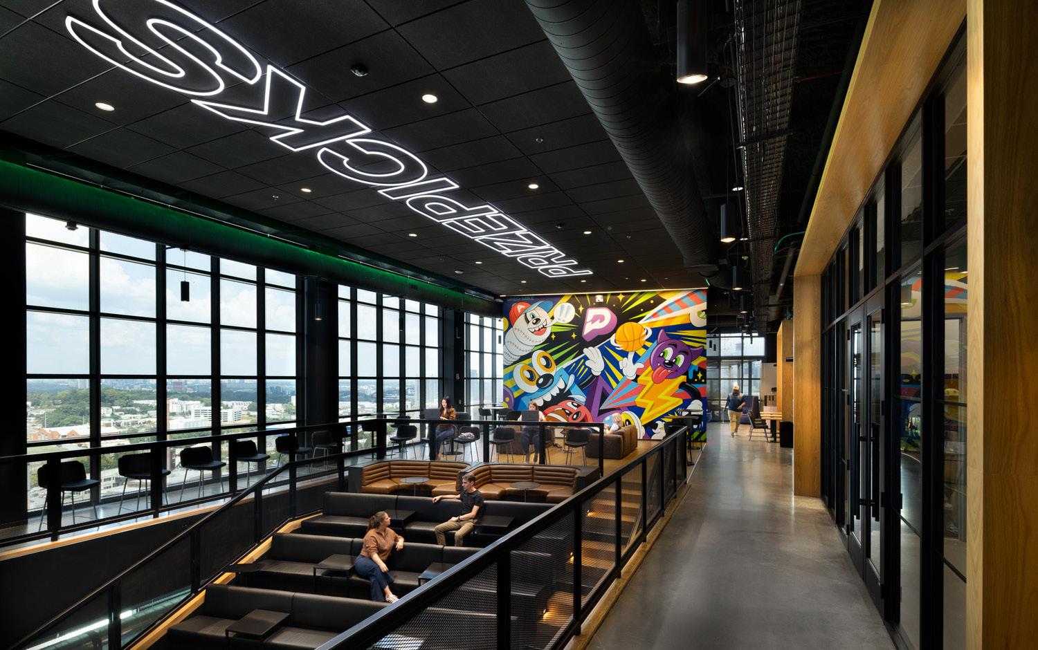 The new Intuit-Mailchimp Atlanta headquarters redefines the office space as a vibrant hub that beckons employees back to the workplace, fostering collaboration and innovation. This space creates a dynamic office space that provides a best-in-class environment, amenities, and technology to enable employees to do the best work of their lives in a space designed for hybrid work. The goal was to create a place where employees would want to spend time collaborating with each other to propel creativity and innovation. The office design mimics a city filled with different neighborhoods, each with its own unique culture, that flow together for one unified, diverse entity.