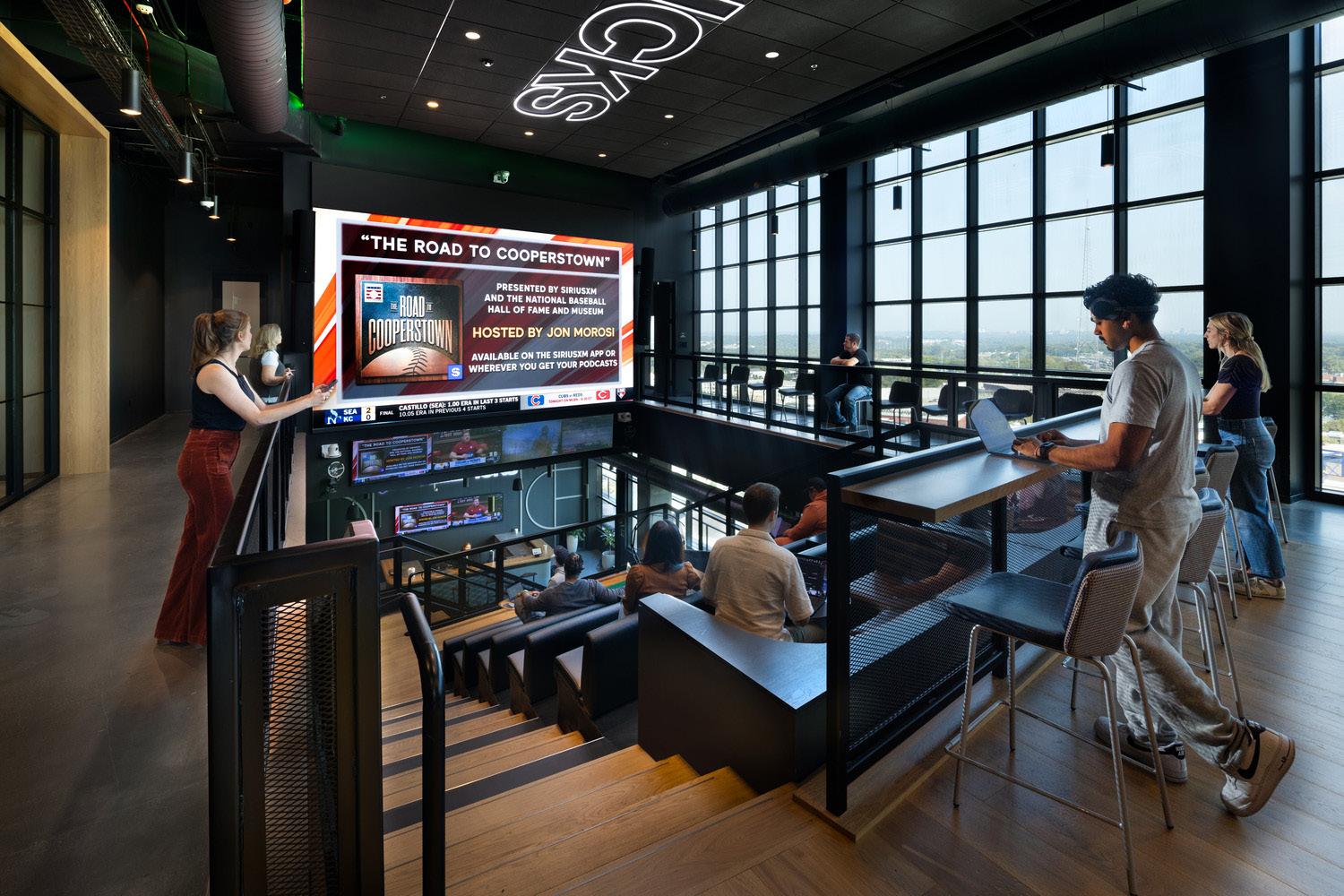 The company’s desire to foster a strong sense of community and connection is reflected in the design of the headquarters. From the moment you step into the elevator lobby, the brand experience begins. Guests and employees are immediately transported into a ‘hype’ tunnel, a unique feature that sets the tone for the entire space. This tunnel pulses with energy, reacting to the activity and energy levels in the adjacent ‘Lab’—the all-hands space at the heart of the headquarters. This immersive experience isn’t just about aesthetic appeal; it’s a deliberate way to bring the company’s culture to life, allowing employees and visitors to feel the vibrant pulse of innovation, collaboration, and excitement as soon as they enter the building. The ‘Lab’ can transform to accommodate various events, from product launches to team-building activities to live-streamed sporting events, reflecting the company’s commitment to providing its employees with both a productive and vibrant work environment.