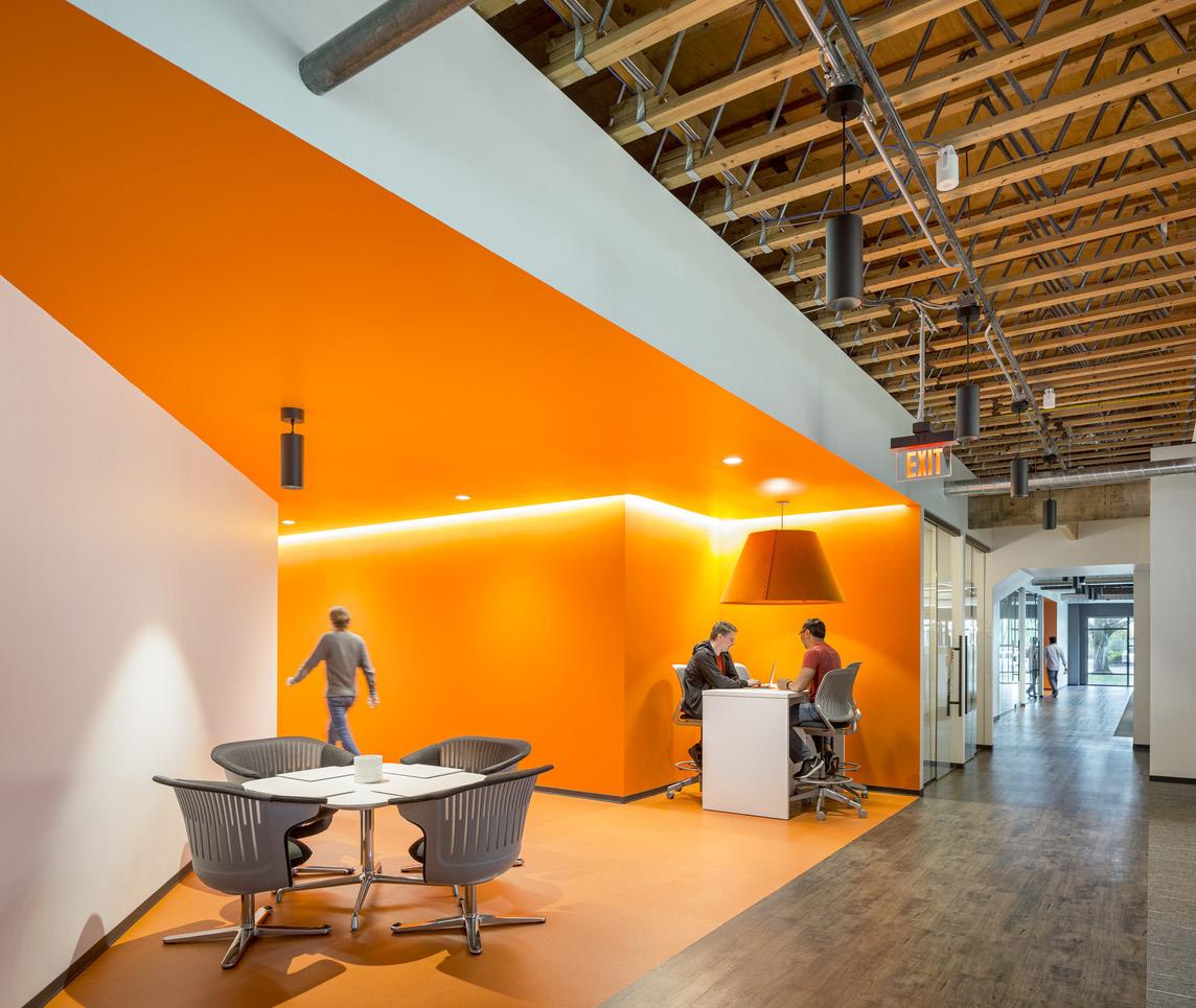 To build brand recognition, the designers integrated the orange color and the square ‘Proof Point’ from the client’s logo, into every aspect of the design. These elements were incorporated tastefully and thoughtfully in all areas of the space to complete a cohesive branding