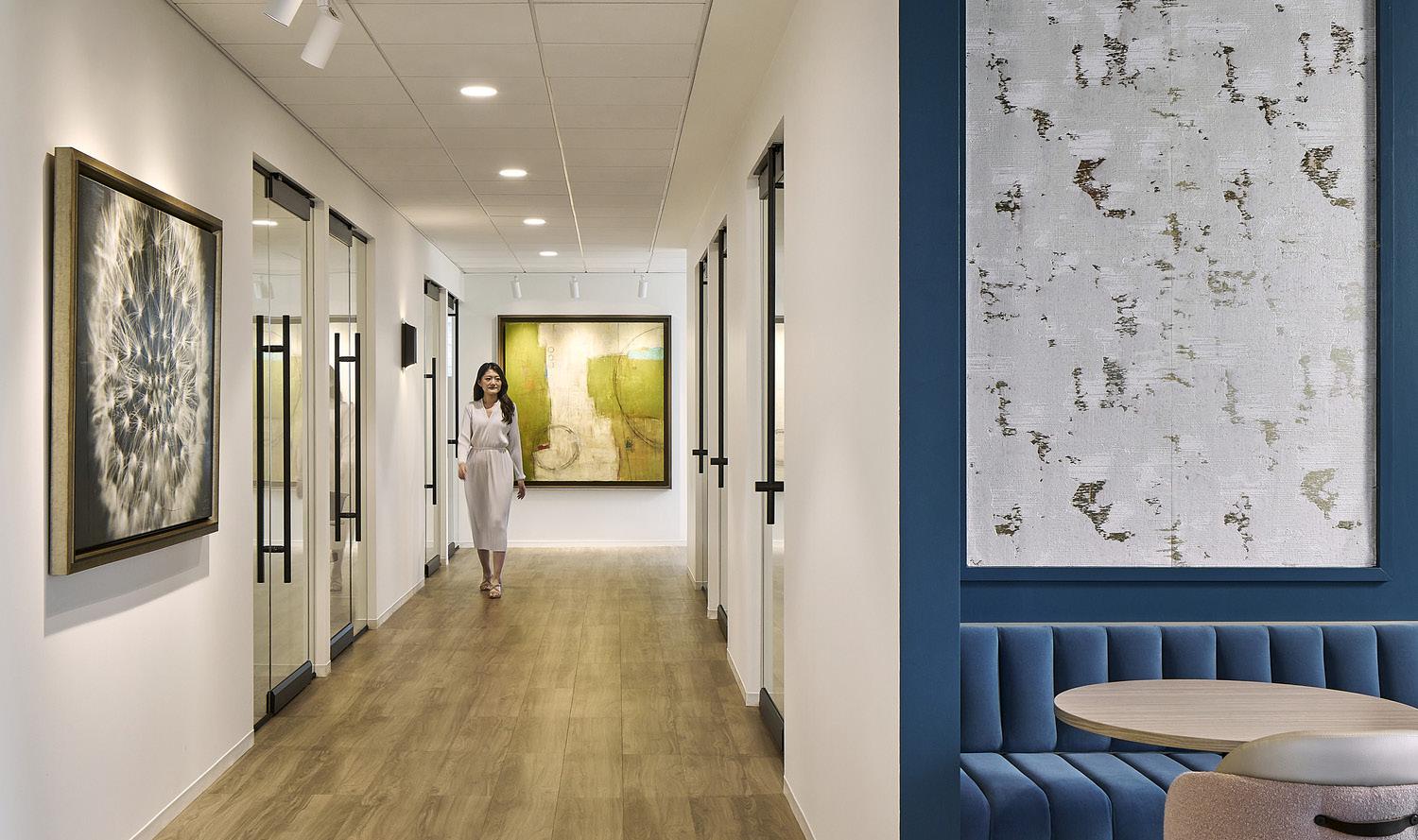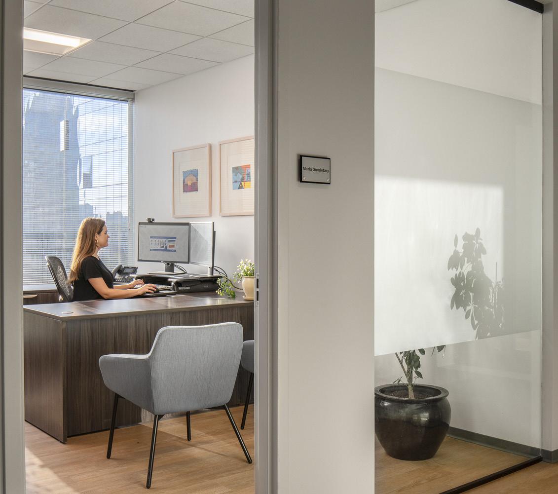The team also pursued lofty LEED and WELL certification goals, with the aim of making the new office a space that promotes wellness and wellbeing. It was important that everything from policy and operations to the physical environment enable every person in the firm to thrive. Another key challenge was a very tight budget and schedule under challenging construction conditions, fraught with high inflation and long lead times.