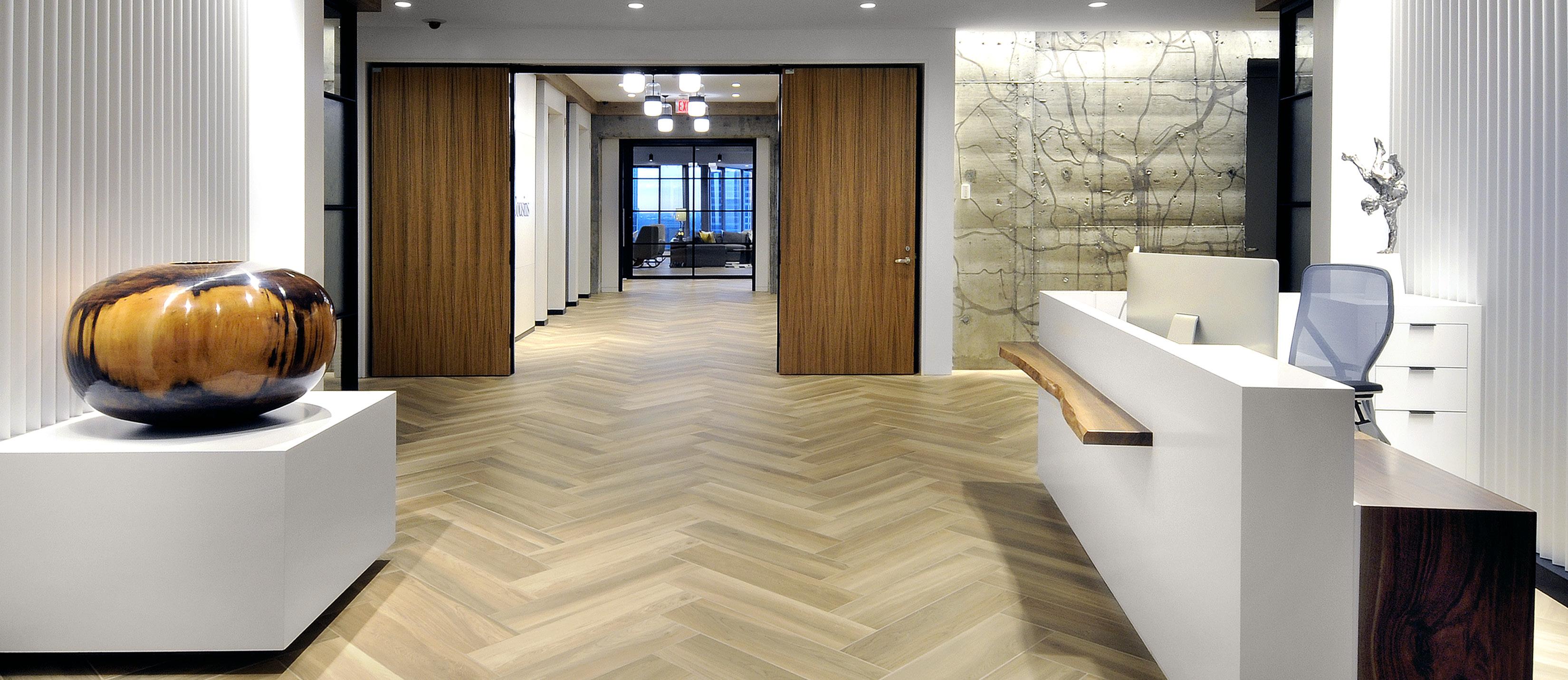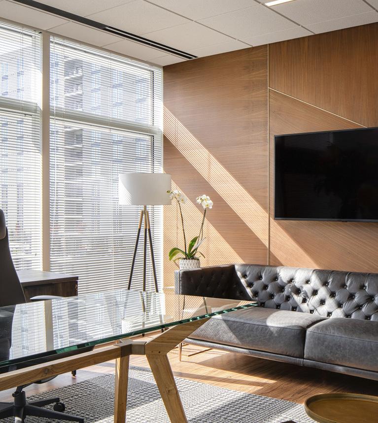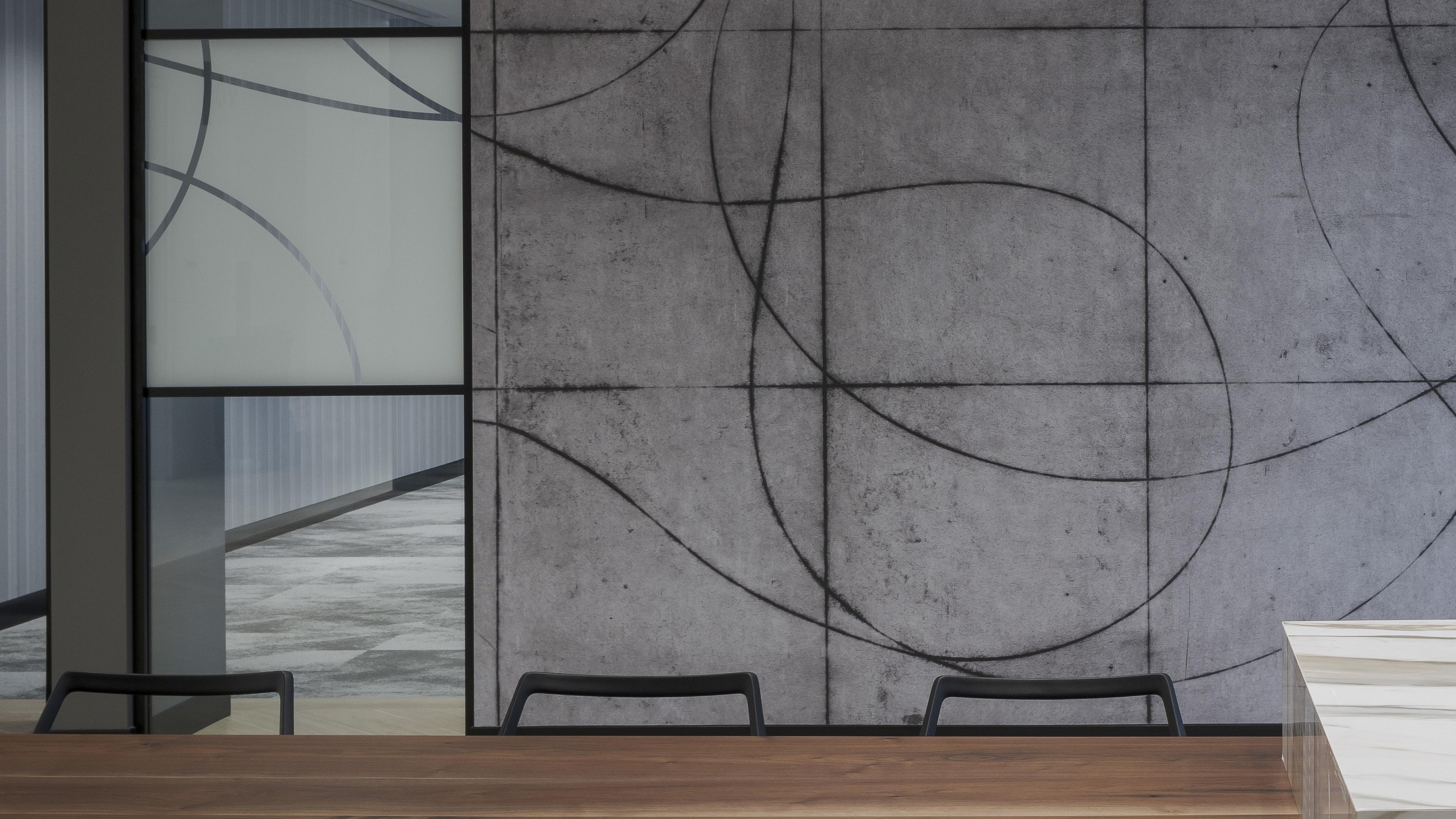 This major design element then unified departments within the company which were previously separated and isolated while also creating views of the entire city and letting daylight penetrate through the entire space. The design approach for the overall aesthetic of the office, was to treat the space more like a showroom where the client can showcase their profession. The use of building materials like concrete, wood, metal and glass were used in a refined way that it then created a tailored industrial aesthetic.