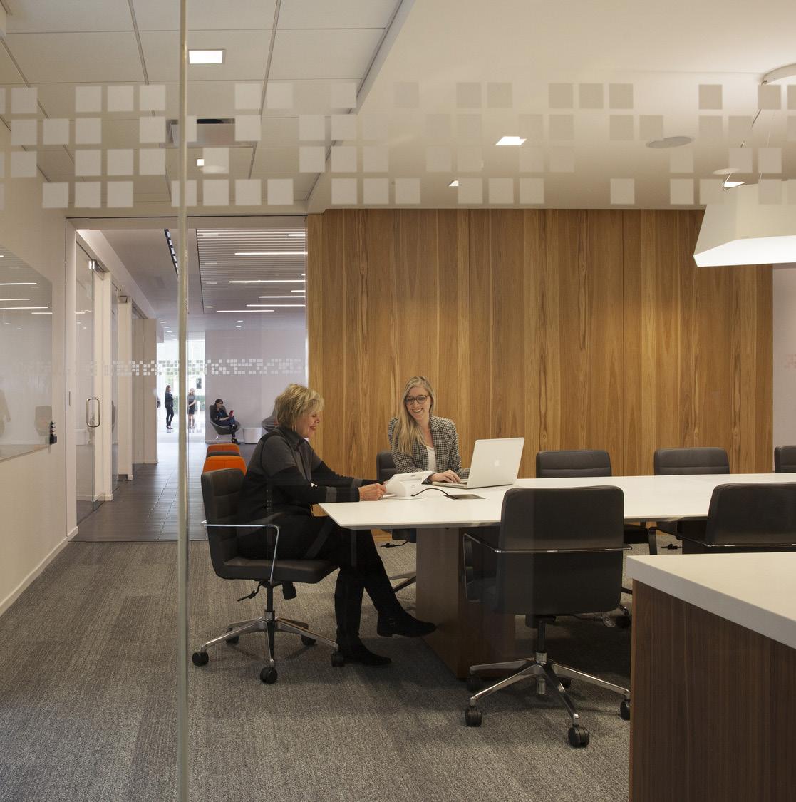 The design team successfully achieved a high-end looking, strategic space by using premium products in selective locations, mixing less expensive materials and providing the warm, inviting space with unique accents and custom, colourful graphic wall coverings. For example, real, premium woodwork is integrated into some areas, balanced with wood-look wall coverings and faux-wood LVT on the floor in some areas, with white marble tile flooring in others. High performance ceiling cloud is hung on a limited portion in the open work station area, while the major portion of the ceiling remains exposed to structural ceiling, maximizing the volume of space.
