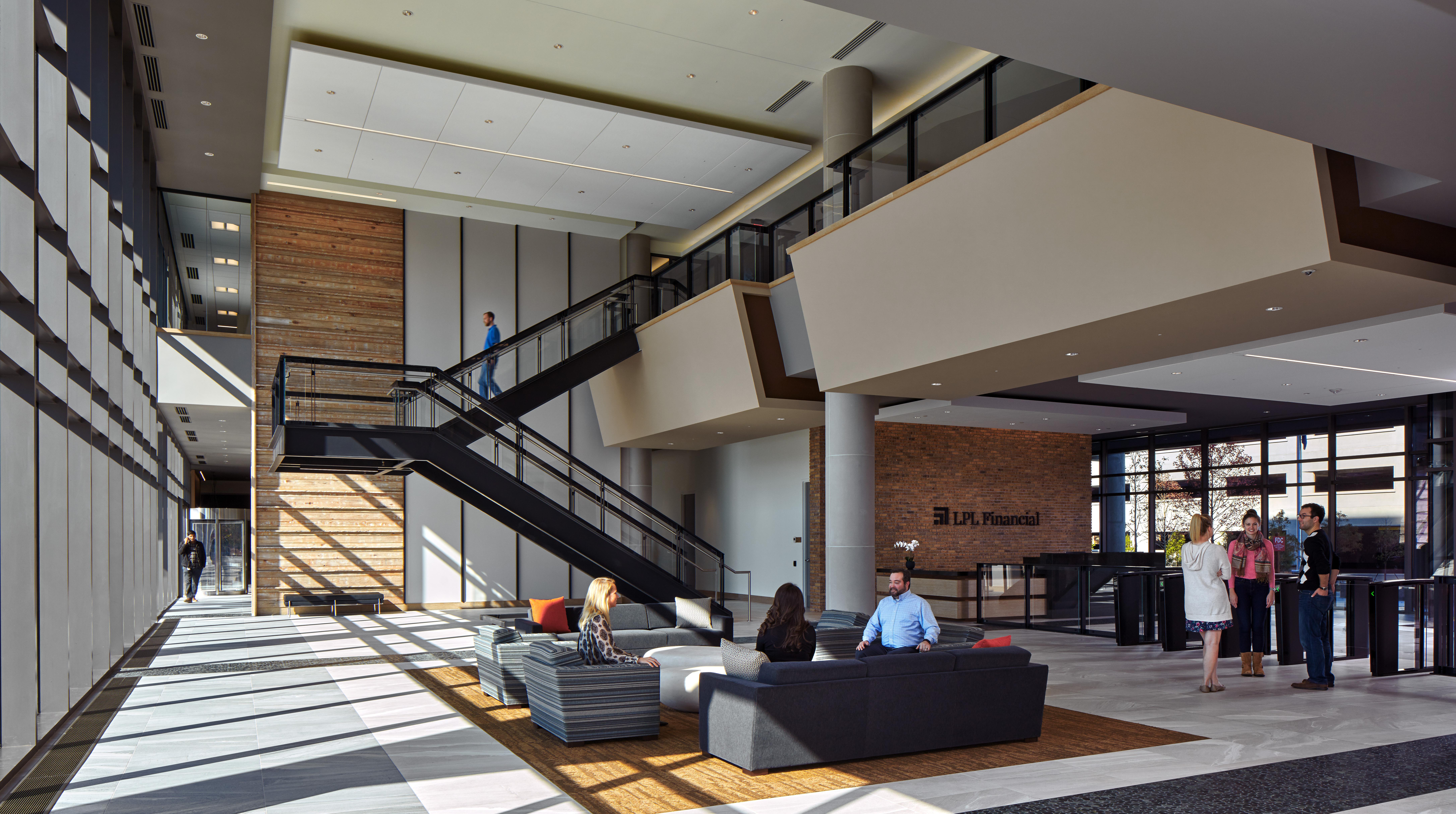LPL’s new campus is a workplace reimagined to celebrate natural light, community and the innovation that happens when people interact. Staff wellbeing was a priority in this two-building campus designed with unique offset cores to maximize exterior views to the woods. LPL’s staff congregates in a community garden, trails, outdoor meeting space and a café with both indoor and outdoor seating. Floors are interconnected with light filled staircases which are preferred over elevators and provide another opportunity to interact with others. The design is net zero H2O.