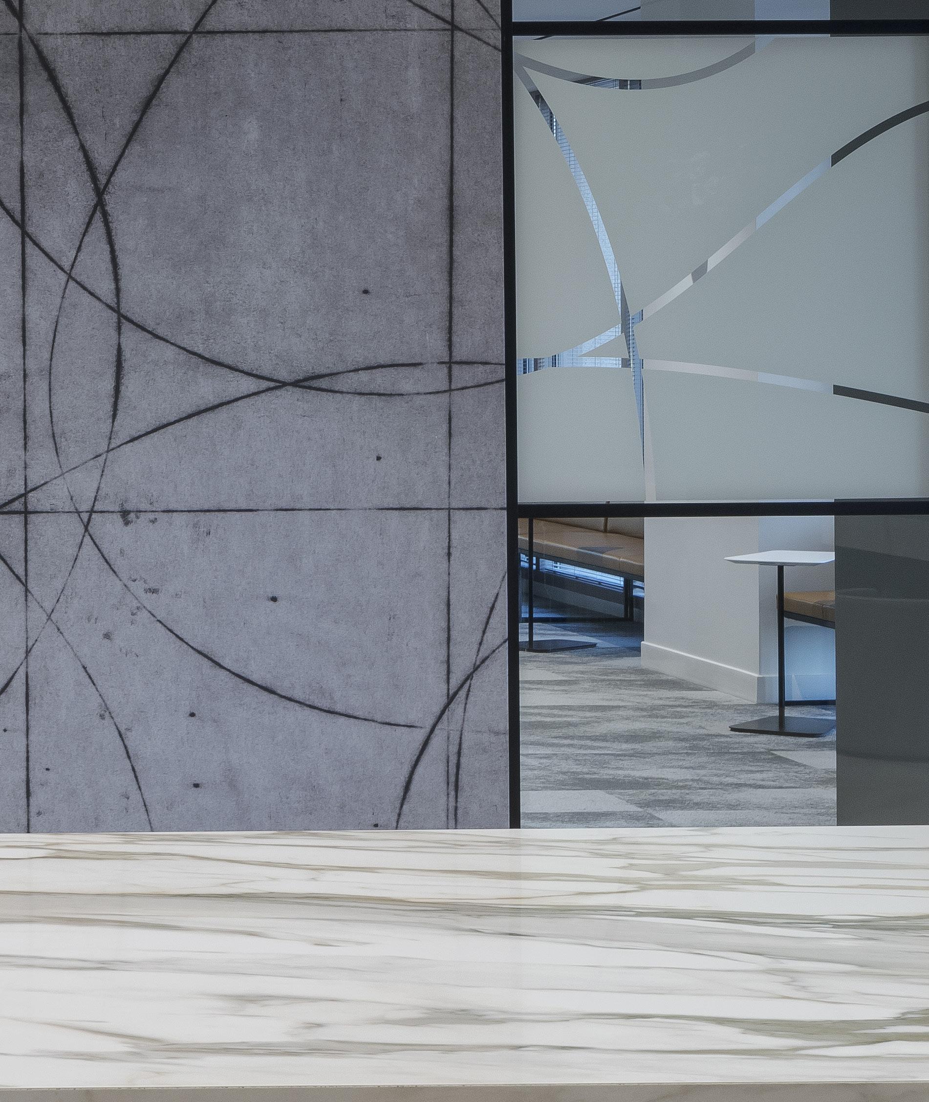 Responding to the challenge of representing distinct branding from three different companies in one space, the designers employed a custom graphic solution that combines a dynamic mixture of the suite of brand colours, accented with wood and gold for a neutral thread that creates an upgraded look.