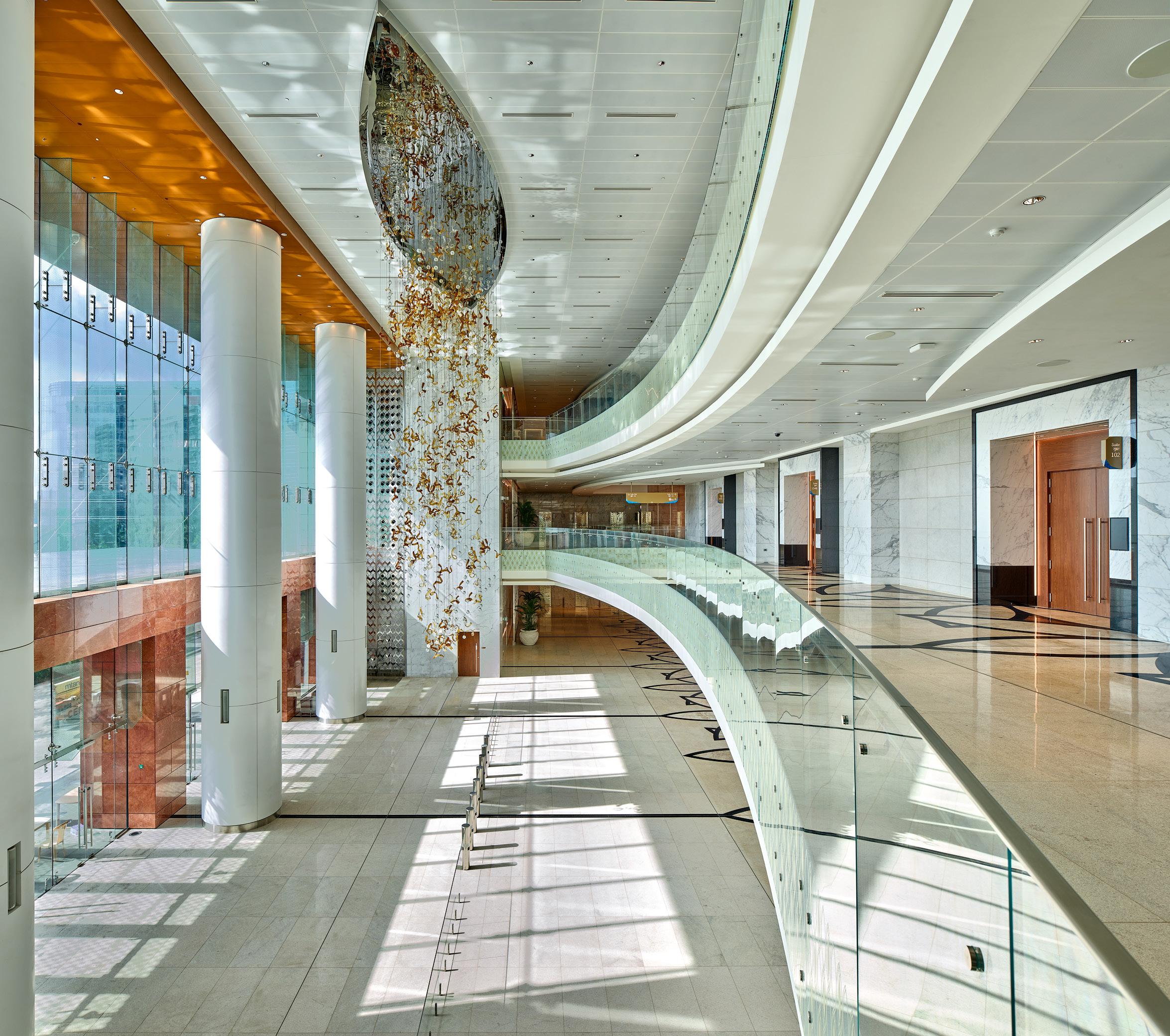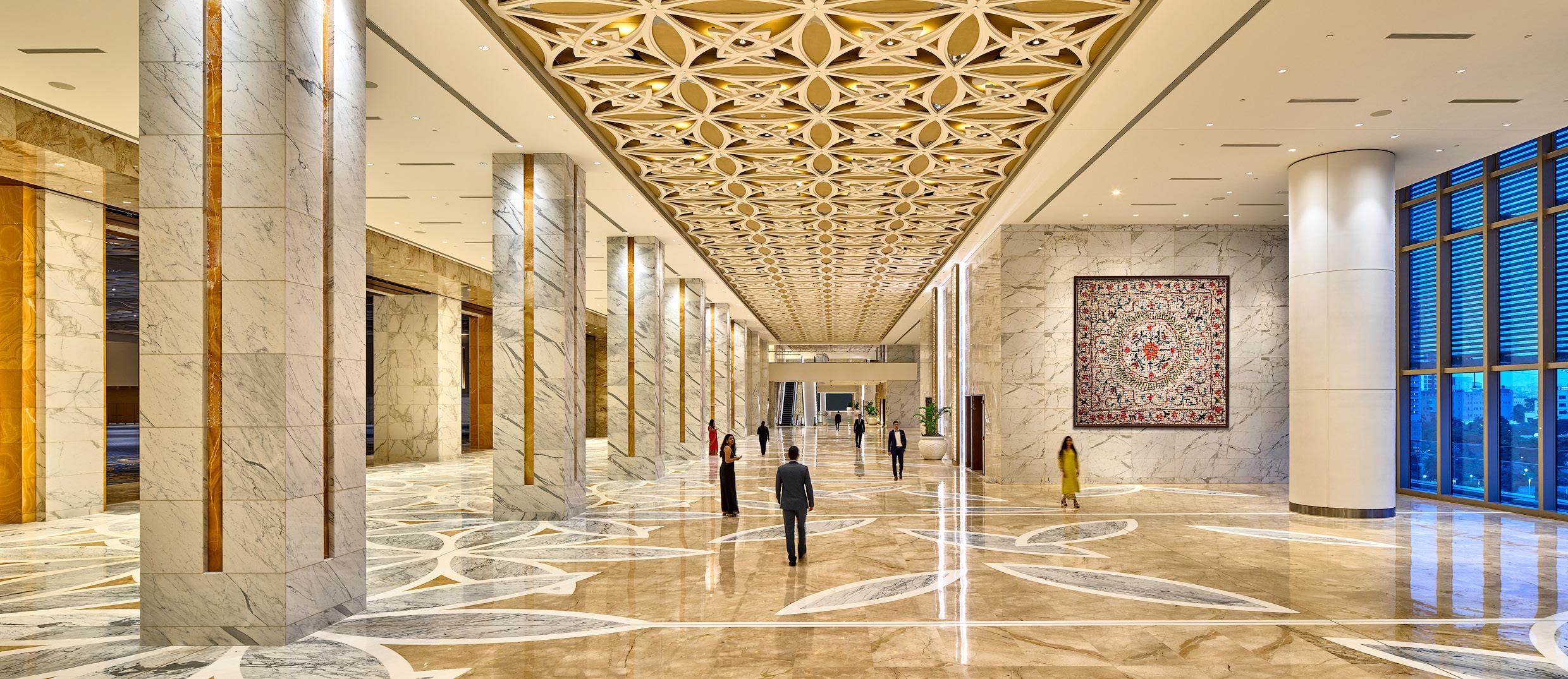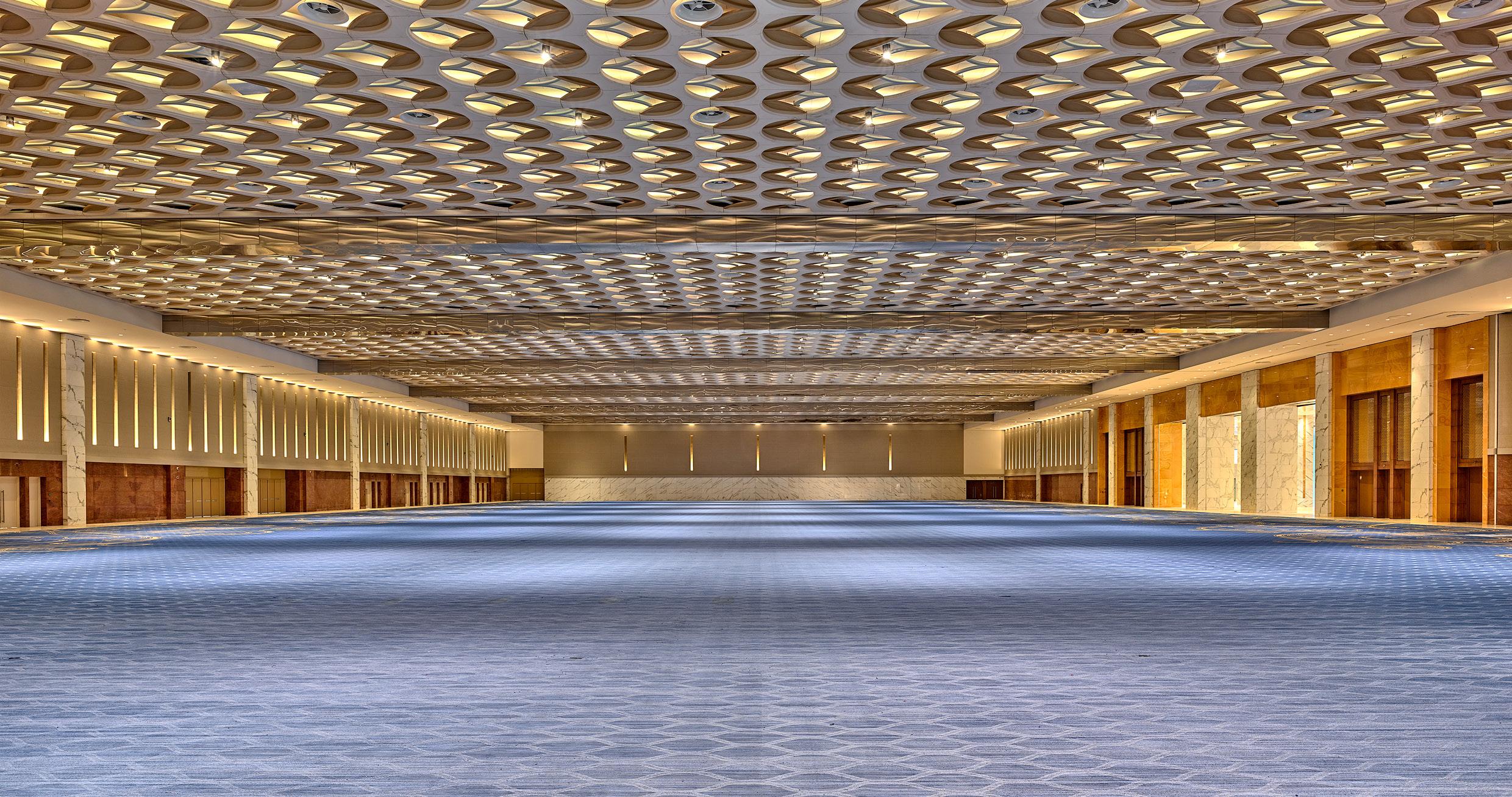 The CEC concourse design is scalloped, giving each three-story entry a unique element, yet a sense of repetition, movement and flow. A stand-out element is the striking, hand-crafted Lasvit chandeliers in the pre-function lobbies. The chandeliers lend each area their own identity. Earth, fire, air and water – sacred elements in Indian philosophy – provide the perfect design inspiration. The concourse ceilings also follow the same iconic lotus-petal theme and have sound absorptive materials that reduce the reflected sound and lets one take in and enjoy their impressive surroundings.