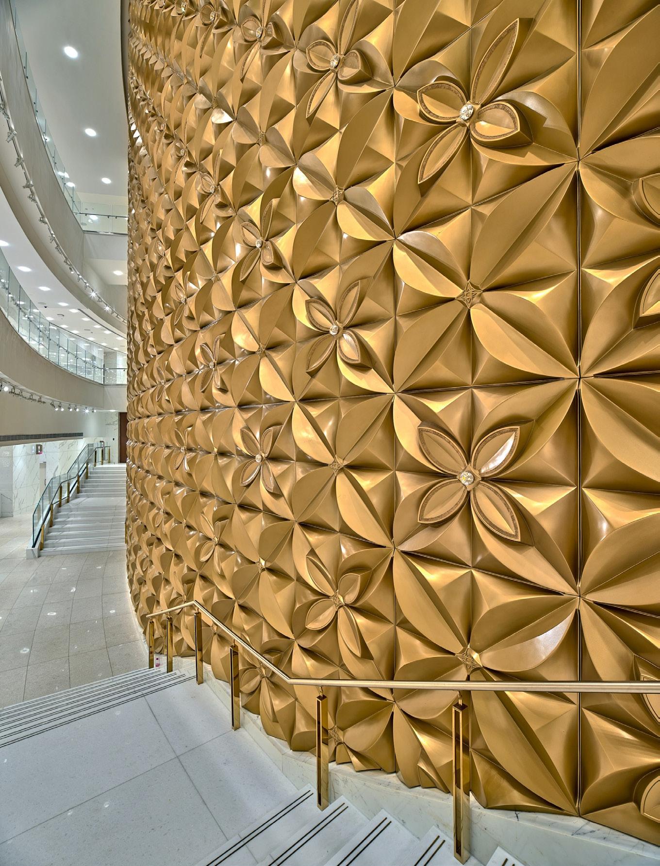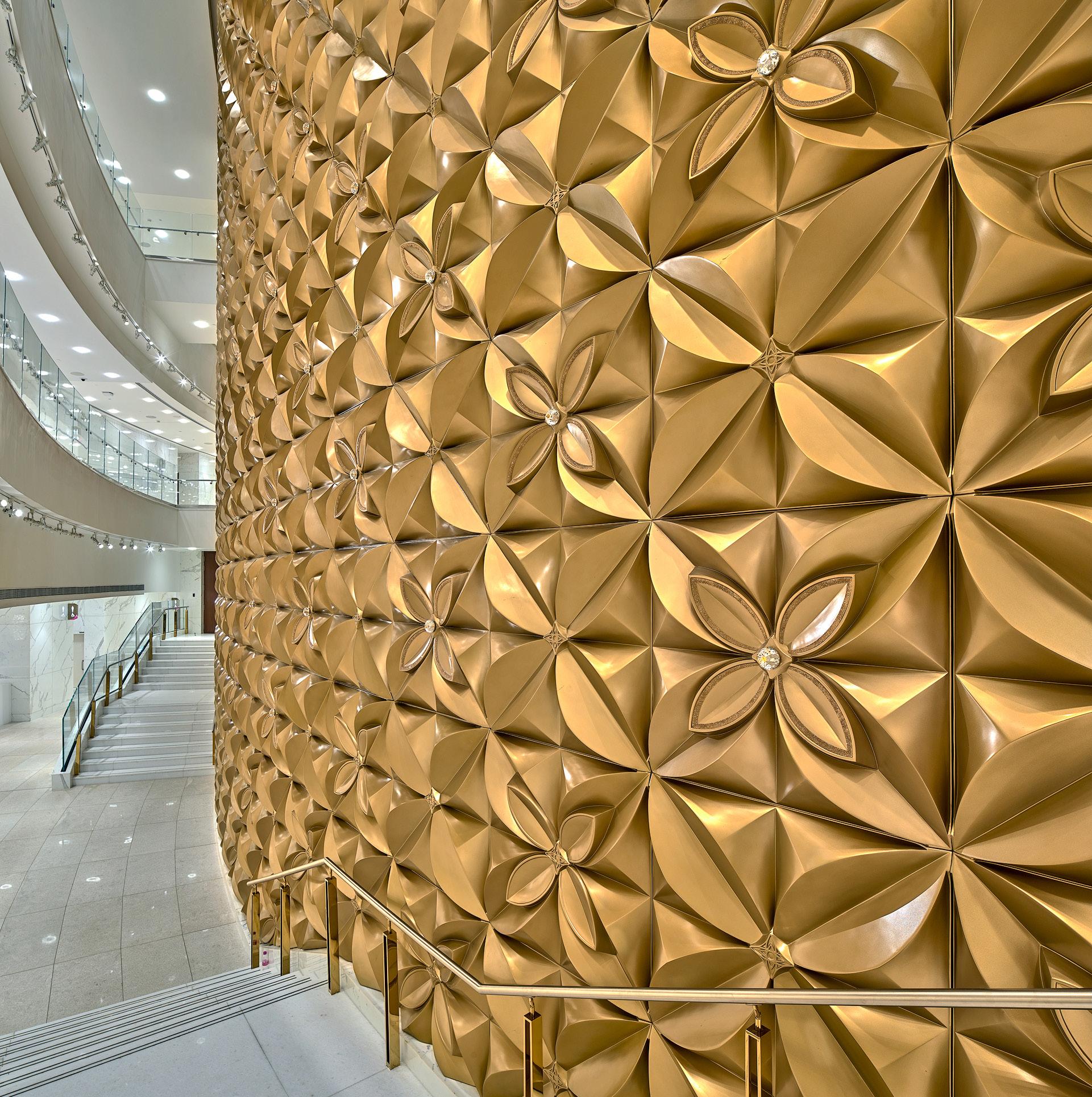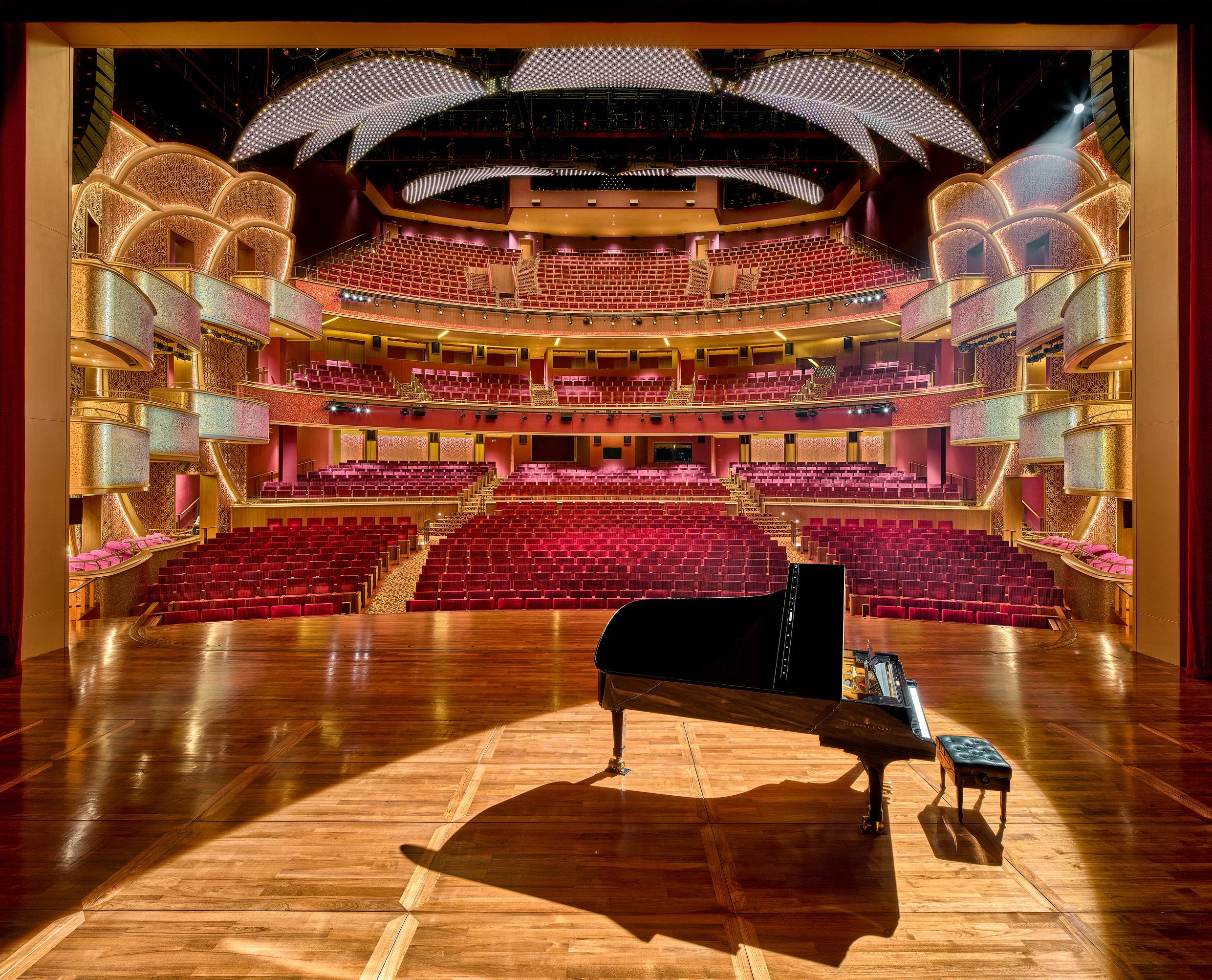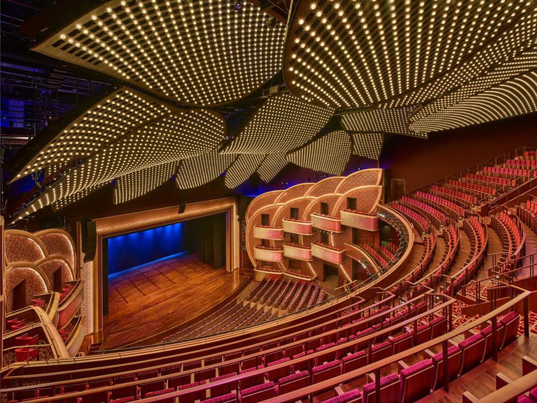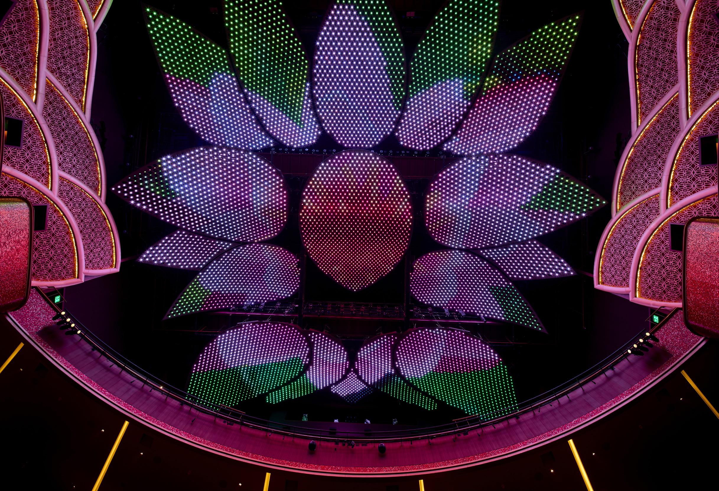 The stand-out feature of this world-class hall is the bespoke ceiling. Custom-built in Austria, 17 lotus petals with arabesque perforated pattern studded with 8,400 Swarovski crystals individually programmable and illuminated transform this remarkable ceiling into a theatrical performance element by itself. Its ability to change in color and pattern integrated into theatre events make this unique in the world.