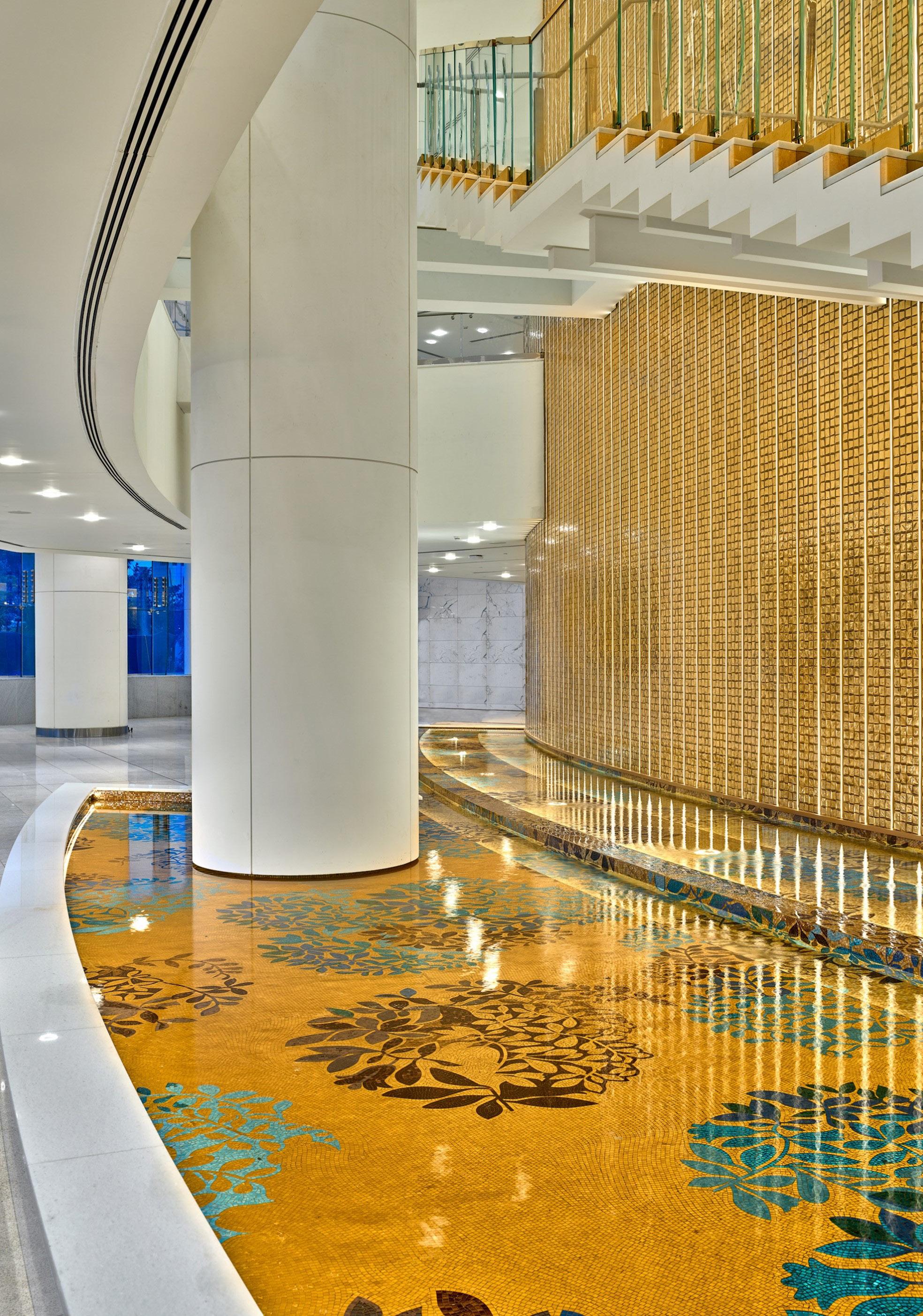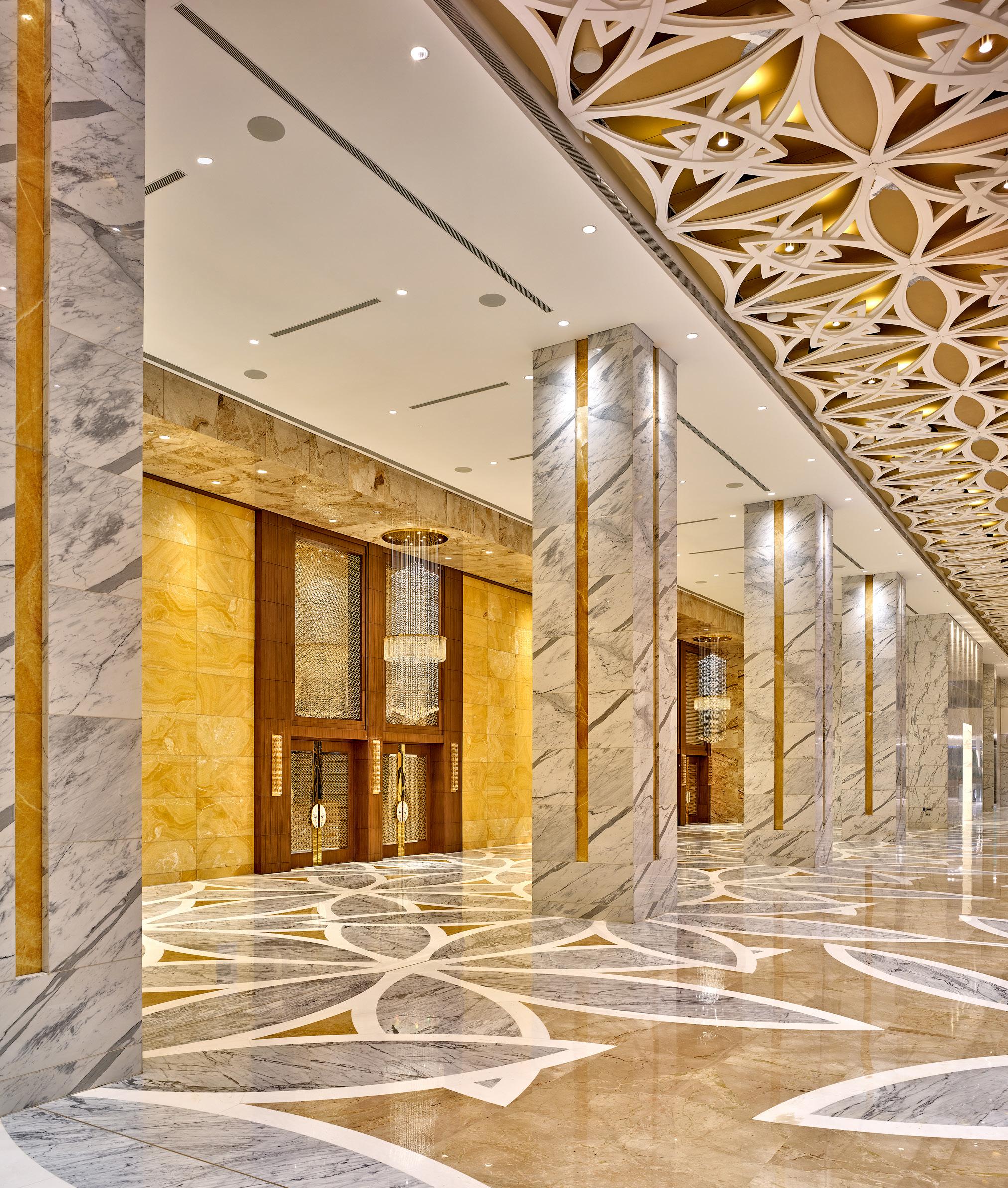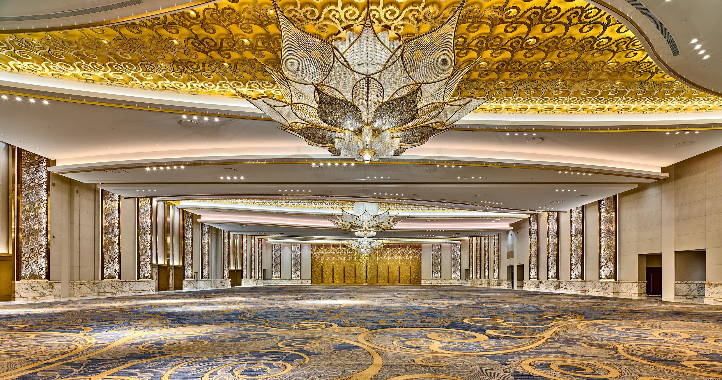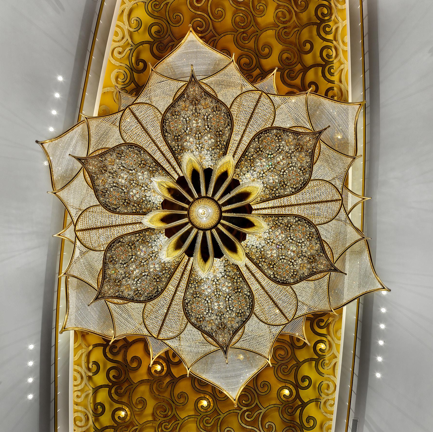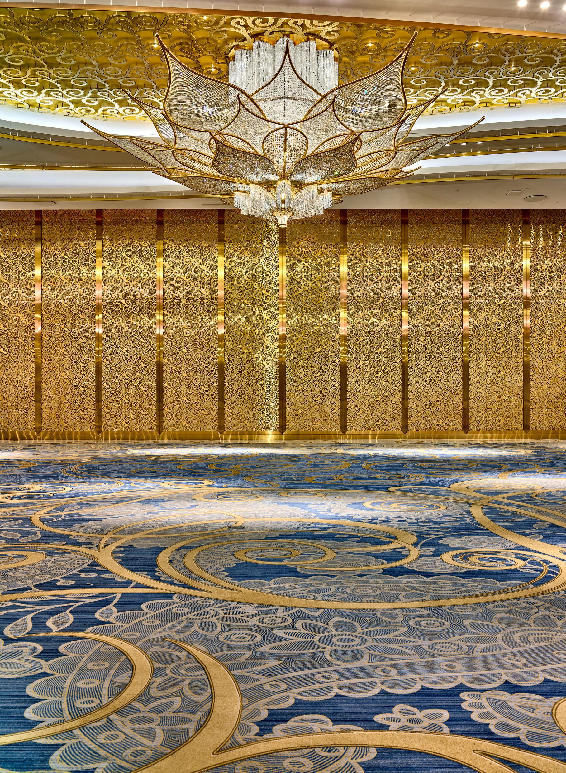 The stand-out feature of this world-class hall is the bespoke ceiling. Custom-built in Austria, 17 lotus petals with arabesque perforated pattern studded with 8,400 Swarovski crystals individually programmable and illuminated transform this remarkable ceiling into a theatrical performance element by itself. Its ability to change in color and pattern integrated into theatre events make this unique in the world.