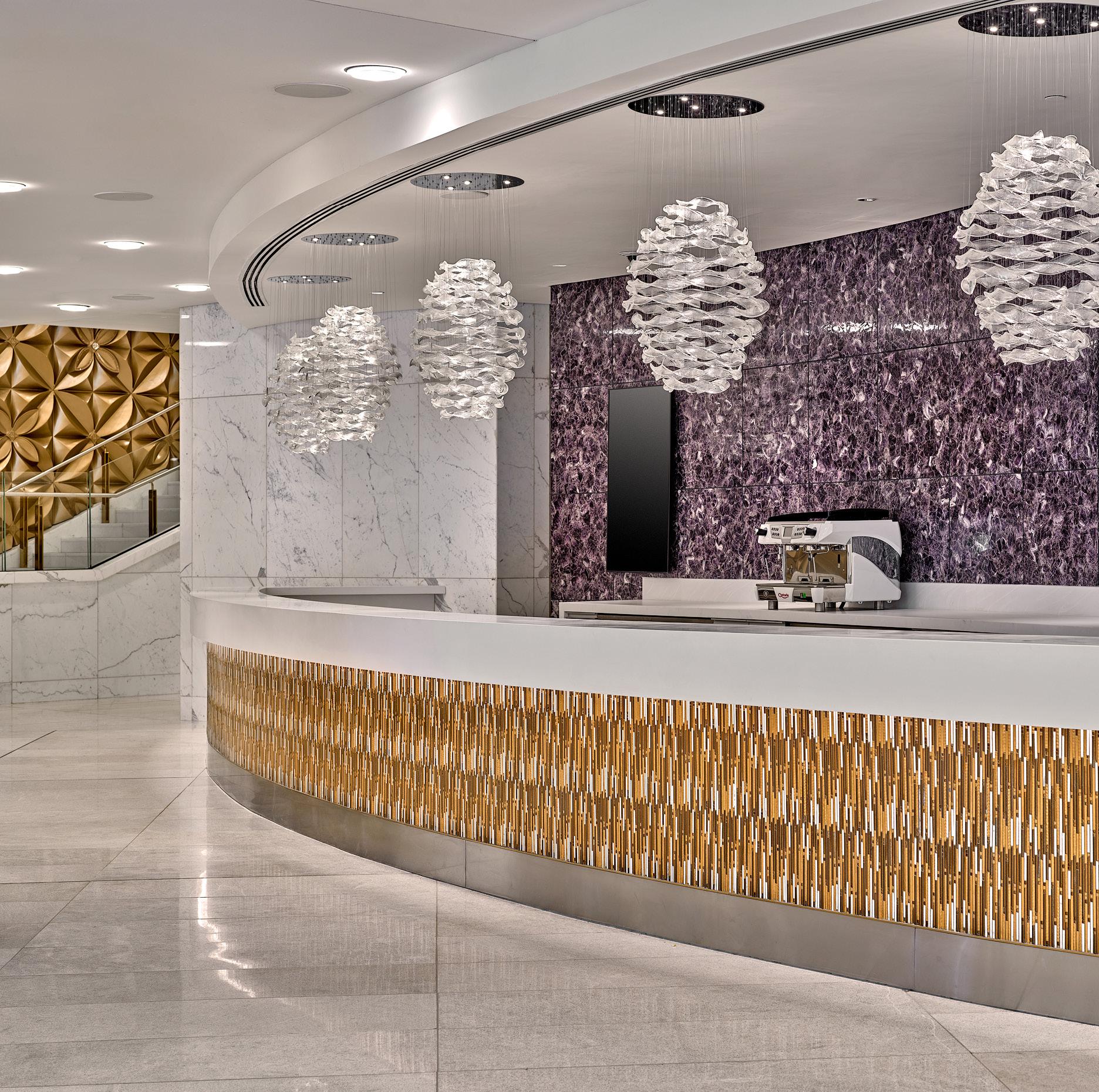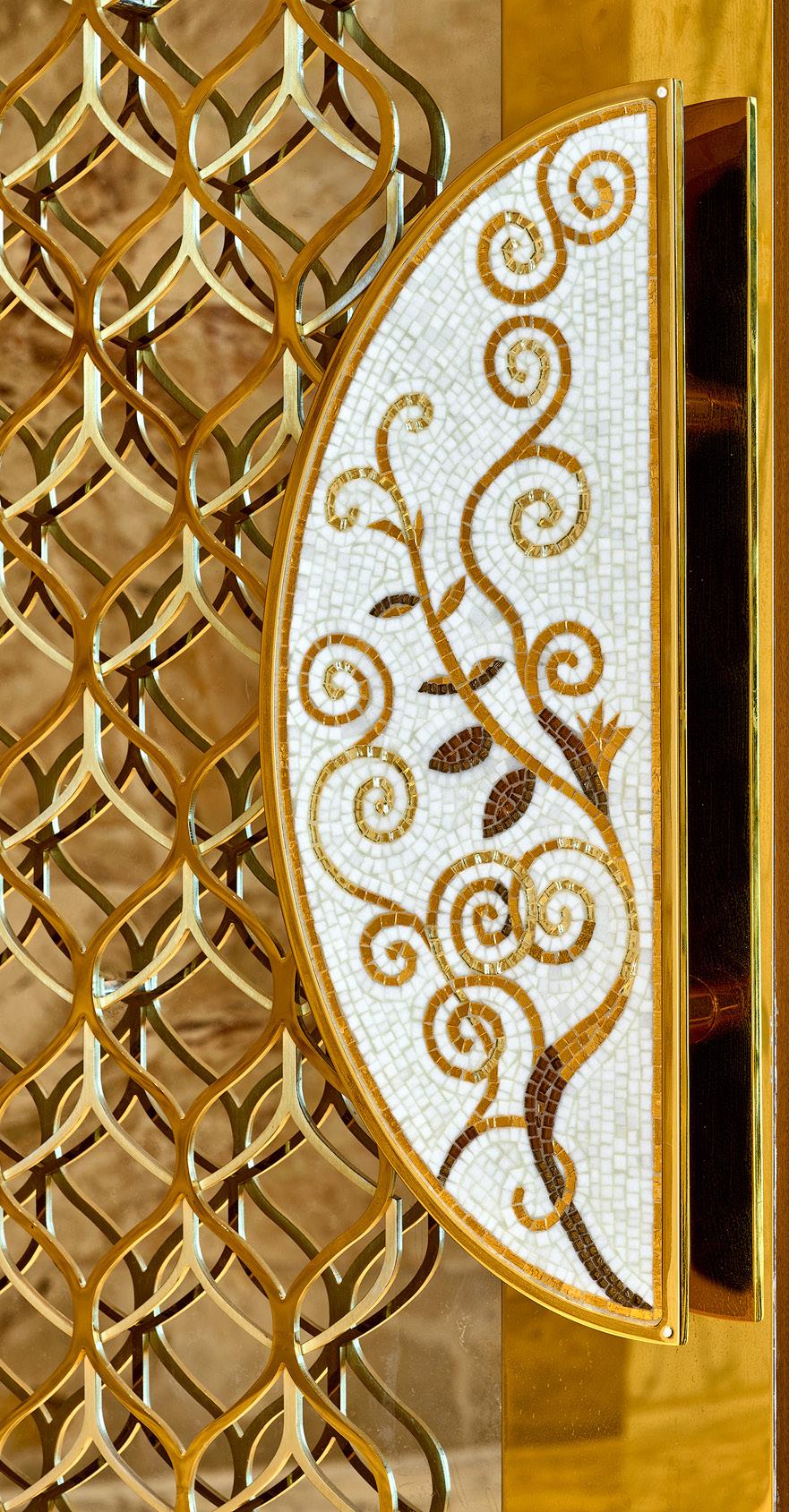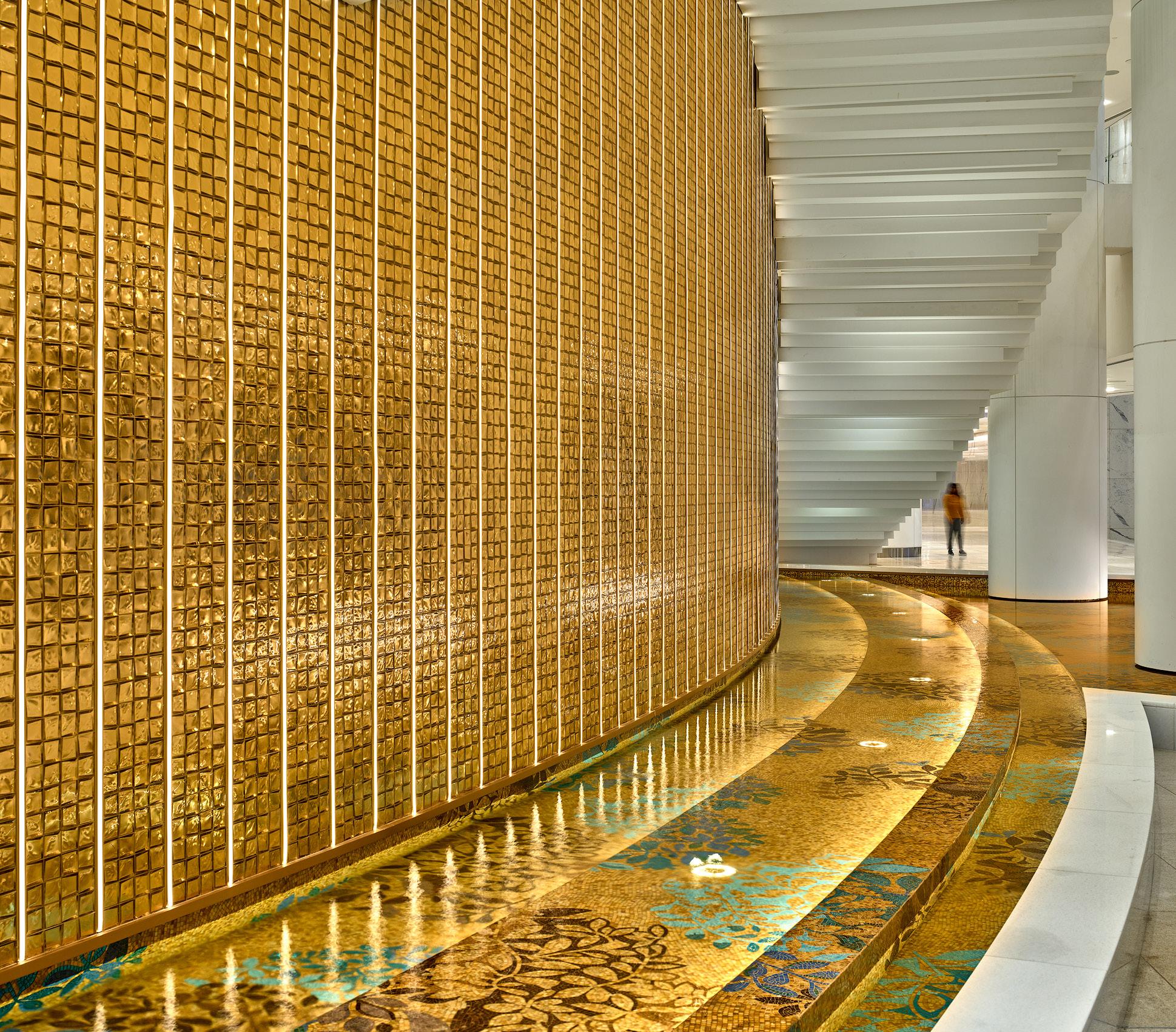 The Grand Theatre features exquisite jewel-toned Sicis mosaic glass tiles from Italy; customized laser-cut meta jaali screens from Dubai; acoustic micro-perforated walnut wood with the ability to absorb sound from Greece; handrails, door frames and millwork from Muscat; custom-colored fabric from Germany and walnut clad seating from Italy.