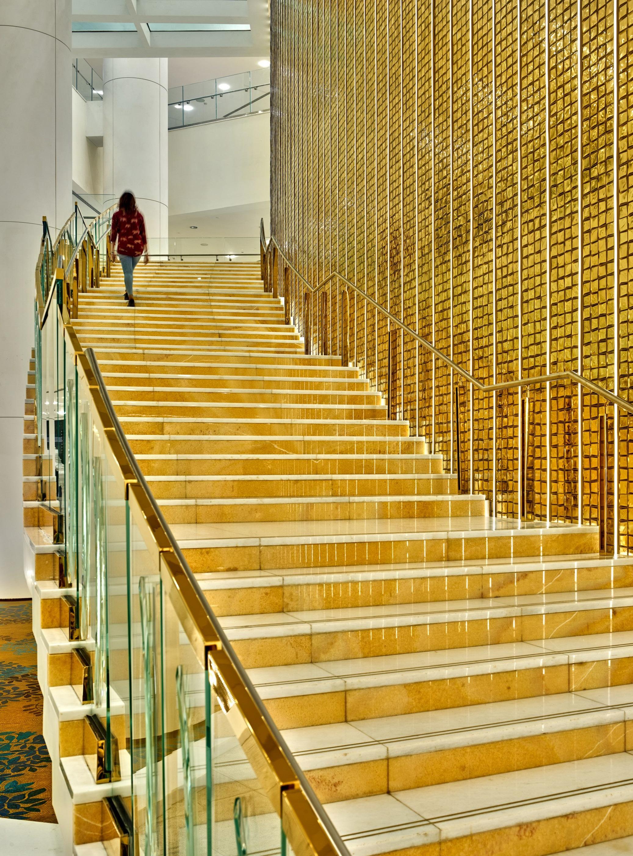The convention centre is enormous with several entry and exit points and is designed in a way that one does not see a straight line all the way down while looking ahead. Instead, the design of the centre is scalloped, giving each entry a unique element, yet a sense of repetition and a sense of movement and flow. The entire flex hall’s ceiling is covered with a jaali, the modern silver metal of the CEC transitioning to a warmer gold. With an area totaling 515,900 sf, this facility is currently India’s largest convention and exhibition center, containing several entry and exit points.