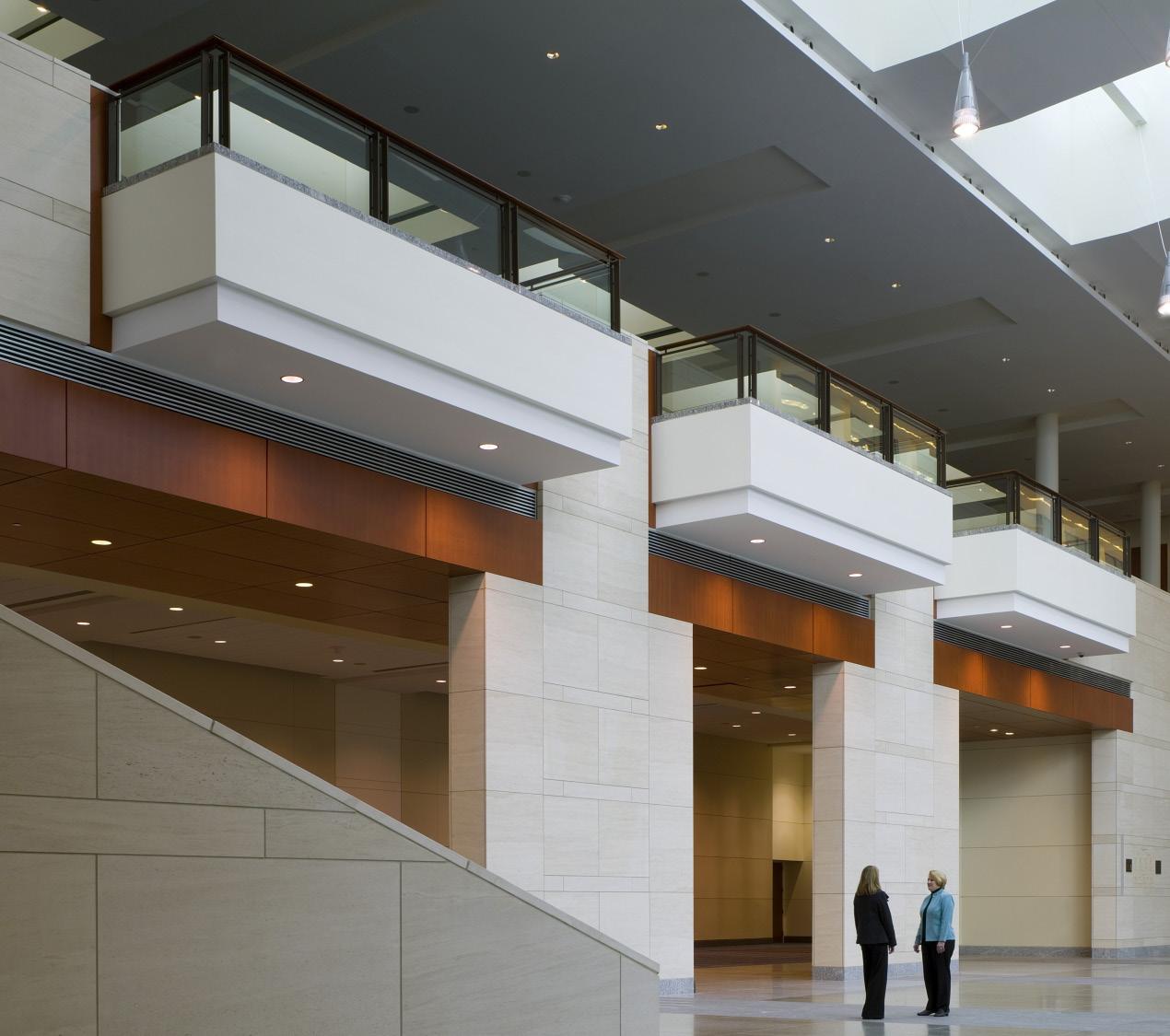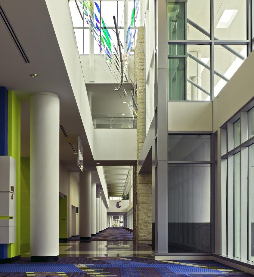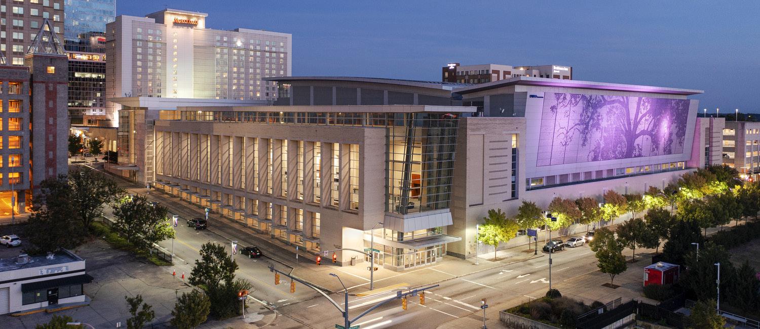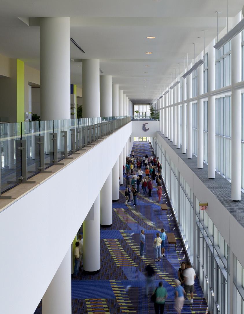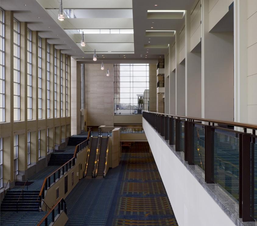 To make the project work within the new pedestrian friendly vision of Raleigh, creative solutions were required to fit a building that would ordinarily cover two city blocks onto a single site. This was achieved by locating the exhibit hall and loading docks below grade. Lobbies, ballroom, concourses and prefunction spaces animate the pedestrian experience. A public plaza creates a dramatic arrival court between the lobby and the new hotel.