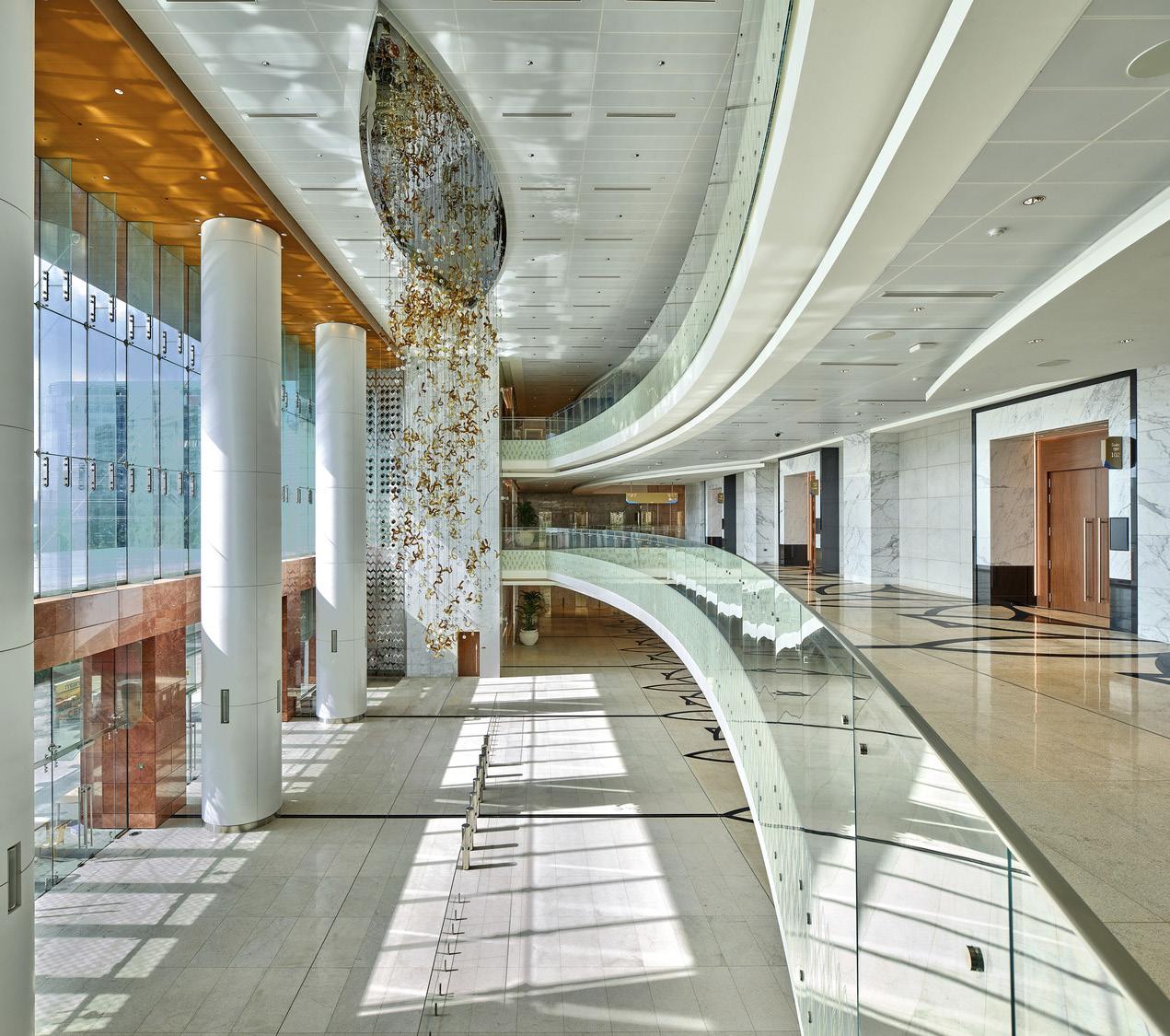 The CEC concourse design is scalloped, giving each three-story entry a unique element, yet a sense of repetition, movement and flow. A stand-out element is the striking, hand-crafted Lasvit chandeliers in the pre-function lobbies. The chandeliers lend each area their own identity. Earth, fire, air and water – sacred elements in Indian philosophy – provide the perfect design inspiration. The concourse ceilings also follow the same iconic lotus-petal theme and have sound absorptive materials that reduce the reflected sound and lets one take in and enjoy their impressive surroundings.
