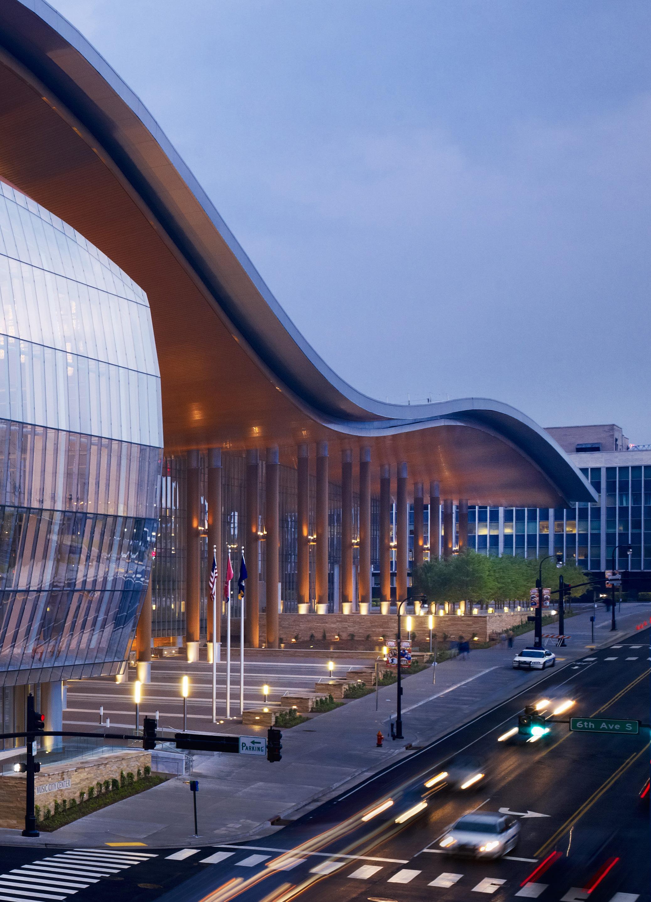 Designed as the centerpiece for the new Americas World Trade District, the Puerto Rico Convention Center welcomes arrivals with dramatic waveform roofs and an expansive outdoor room as its arrival lobby.