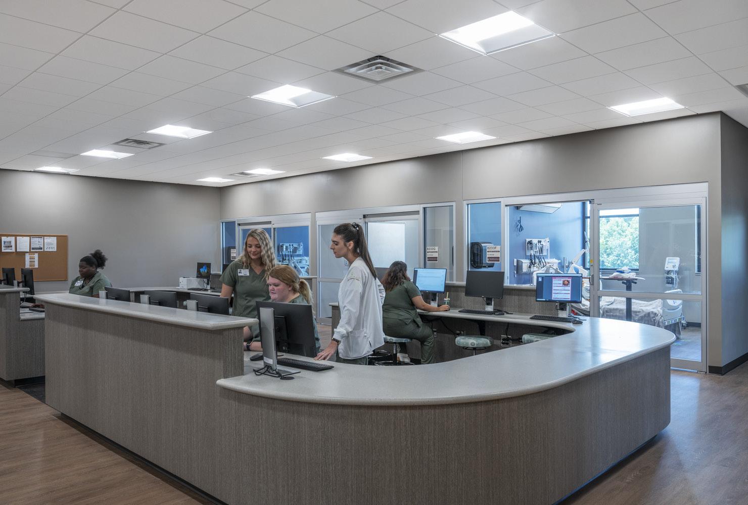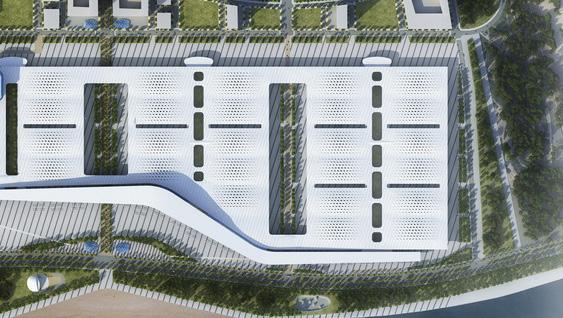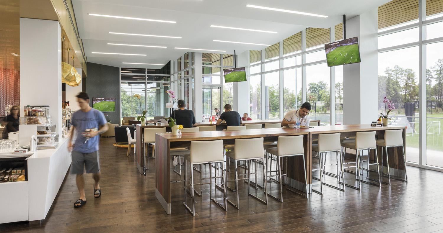 The client commissioned the designers to create a custom facility from the ground up, with avant-garde amenities to make this training facility much more than a locker room, but an inspirational, united wellness and fitness center that would attract future talent. The training gym was designed to be interconnected, featuring bestin-class equipment, a garage door that opens to the fields, and a second level observation window. It is adjoined by a series of rooms dedicated to on-site sports medicine, including a physiotherapy room with exam tables, a hydrotherapy room, and a sauna. The first team’s locker room is located at the heart of the facility, giving the players a communal place to prepare for training. The upper level dining area has an open kitchen to train the players in how and what to cook and eat, and long communal tables allow the team to eat together and spend time together off of the field. Connecting these player spaces to the corporate office spaces in the facility is an open, two-story lobby with full windows facing the fields which doubles as a private event space and reinforces the focus on providing a hospitality-driven atmosphere that encourages gathering, conversation, team bonding, and community participation.