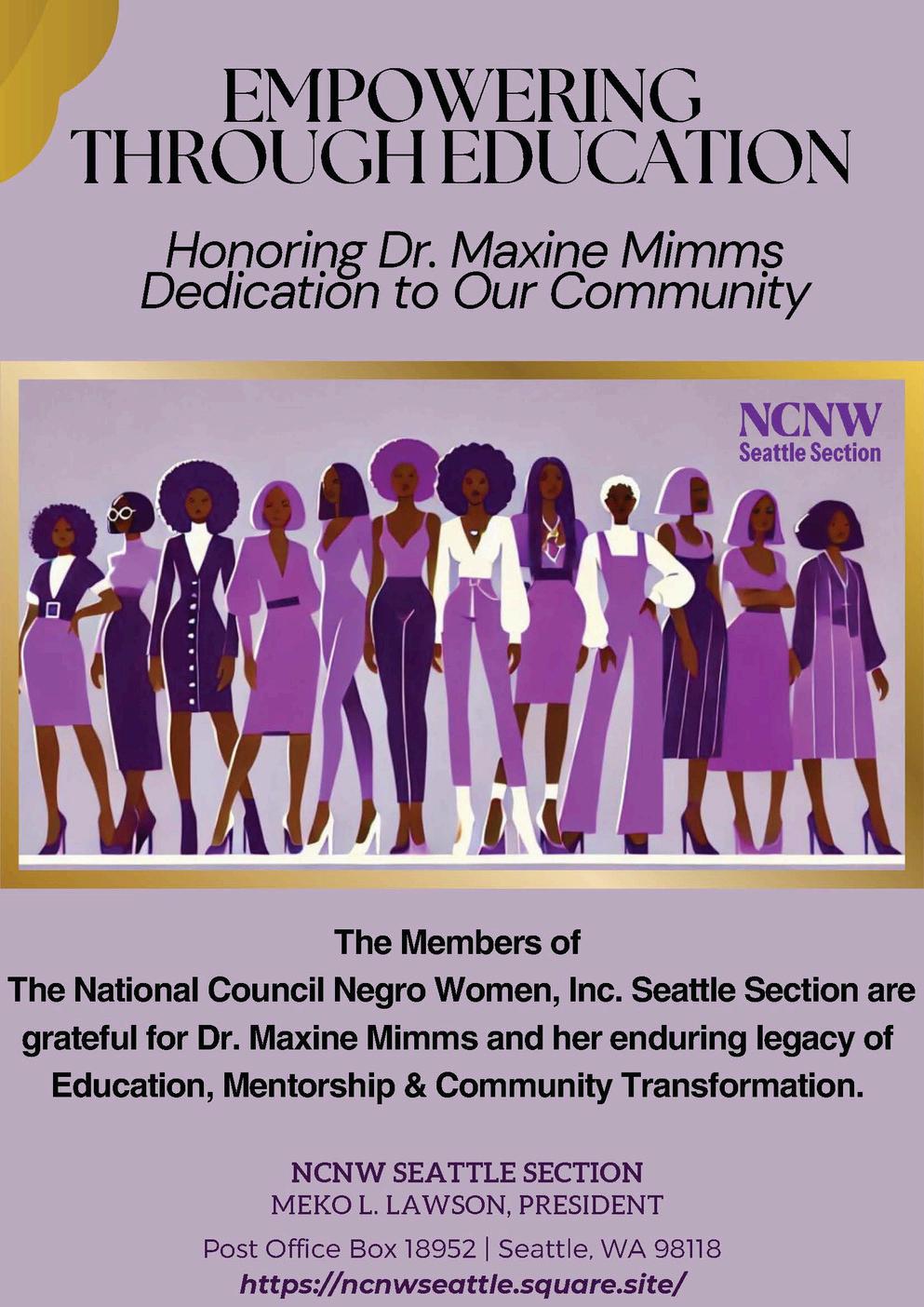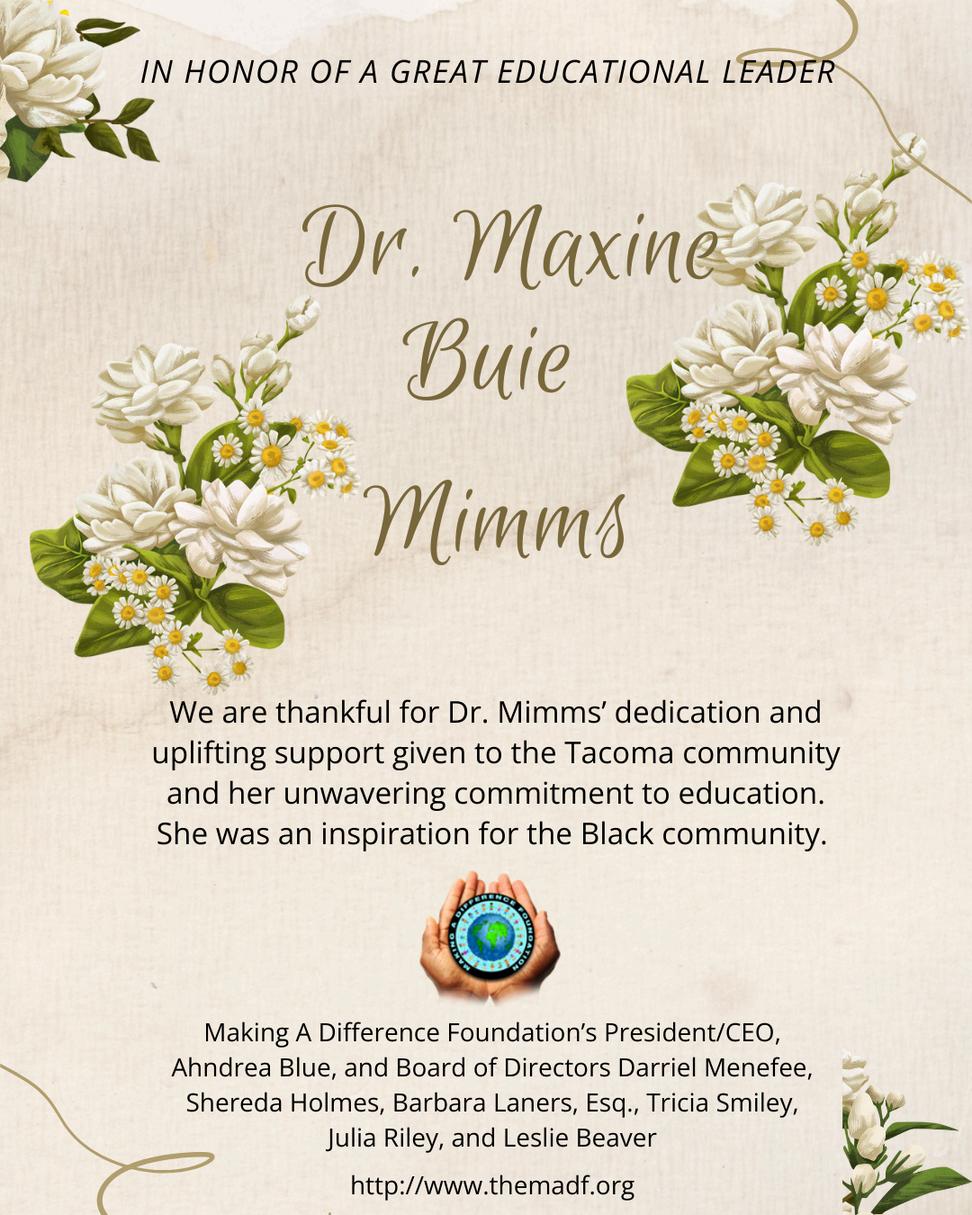 Written October 14, 2024, in tribute to her professor, mentor and friend Dr. Maxine Buie Mimms by Dawn Mason Founder of Parents for Student Success. Seattle WA