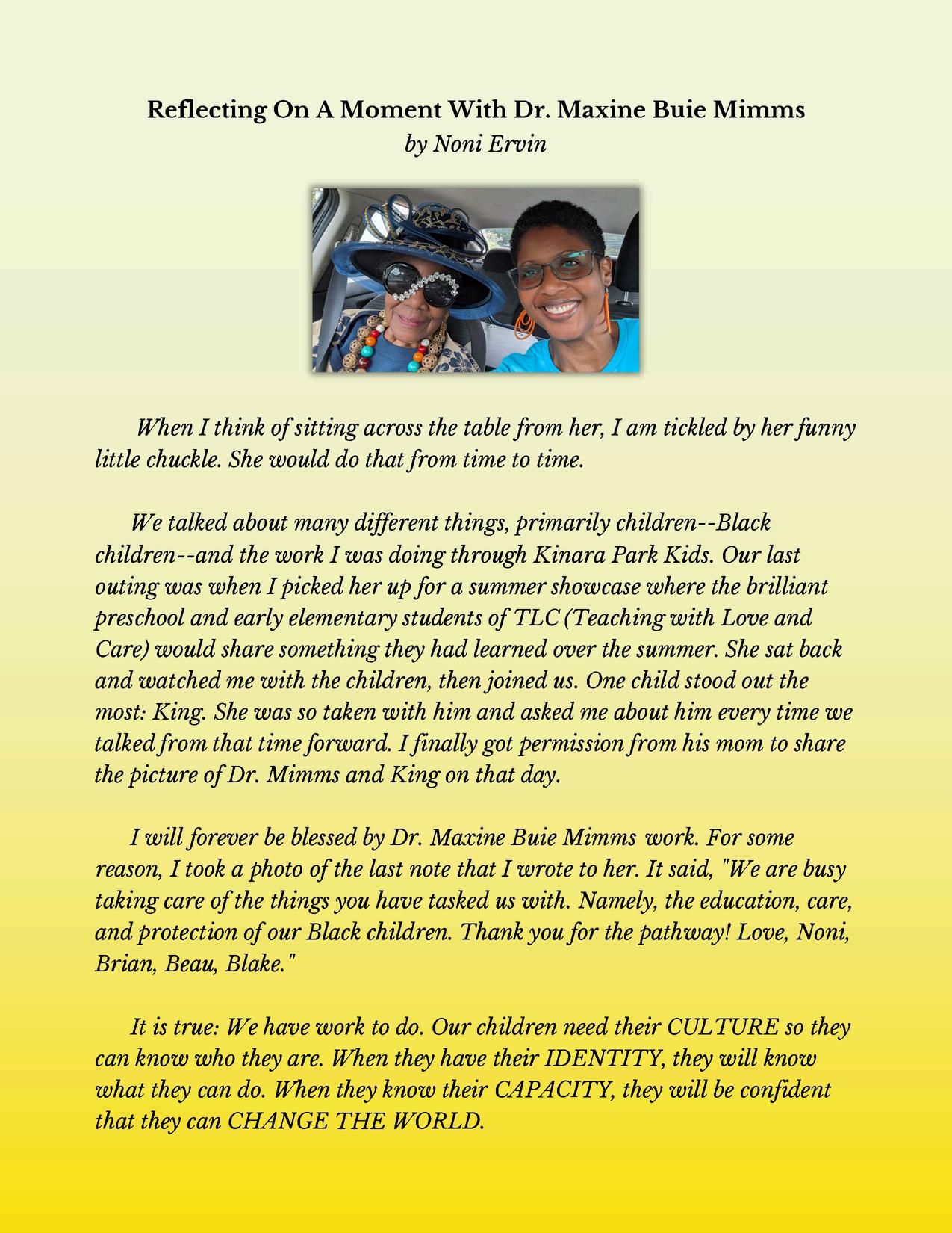 Welcome, everyone, and thank you for joining me on this journey to celebrate Dr. Maxine Buie Mimms. Our friendship dates back to the days of Zion Prep in the 90s. Many saw Dr. Mimms as a mentor or elder, but to me, she was a cherished friend, a kindred spirit. This book began as a collaborative effort to honor her life and legacy even before her passing, and it reflects the spirit of community and partnership that she always championed.