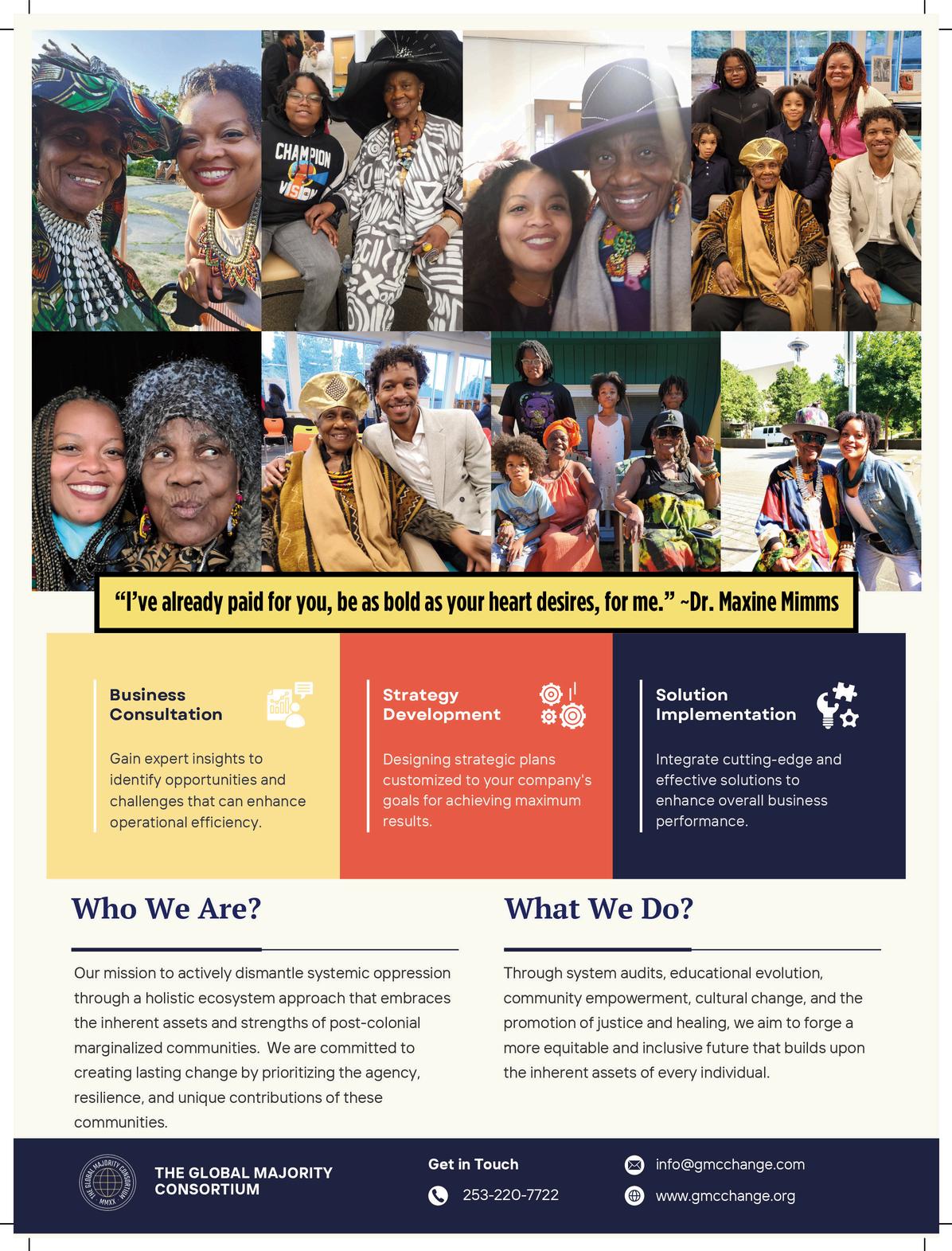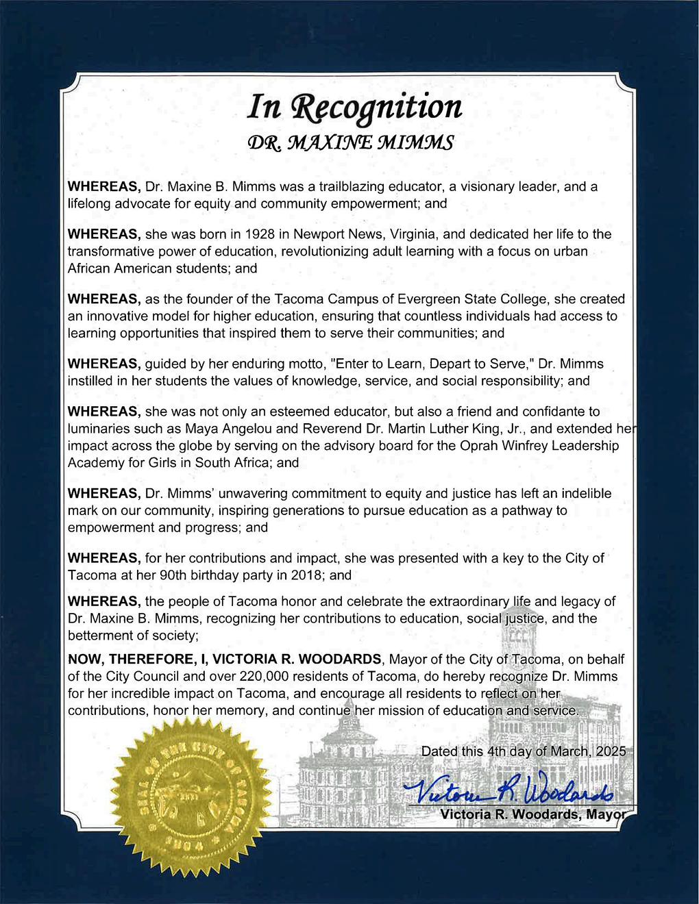Everyone who attends these events or who supported this project will receive a copy. The Journey book will also be viewable at www.drmimmspresents.com. Proceeds from this project will help fund her Celebration of Life planned for March 8, 2025, at the Evergreen State College Tacoma Campus, as well as Live Streamed. Maxine left clear instructions for her celebration. Updates will be posted to the website after the 1st of the year.