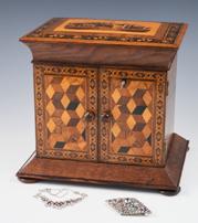 paraphernalia, jewellery or watches. Although useful boxes were a major mainstay, makers produced everything from tables to writing slopes, trays and sewing tools, to musical instruments and even yo-yos! In general, the larger the piece, and the complex and greater the surface decoration, the better. More is more! Although the market has cooled over the past 20-30 years, making Tunbridge