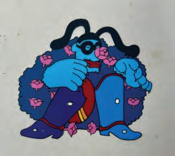 at the time. This one must have been kept as a souvenir by an ardent fan or cinema usher, as it’s been carefully folded down the middle. And Row C would have been right up close to all the colour and action! But if you want a piece of the film itself, you can. Top of the tree in the memorabilia stakes are items that were used in a production, from props to costume and more. Before digital processes took over, cartoon animation was painstakingly produced using stop-motion filming, with each scene divided up into single shots. Each shot was of a handpainted animation cel (short for celluloid) – so hundreds, if not thousands, were produced depending on the length and complexity of the desired result. Typically, these cels were discarded after use, or else stored away, with many degrading over time. Some survived, such as a hand painted cel of one of the iconic ‘Blue Meanies’, the music-hating antagonists in the film. Cels are highly desirable today, being collected by fans of a particular film and film historians. Estimated at £300-400 is a super psychedelic cel of a Blue Meanie hiding (badly!) in a rose bush. And there’s a personal link to Alex the auctioneer too – his uncle Charlie Jenkins worked on the team that developed the look of the Blue Meanies!