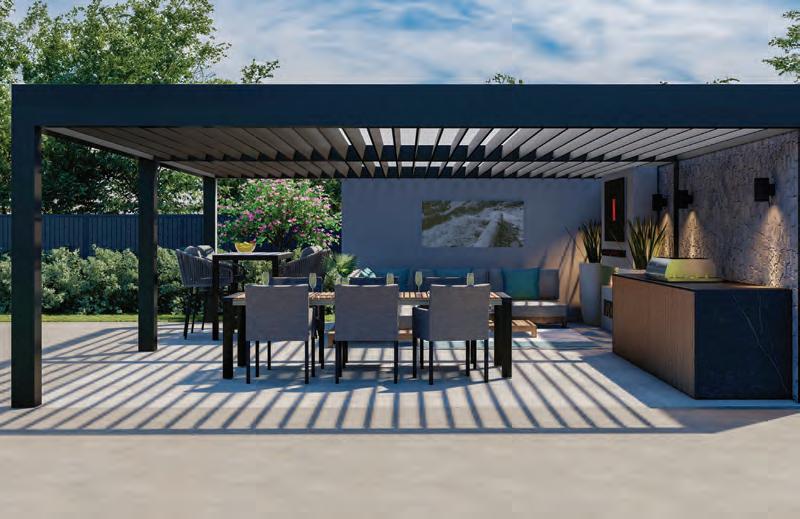 far, then check out Grillo’s new pergola that integrates with its stylish outdoor kitchens. See Grilloliving.com