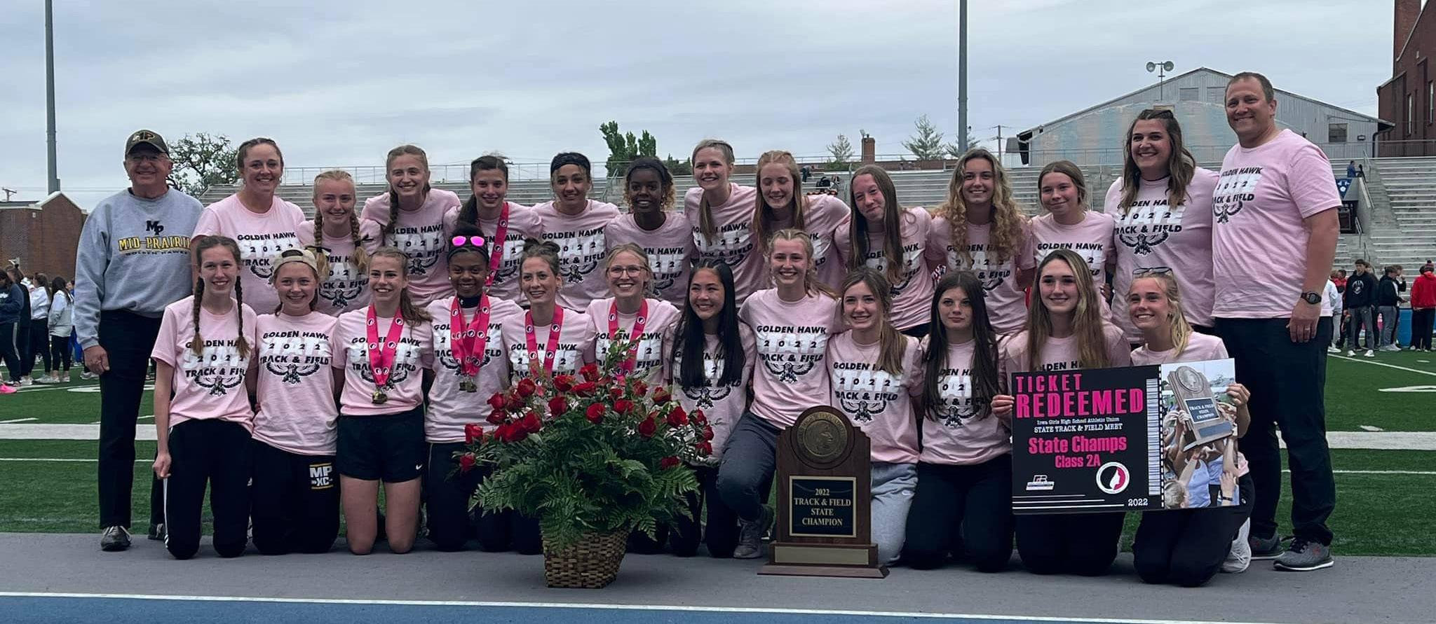 The Mid-Prairie girls track team took home their fourth straight 2A girls’ state track championship at Drake Stadium in Des Moines. The girls’ overall score of 65 points led them to this fourth consecutive title. Mitzi Evans had her first individual state championship, winning the 400 meter dash with a time of 56.36 seconds. She ran the 800 in 2:12.56. The 3000 state champion was Danielle Hostetler, with a time of 10:27.77. The Golden Hawk distance medley team consisting of Madeline Schrader, Amara Jones, Mitzi Evans and Danielle Hostetler won gold with a time of 4:07.96.