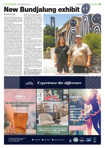 Weekly. “But what we put in place today is going to be talked about by future generations as history. Museums are keeping places, and as Aboriginal people that’s important to us. How do we keep story? How do we look after what’s been passed on to us, whether it’s material cultural artefacts or intangible story and language?” For Bundjalung children, the exhibition offers something many never had growing up. “It’s a sense of belonging and connection,” Kyle said. “To have an origin story and connect to an origin story is a key thing for identity. This is a story about your ancestors, where we’ve come from and where we’re at today.” He said the story also offers meaning for non-Indigenous locals. “When you’re living on Country and you know the story of that Country, it gives people an understanding. It’s the beginning of that.” Tweed Regional Museum Acting Director Erika Taylor said the exhibition reflects years of relationship building. “Museums are colonial institutions and not traditionally safe spaces to tell these stories,” Erika said. “So, it’s been about authentically building relationships with Kyle and the local community over many years.” The Wiiyaan does not ask visitors to relinquish their own history. Instead, it offers context. An origin story beneath the settler stories that followed, enriching how we see the place we all share. The Wiiyaan exhibition is now open Tuesday to Saturday 10am to 4pm at Tweed Regional Museum, 2 Queensland Rd, Murwillumbah.