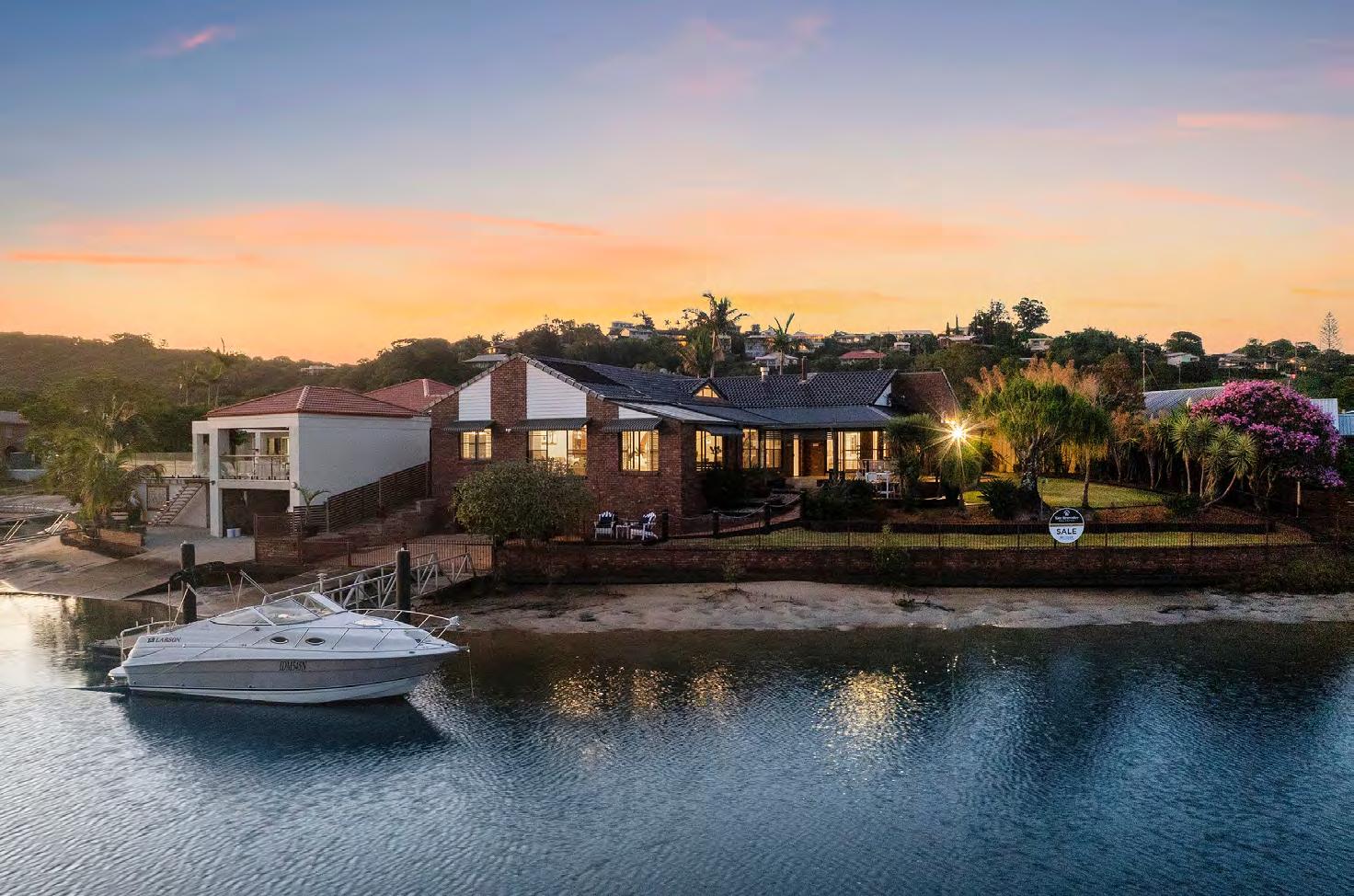 Commanding an irreplaceable riverfront position, this extraordinary residence redefines luxury living. Set within one of Banora Point’s most exclusive Blue-Ribbon enclaves, the property enjoys complete privacy, and an exceptional 44 metres of absolute river frontage, including your own private sandy beach – a privilege reserved for the very few. Expansive open-plan living, soaring high ceilings, and panoramic water views from every window create a residence of both sophistication and serenity. Welcome to 5 Admiralty Place, Banora Point.