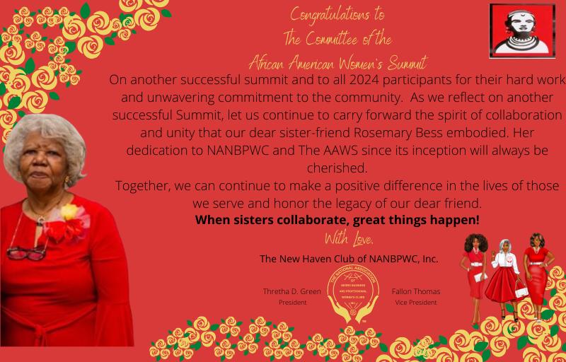 On behalf of the 2024 Committee of the African American Women's Summit, we extend our heartfelt gratitude to all attendees and sponsors for making this year's event a tremendous success. Your participation, insights, and dedication have truly enriched the Summit experience for everyone involved. We are immensely grateful for your support and look forward to welcoming you back next year for another inspiring and empowering Summit. Together, we will continue to uplift and celebrate the achievements of African American women, creating positive change in our communities. Thank you for being part of this incredible journey.