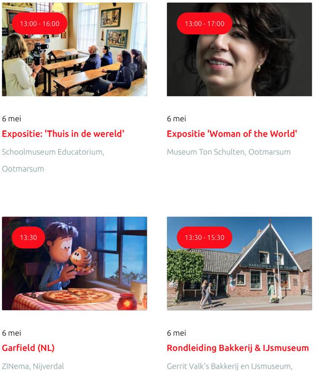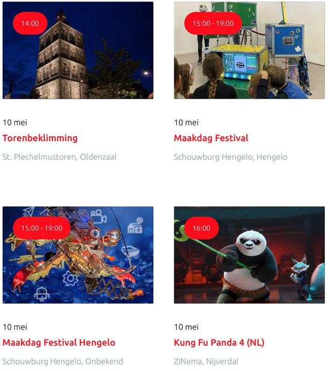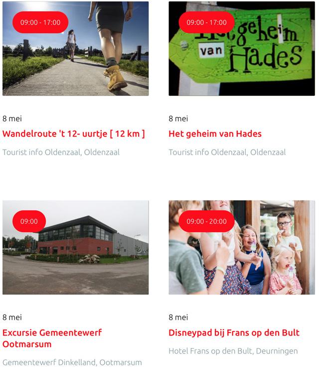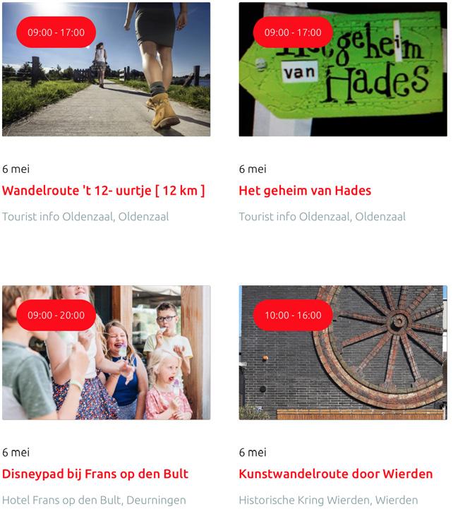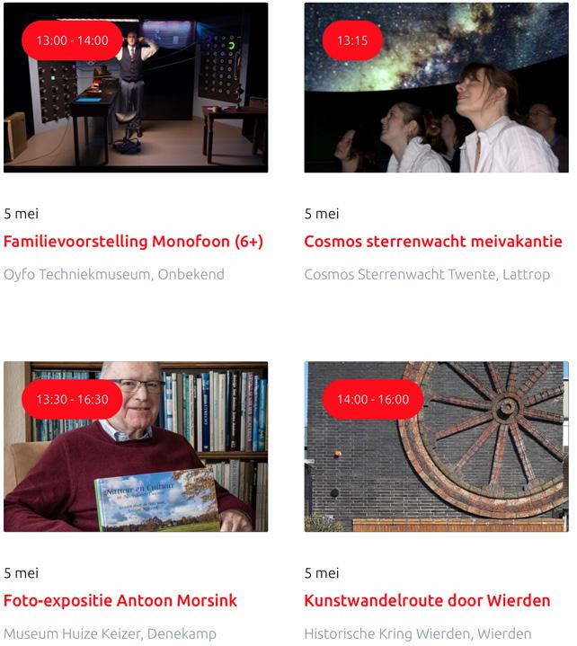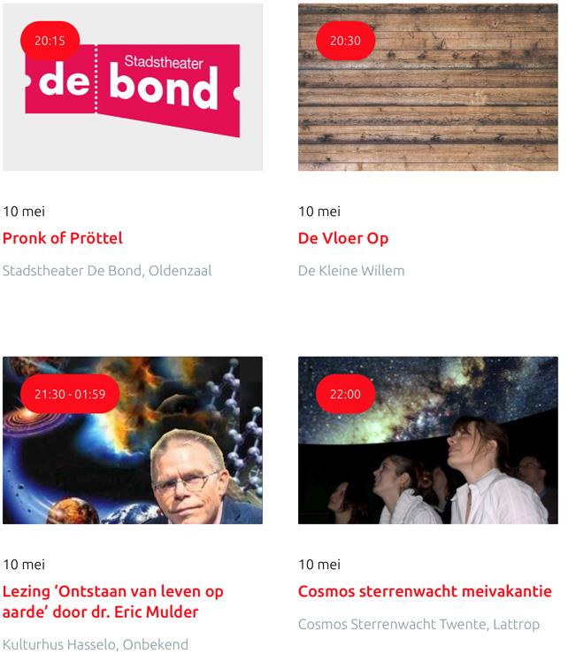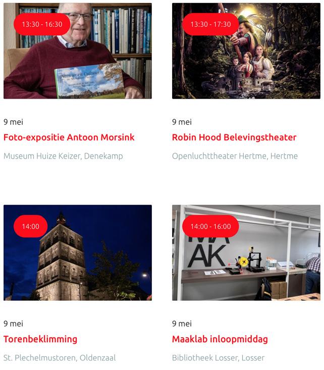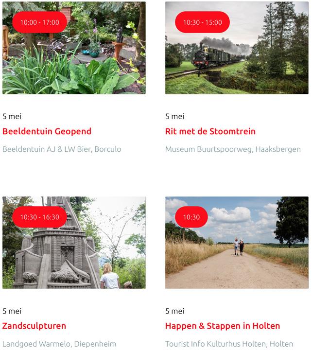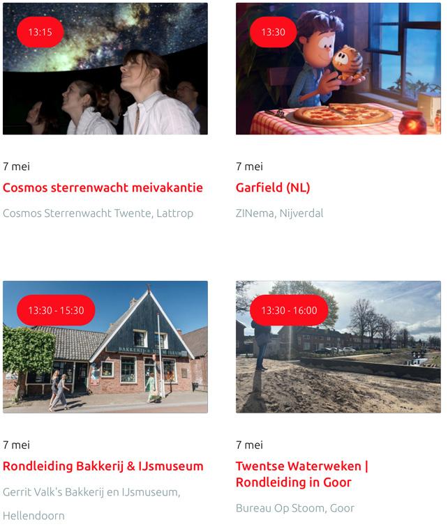Voor een actueel overzicht kijk op: www.visittwente.nl/uitagenda of www.uittwente.nl. Evenementen en activiteiten aanmelden kan via de plaatselijke VVV/Tourist Info en redactie@twentejournaal.nl