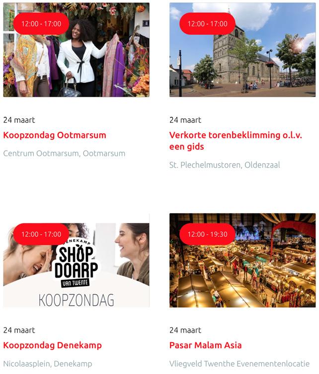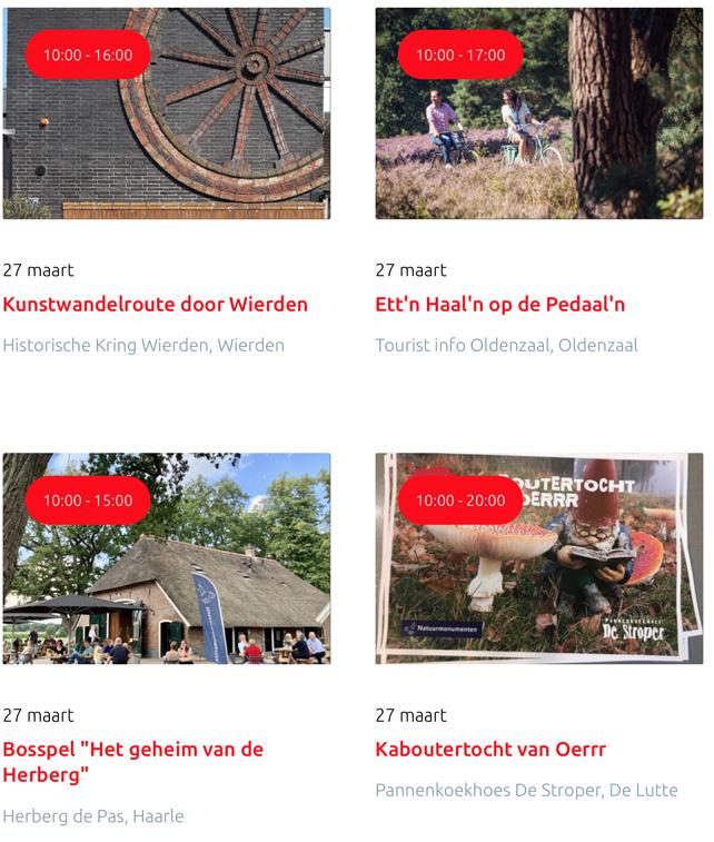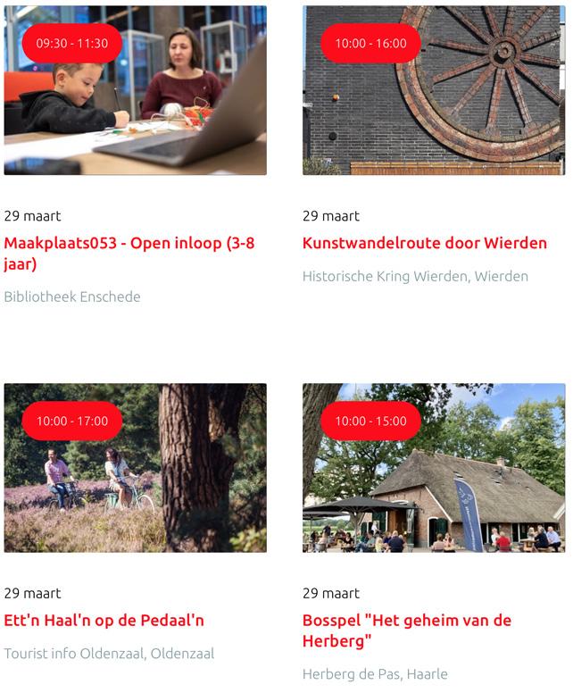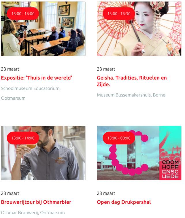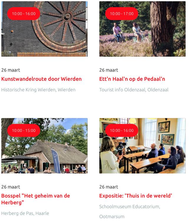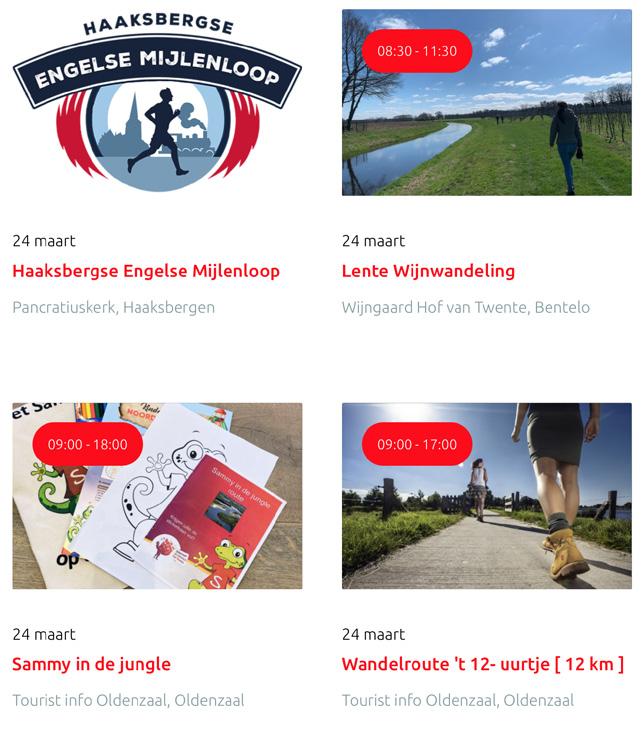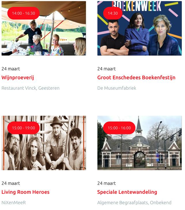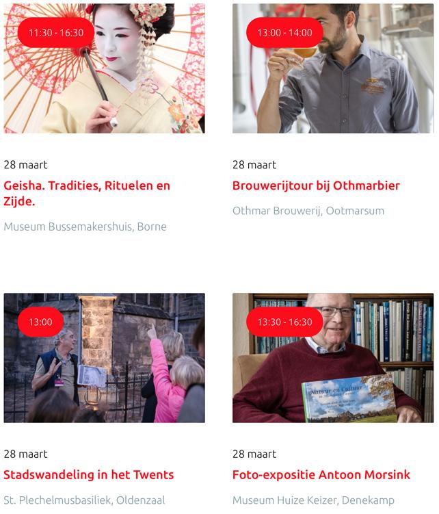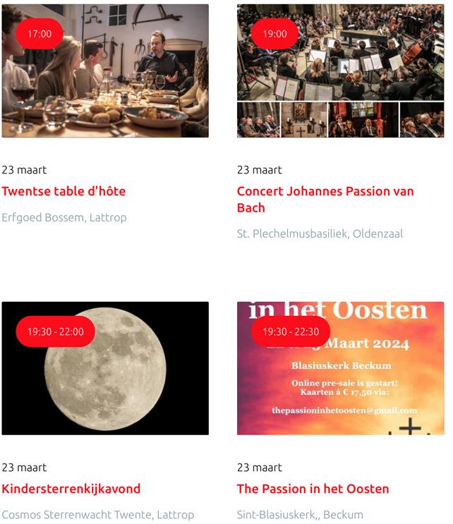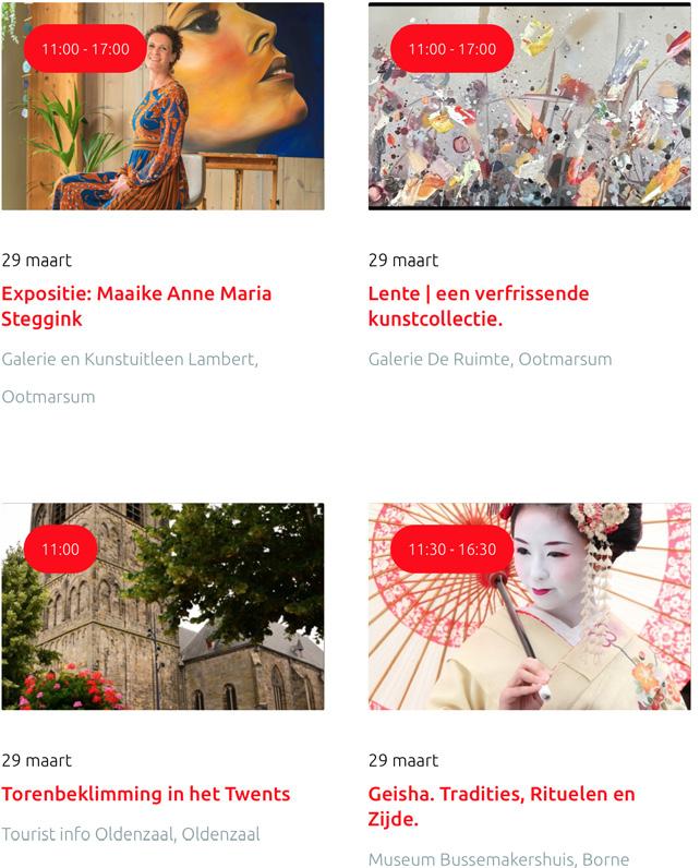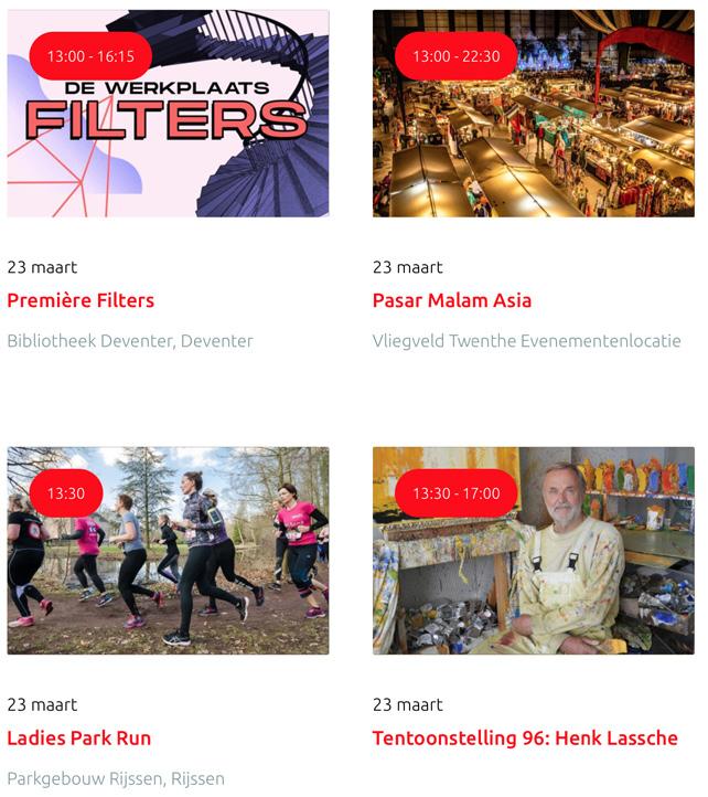 Voor een actueel overzicht kijk op: www.visittwente.nl/uitagenda of www.uittwente.nl. Evenementen en activiteiten aanmelden kan via de plaatselijke VVV/Tourist Info en redactie@twentejournaal.nl