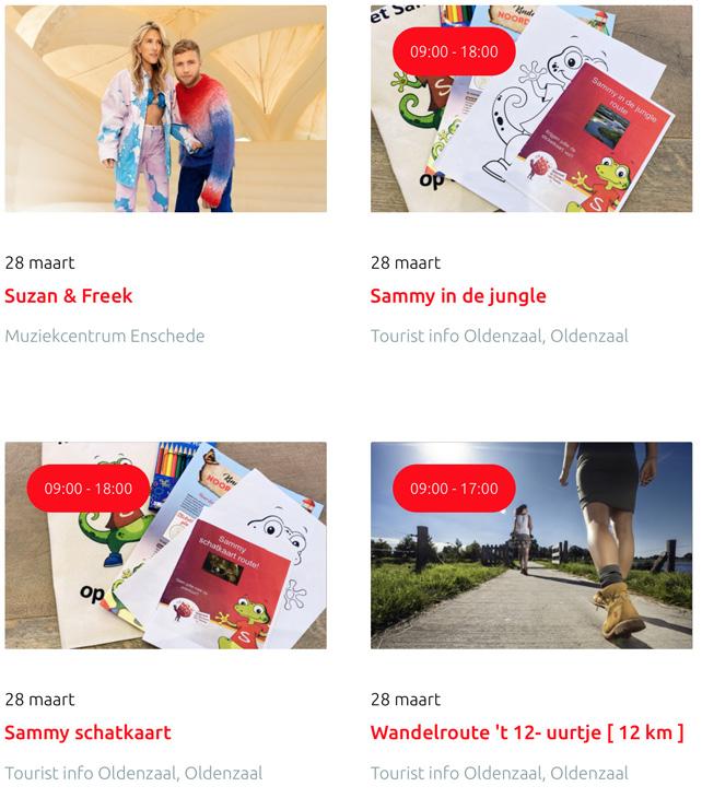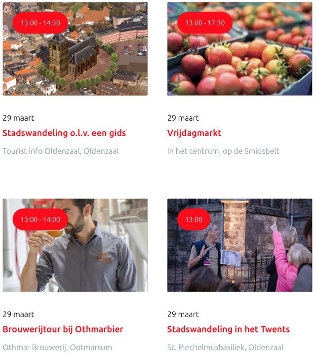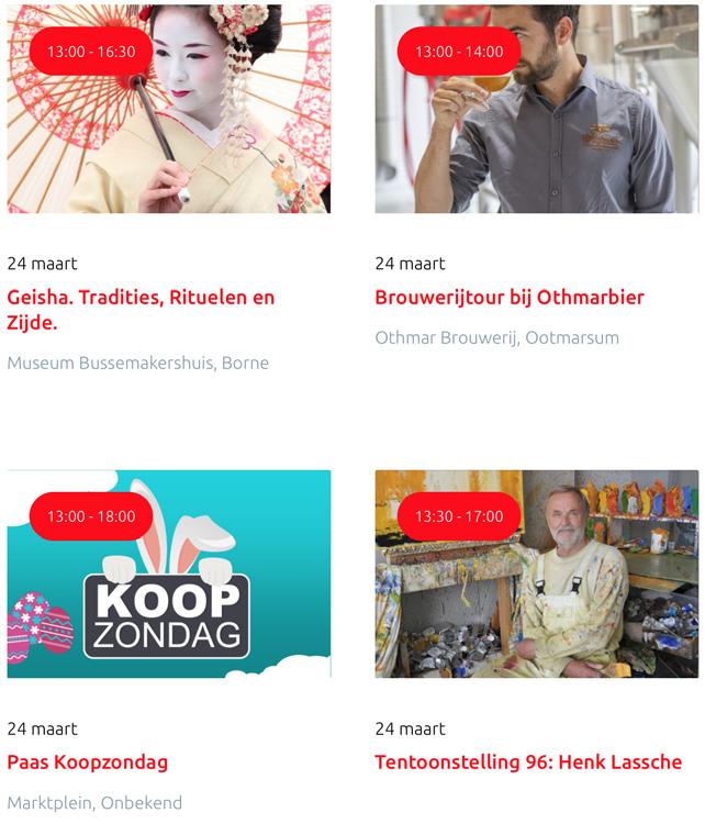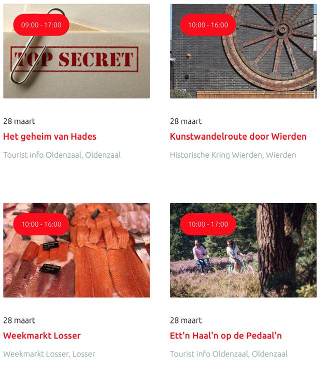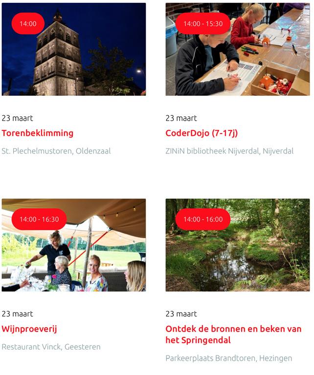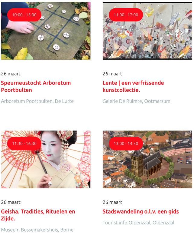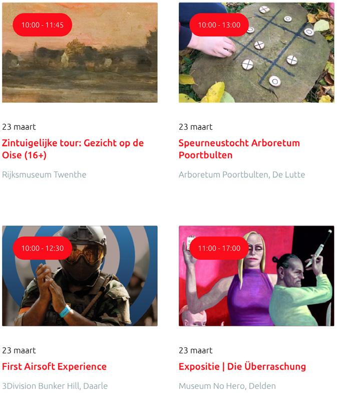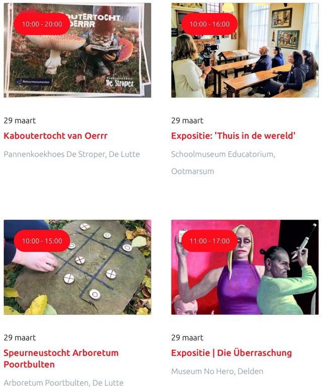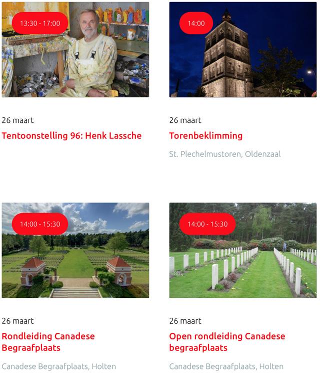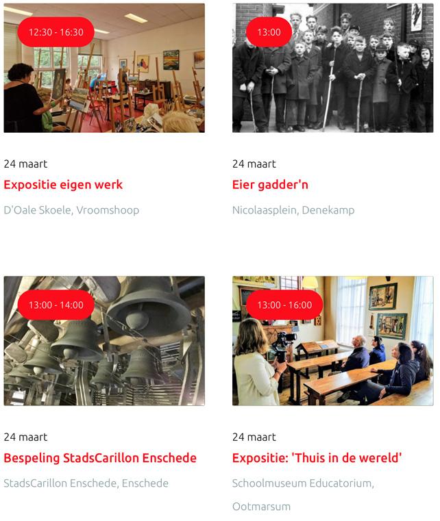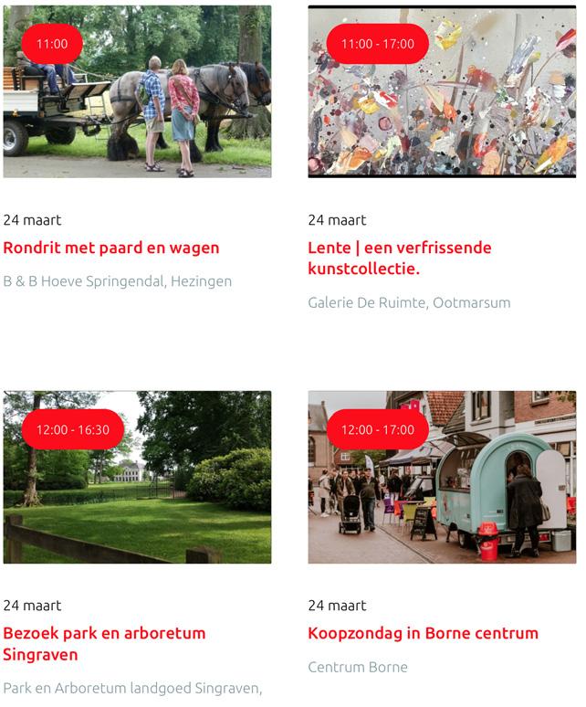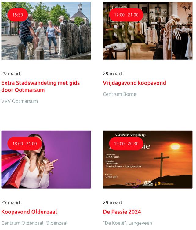 Voor een actueel overzicht kijk op: www.visittwente.nl/uitagenda of www.uittwente.nl. Evenementen en activiteiten aanmelden kan via de plaatselijke VVV/Tourist Info en redactie@twentejournaal.nl