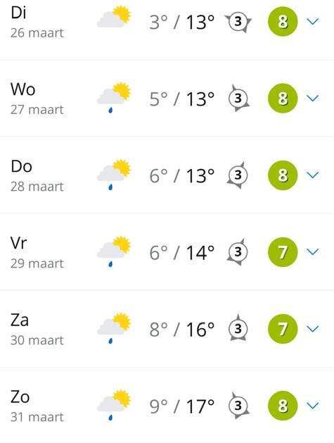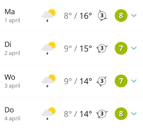 Al in de vroege ochtend kunnen verspreid over het land enkele buien ontstaan en dat worden er daarna meer. Vooral in de middag is het een komen en gaan van buien, soms ook met wat hagel of een enkele klap onweer. Tussendoor zijn er ook perioden met zon en kunnen we genieten van mooie wolkenluchten, soms met een regenboog. Het wordt 8 tot 10 graden en daarmee is het iets kouder dan normaal. Voor het gevoel is het nog kouder. Daarbij daalt de temperatuur tijdens buien naar een graad of 4 en dan voelt de wind koud aan. In de avond neemt de buiigheid iets af, maar echt droog wordt het niet.