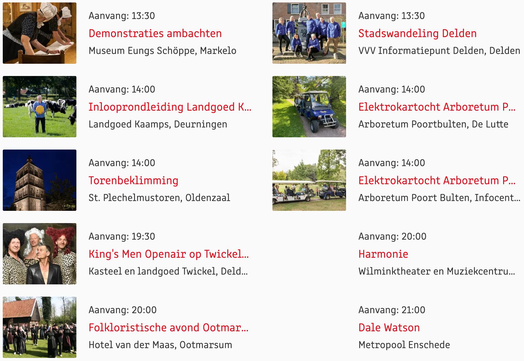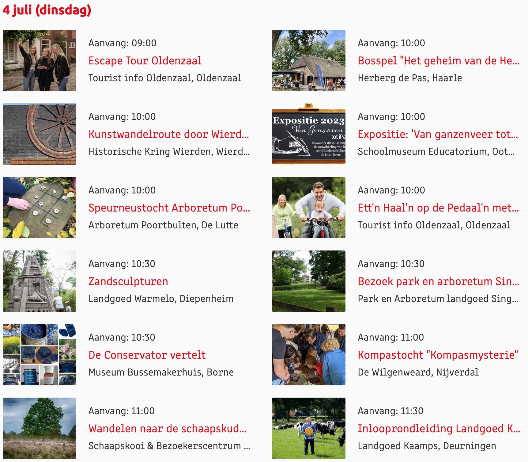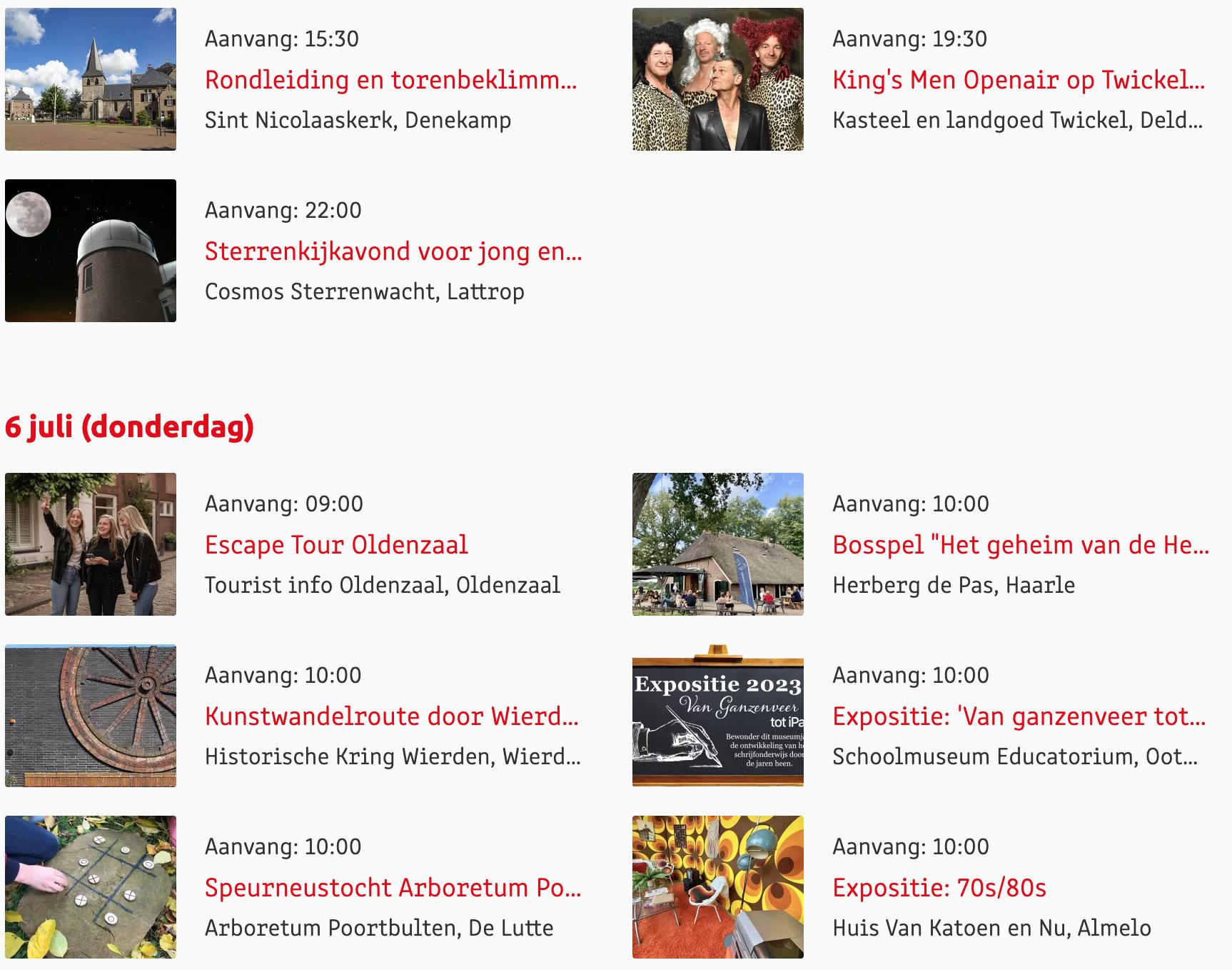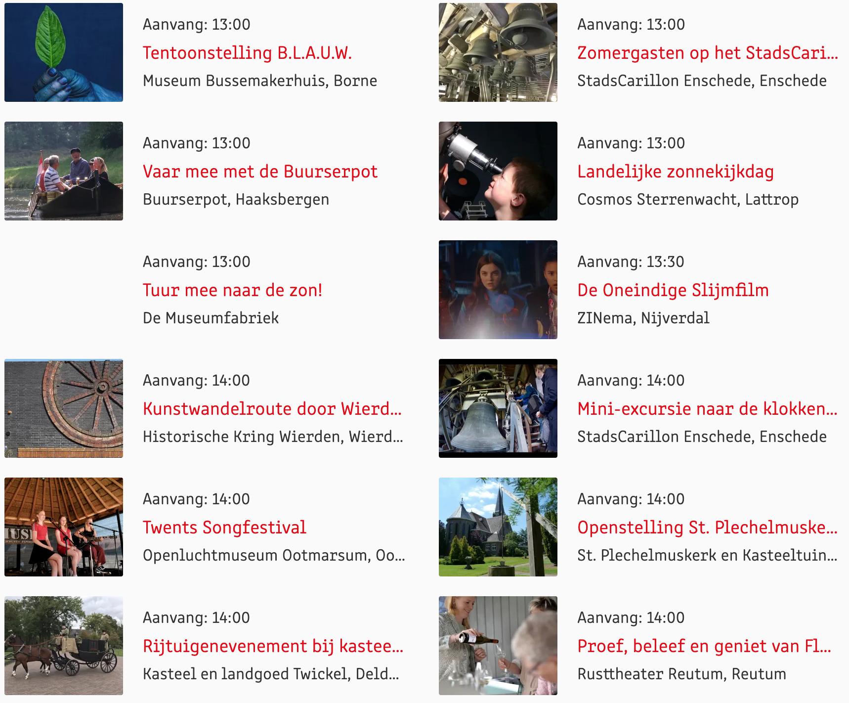 Voor een actueel overzicht kijk op: www.visittwente.nl/uitagenda of www.uittwente.nl. Evenementen en activiteiten aanmelden kan via de plaatselijke VVV/Tourist Info en redactie@twentejournaal.nl
