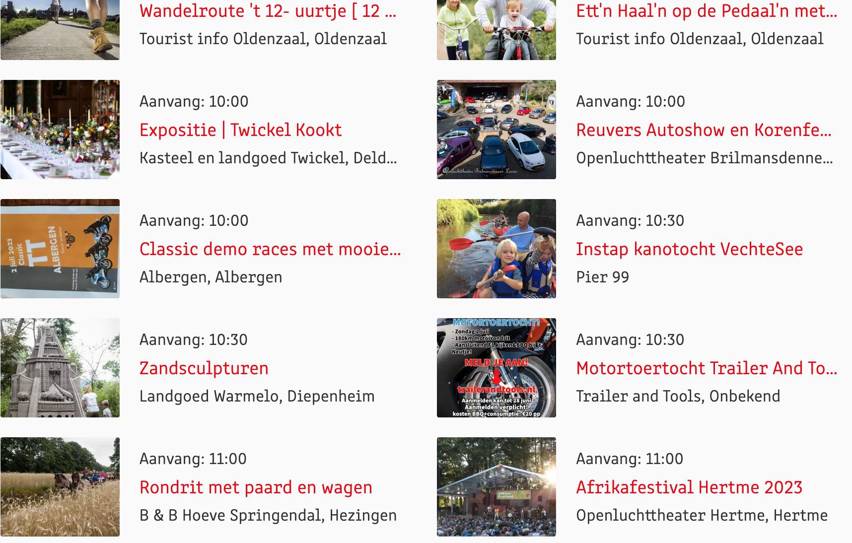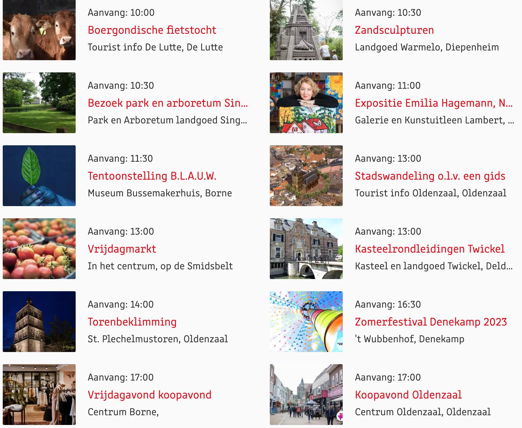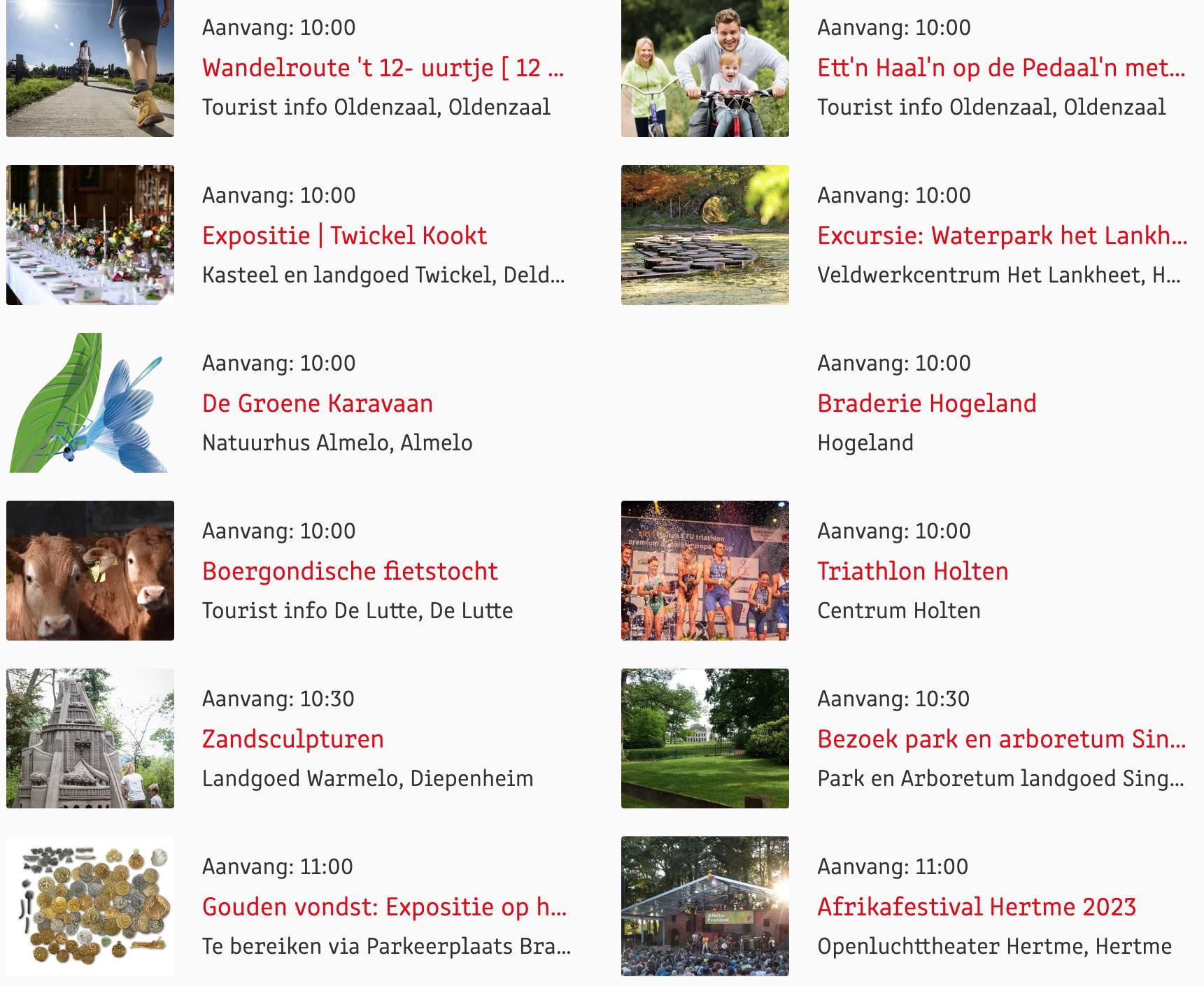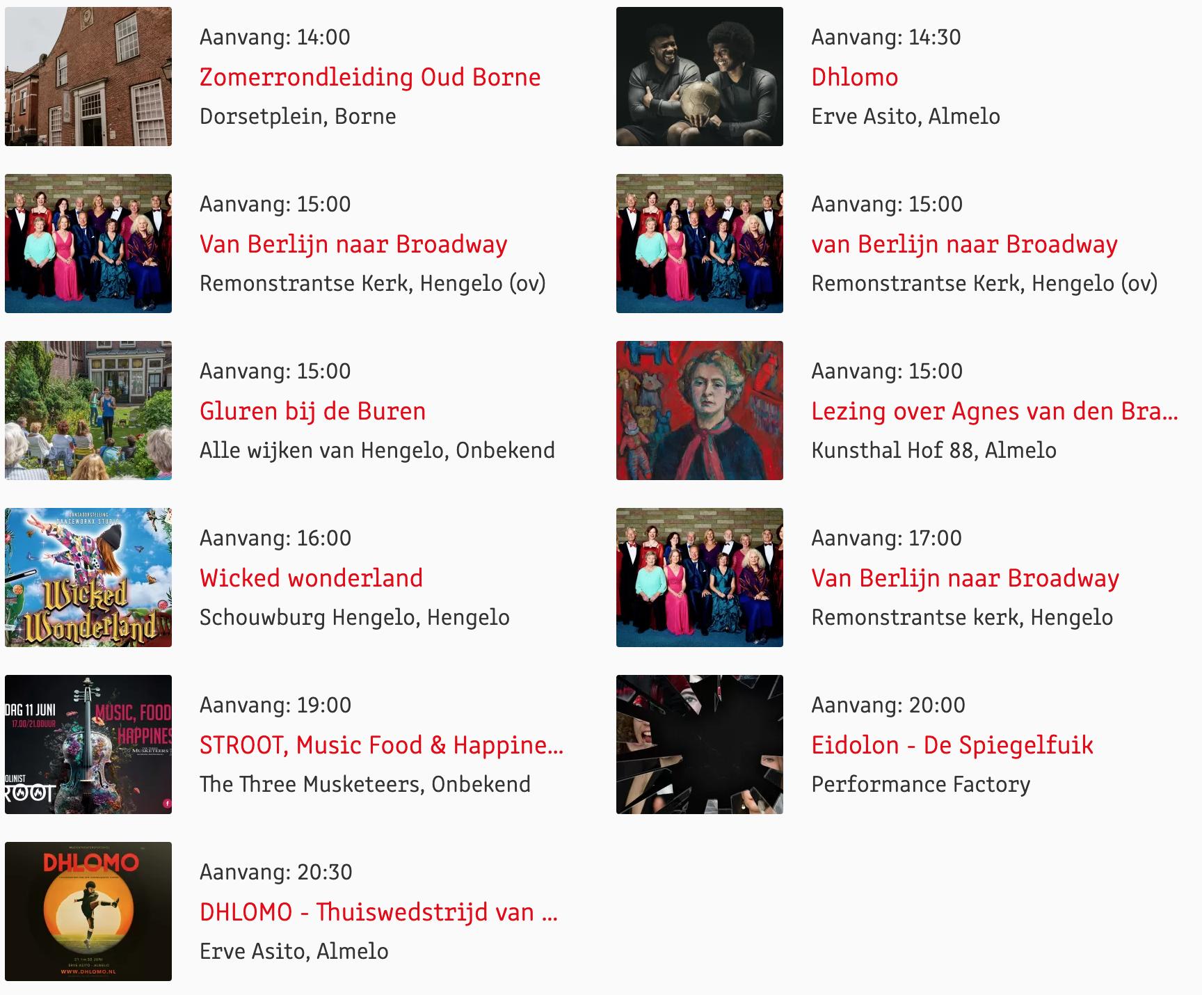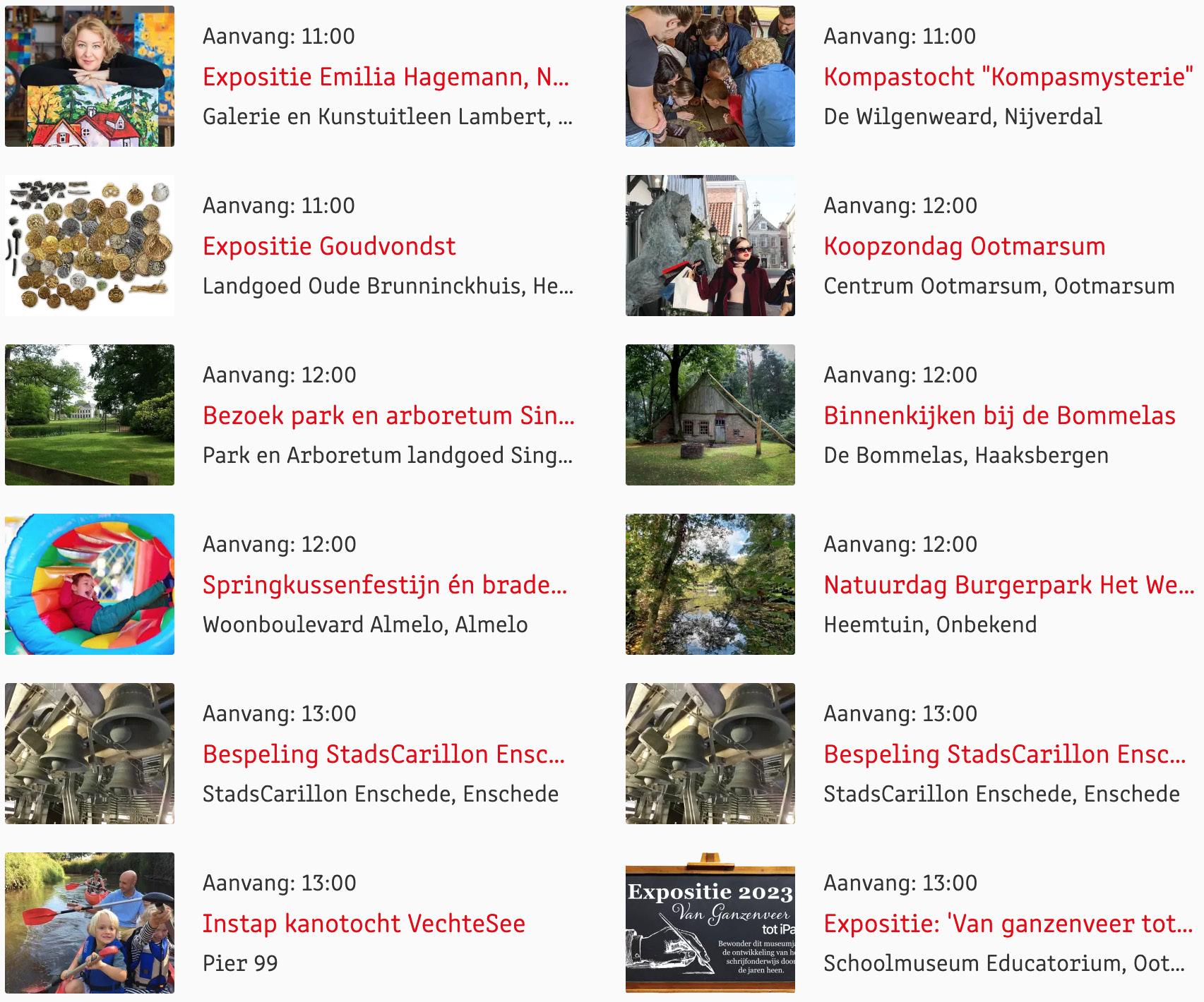 Voor een actueel overzicht kijk op: www.visittwente.nl/uitagenda of www.uittwente.nl. Evenementen en activiteiten aanmelden kan via de plaatselijke VVV/Tourist Info en redactie@twentejournaal.nl