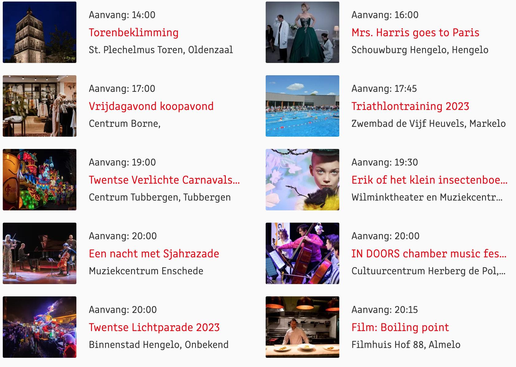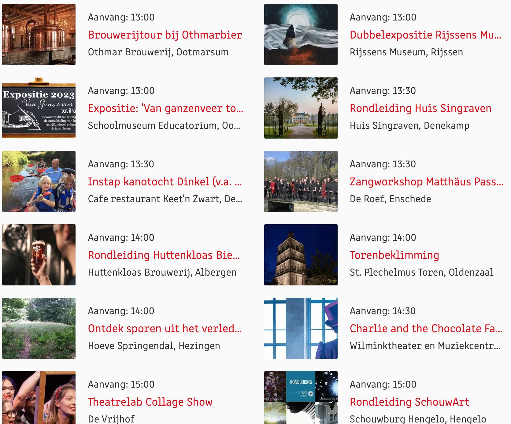 Voor een actueel overzicht kijk op: www.visittwente.nl/uitagenda of www.uittwente.nl. Evenementen en activiteiten aanmelden kan via de plaatselijke VVV/Tourist Info en redactie@twentejournaal.nl