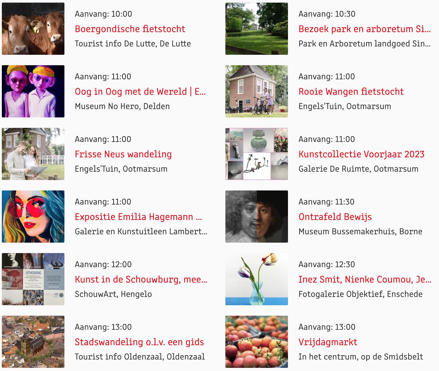 Voor een actueel overzicht kijk op: www.visittwente.nl/uitagenda of www.uittwente.nl. Evenementen en activiteiten aanmelden kan via de plaatselijke VVV/Tourist Info en redactie@twentejournaal.nl