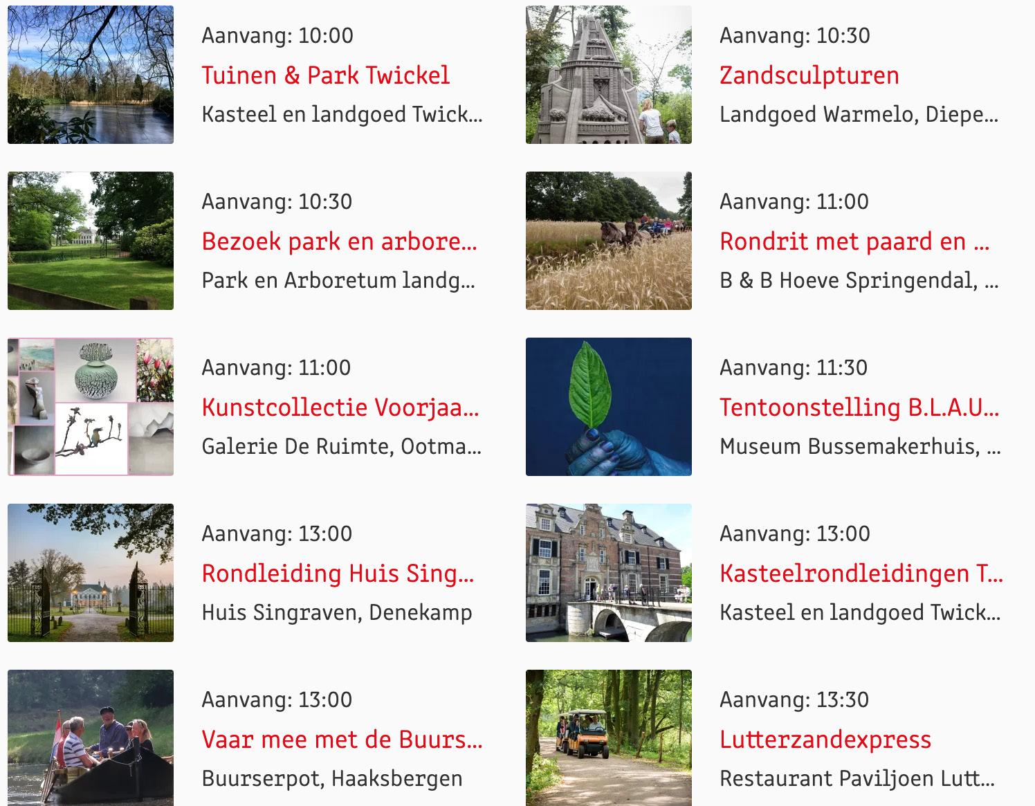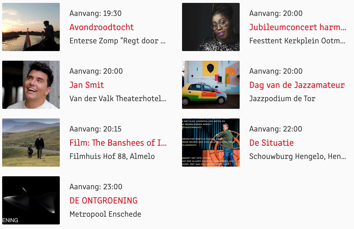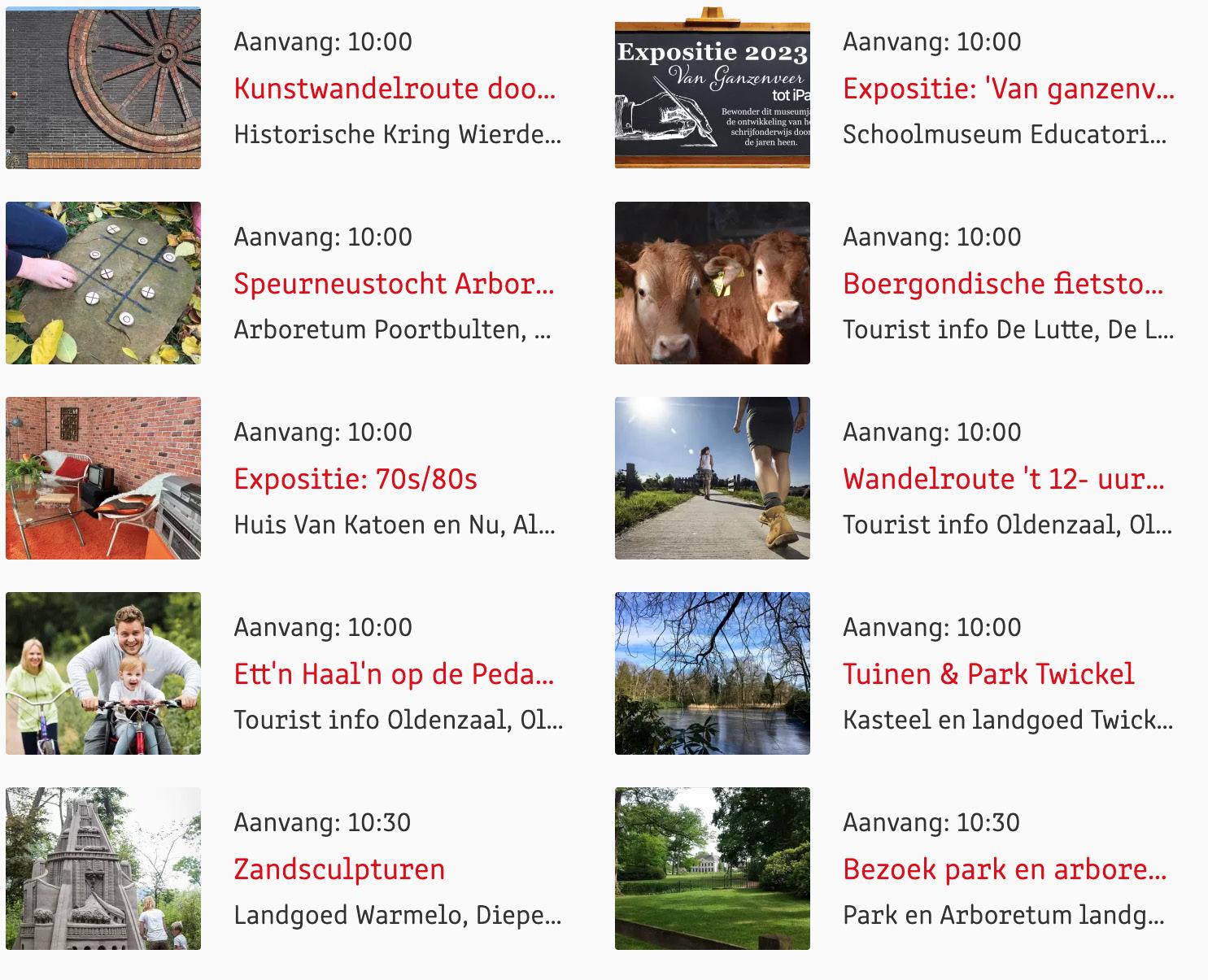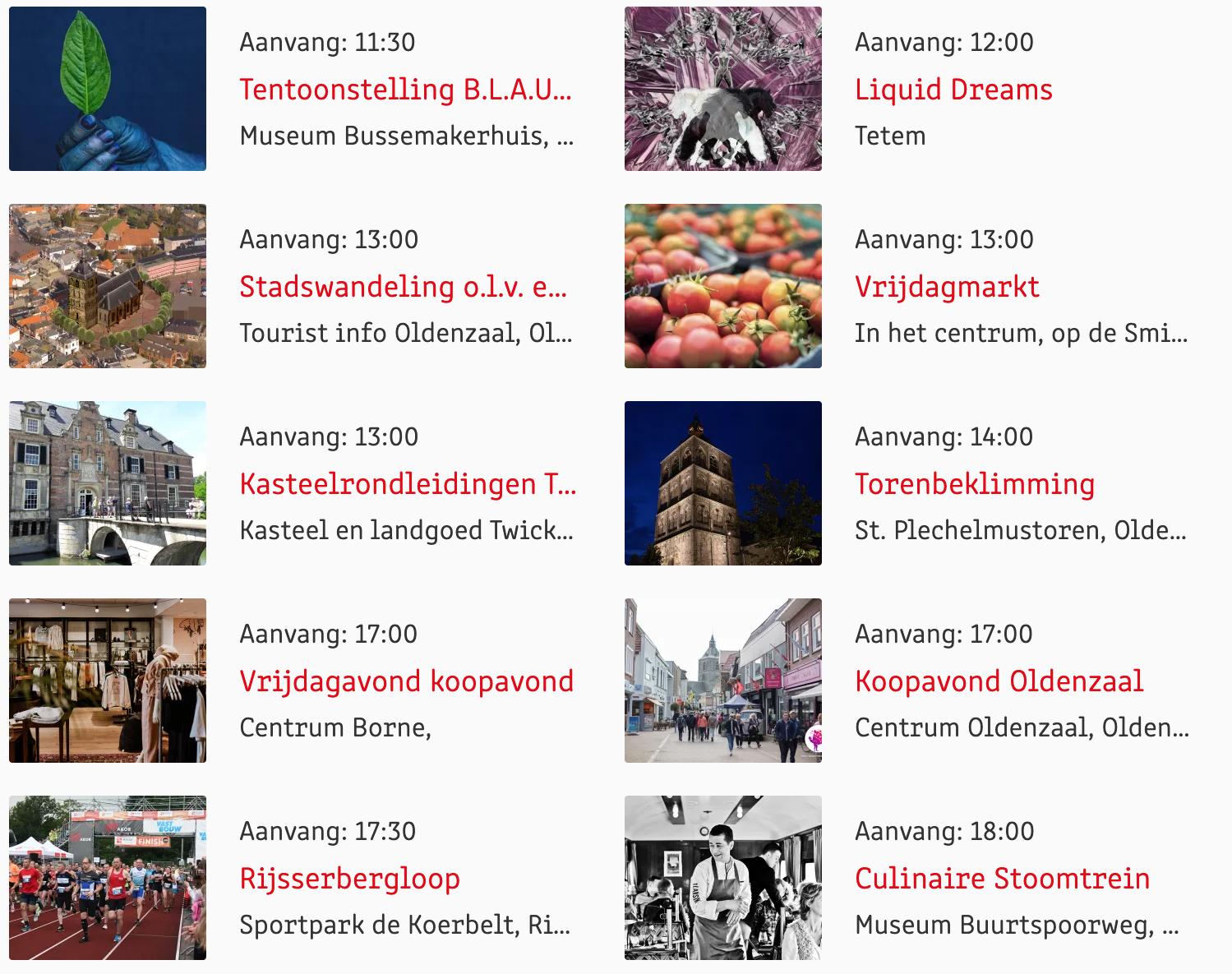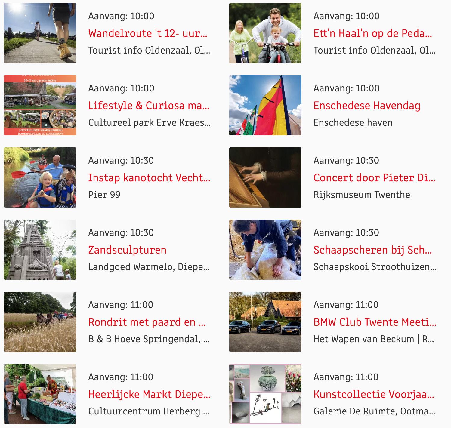 Voor een actueel overzicht kijk op: www.visittwente.nl/uitagenda of www.uittwente.nl. Evenementen en activiteiten aanmelden kan via de plaatselijke VVV/Tourist Info en redactie@twentejournaal.nl