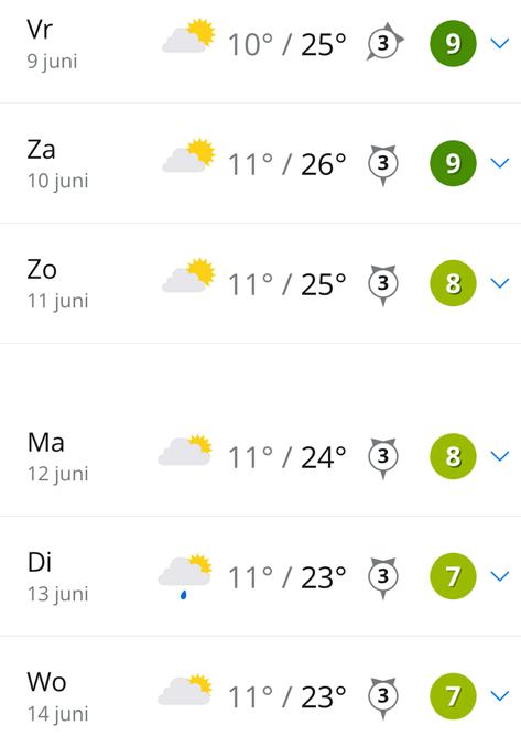 Zaterdag: zonovergoten zaterdag Zaterdag belooft een prachtige dag te worden voor buitenactiviteiten met veel ruimte voor de zon. Bij een matige noordoostenwind komen de maxima nog een aantal graden hoger uit dan vrijdag met 21 tot 24 graden. Het blijft daarbij de hele dag droog. Houd wel rekening met de sterke zon, want met zonkracht 6 kan je huid al binnen 15 tot 30 minuten verbranden.