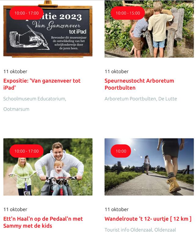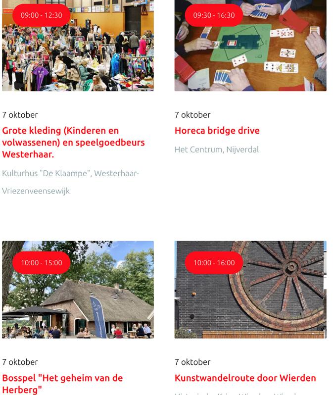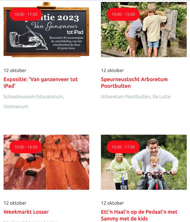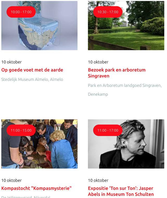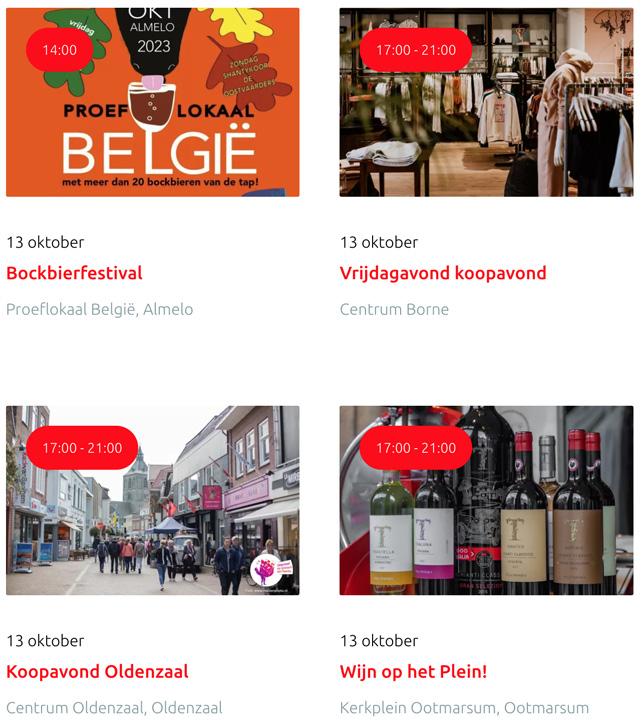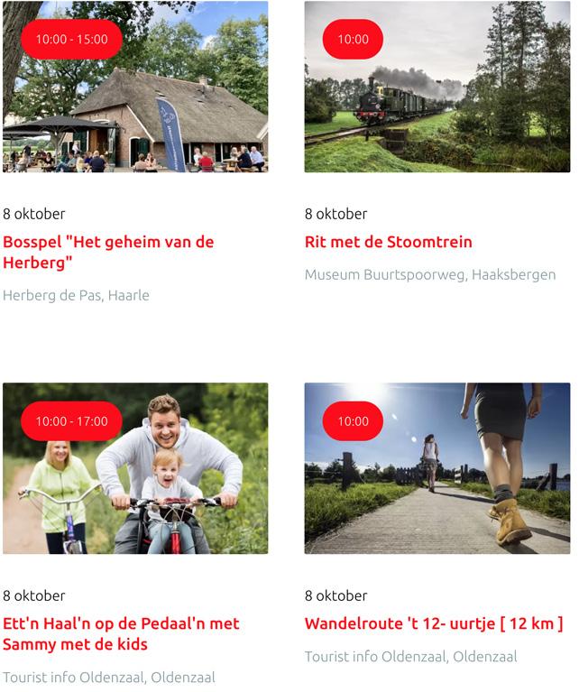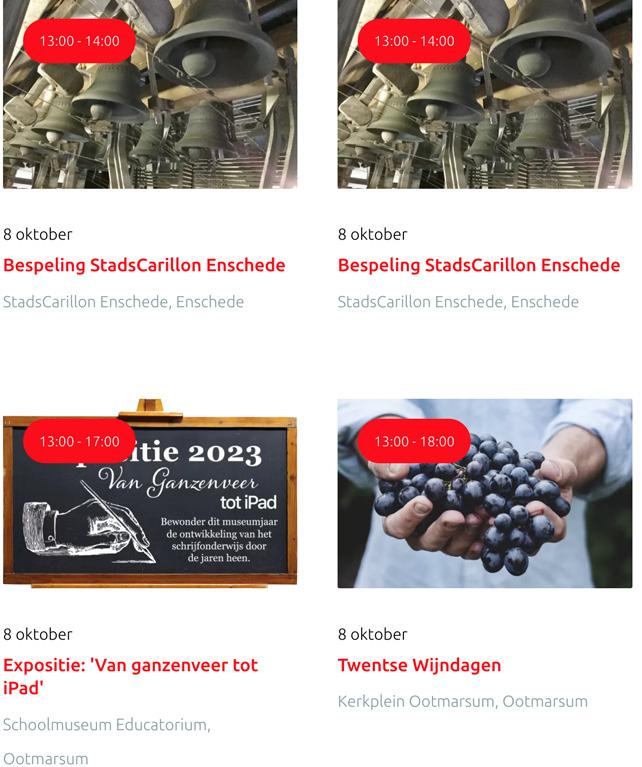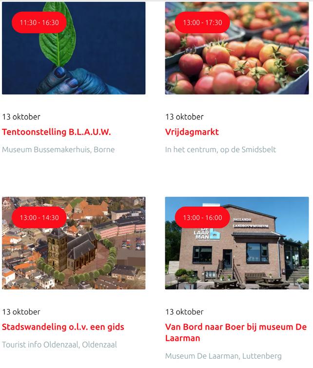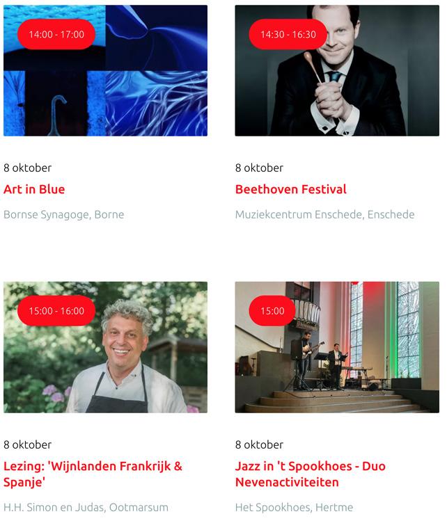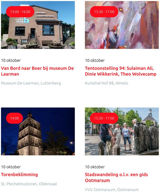 Voor een actueel overzicht kijk op: www.visittwente.nl/uitagenda of www.uittwente.nl. Evenementen en activiteiten aanmelden kan via de plaatselijke VVV/Tourist Info en redactie@twentejournaal.nl