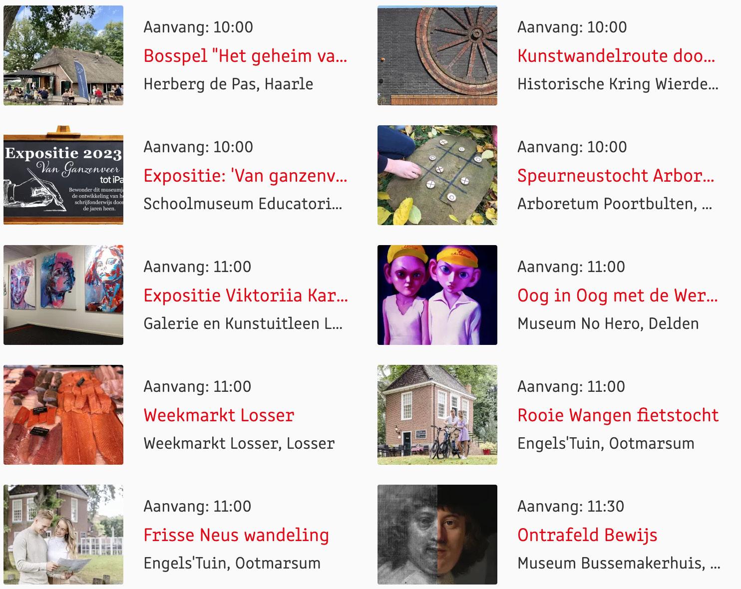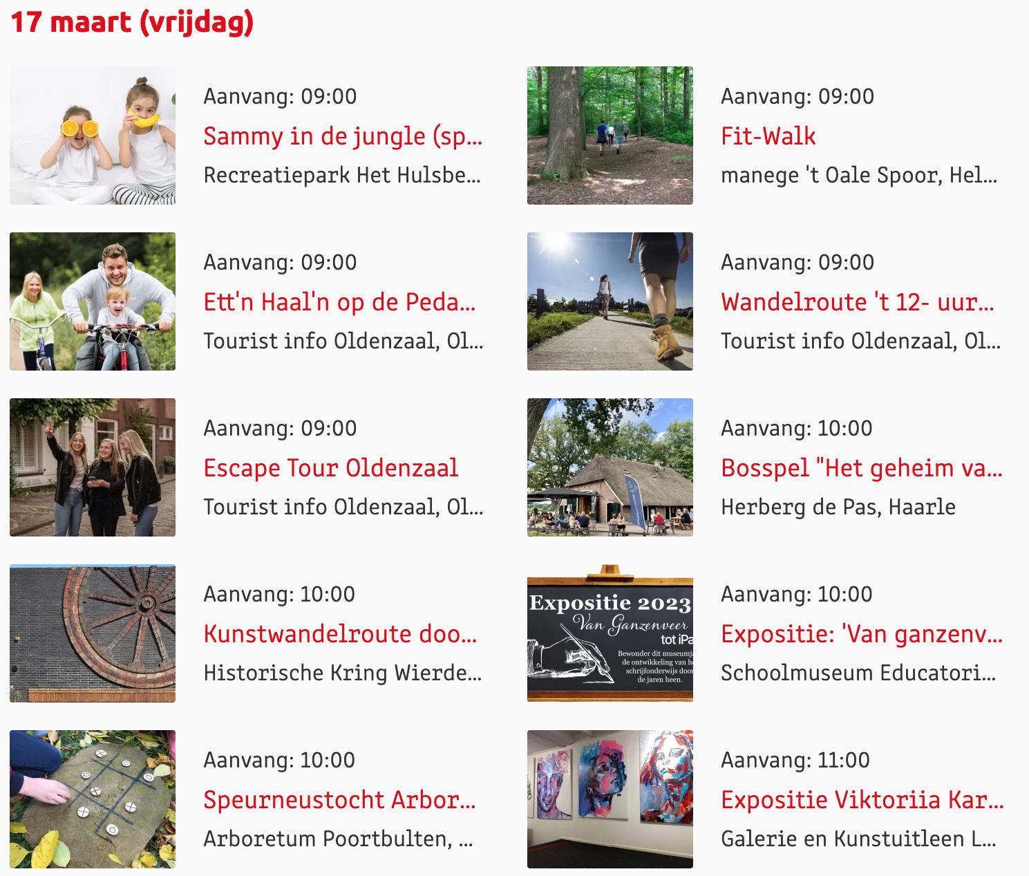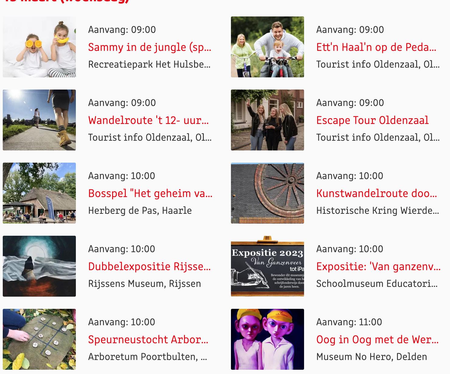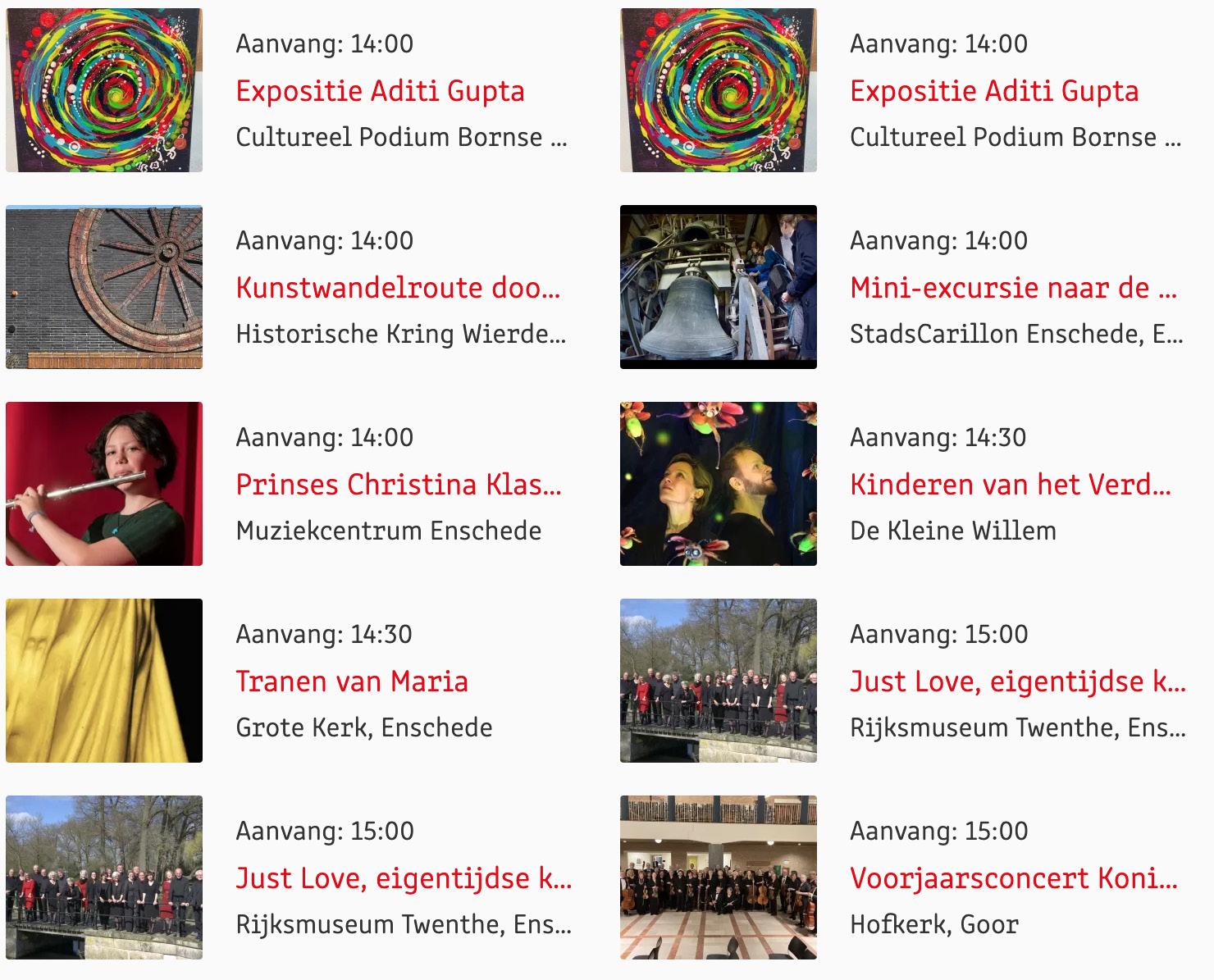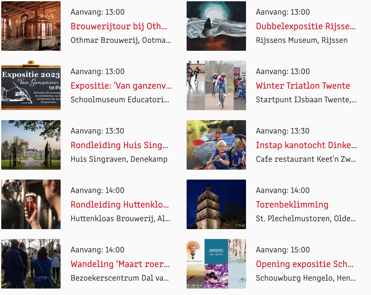 Voor een actueel overzicht kijk op: www.visittwente.nl/uitagenda of www.uittwente.nl. Evenementen en activiteiten aanmelden kan via de plaatselijke VVV/Tourist Info en redactie@twentejournaal.nl