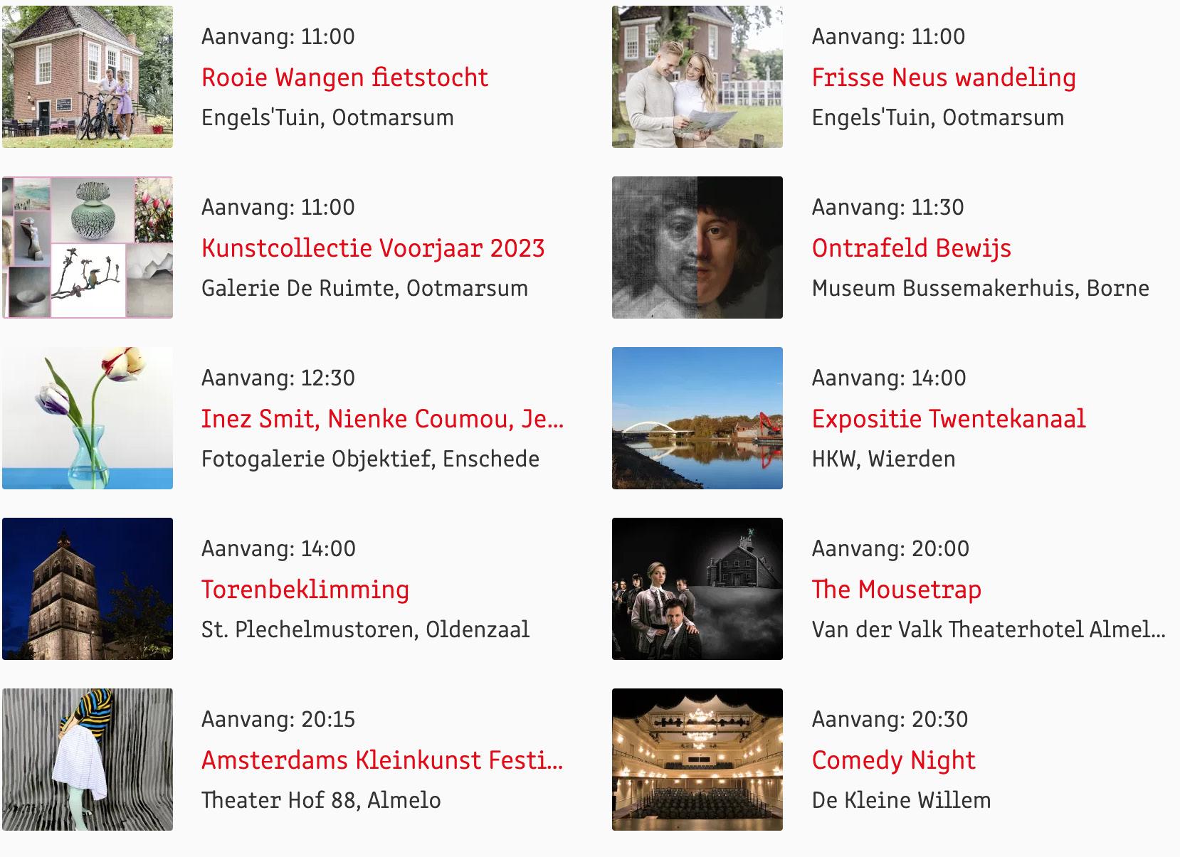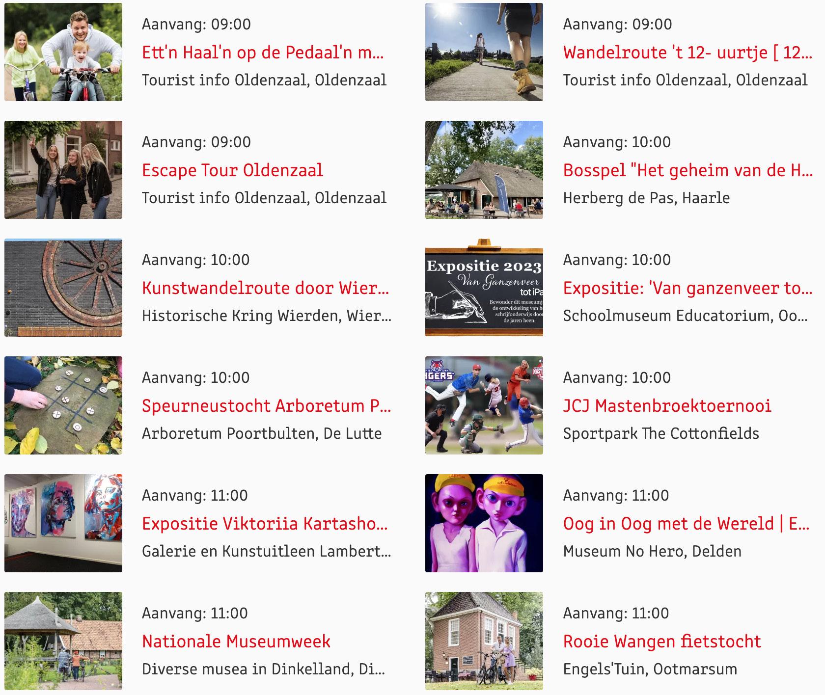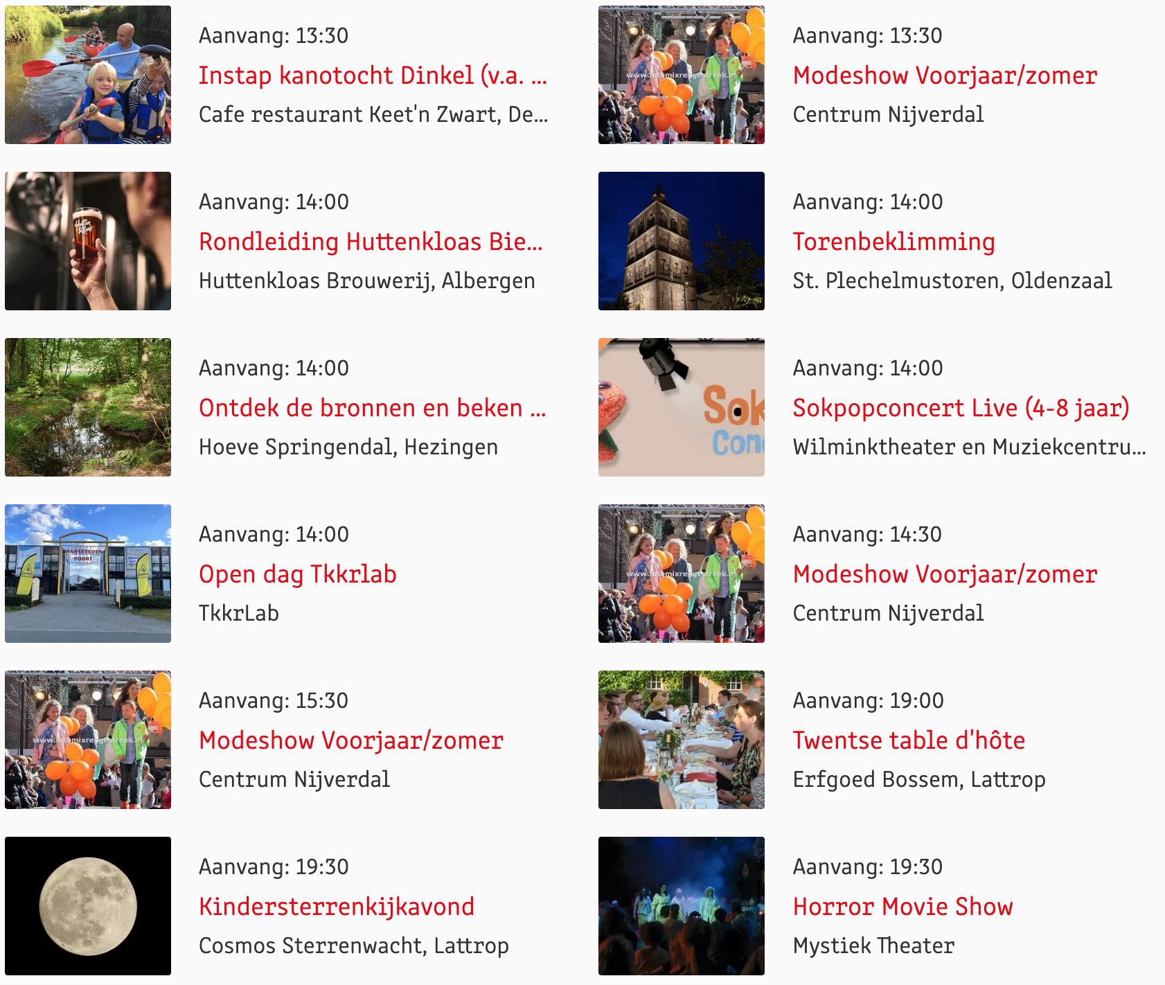 Voor een actueel overzicht kijk op: www.visittwente.nl/uitagenda of www.uittwente.nl. Evenementen en activiteiten aanmelden kan via de plaatselijke VVV/Tourist Info en redactie@twentejournaal.nl