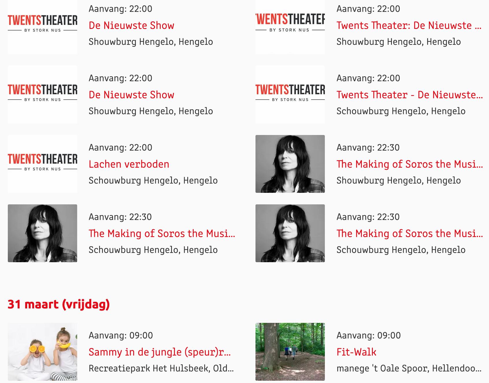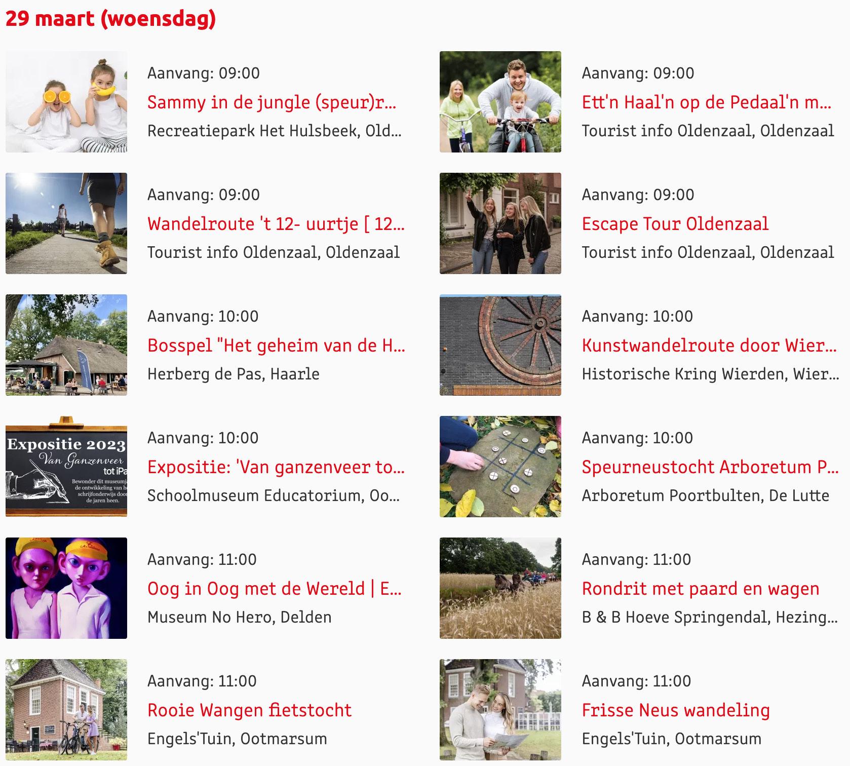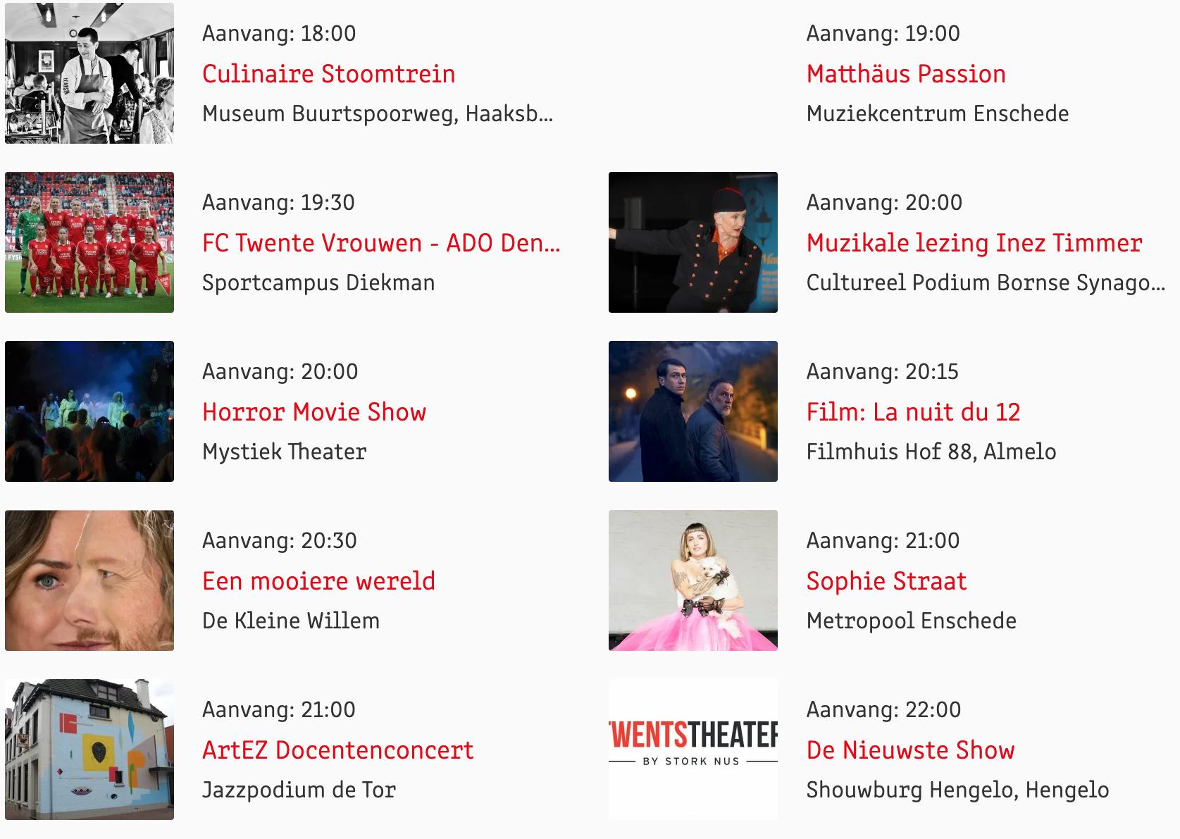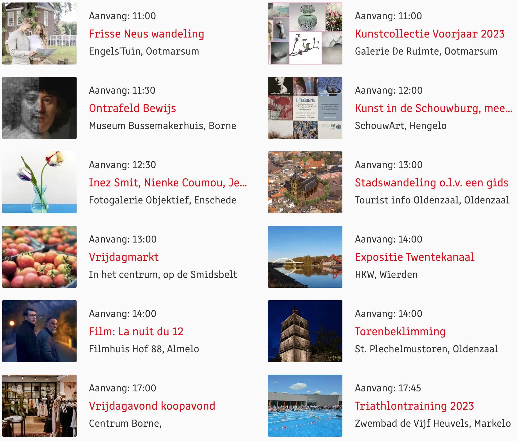 Voor een actueel overzicht kijk op: www.visittwente.nl/uitagenda of www.uittwente.nl. Evenementen en activiteiten aanmelden kan via de plaatselijke VVV/Tourist Info en redactie@twentejournaal.nl