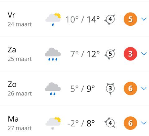 De dagen daarna is het wisselvallig met dagelijks kans op regen. Dinsdag zijn er overdag ook droge perioden en wordt het 8 tot 10 graden. Daarna stijgt de middagtemperatuur naar 9 tot 14 graden en zal het vaker regenen. De wind komt dan uit het zuidwesten tot westen.
